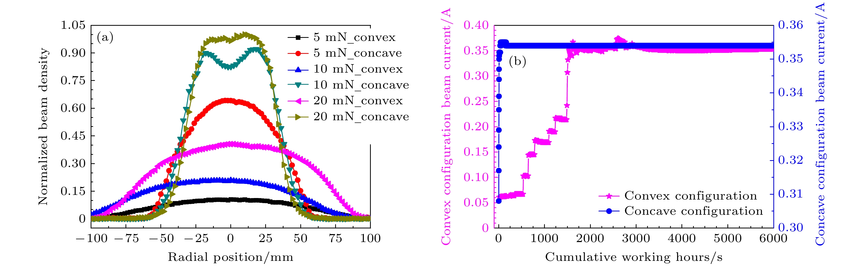 Fig. 5. Comparison of extracted beam current density distribution and cold-start characteristics for two different surface forms of the ion optics system: (a) Comparison of extracted beam current density distribution; (b) comparison of extracted beam current characteristic curves at –90 ℃ low-temperature environment.