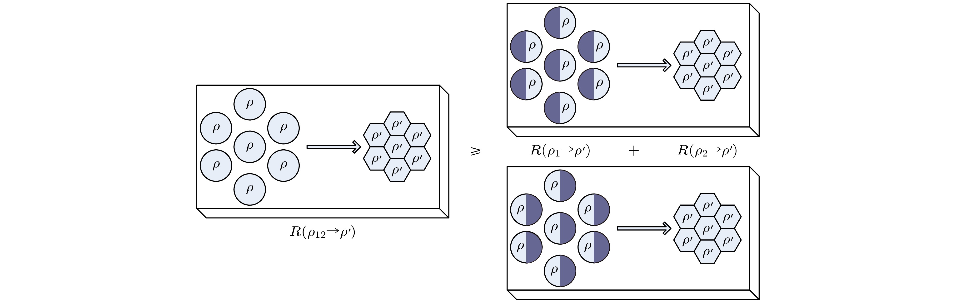 Fig. 1. In any multiple quantum resource theory, the bipartite asymptomatic transformation rates obey monogamy relations. These left gray and right white states in the top-right image are quantum states in the first subsystem, and these left white and right gray states in the below-right image are quantum states in the second subsystem.