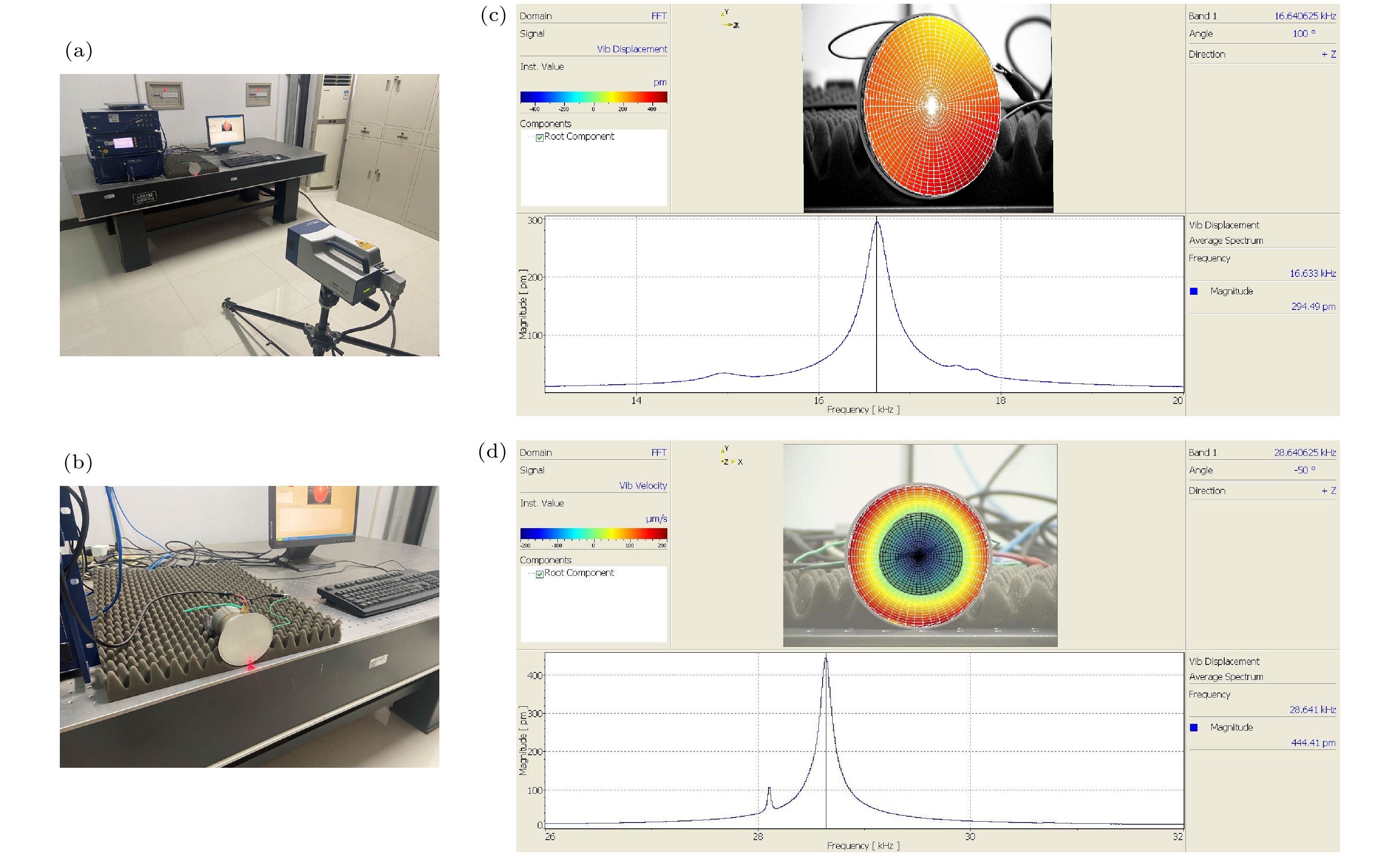 图 15 换能器的辐射面位移振幅分布的实验测量 (a) 测试图; (b) 柱状和声学表面结构的压电超声换能器的测量结果; (c) 未优化换能器的测量结果