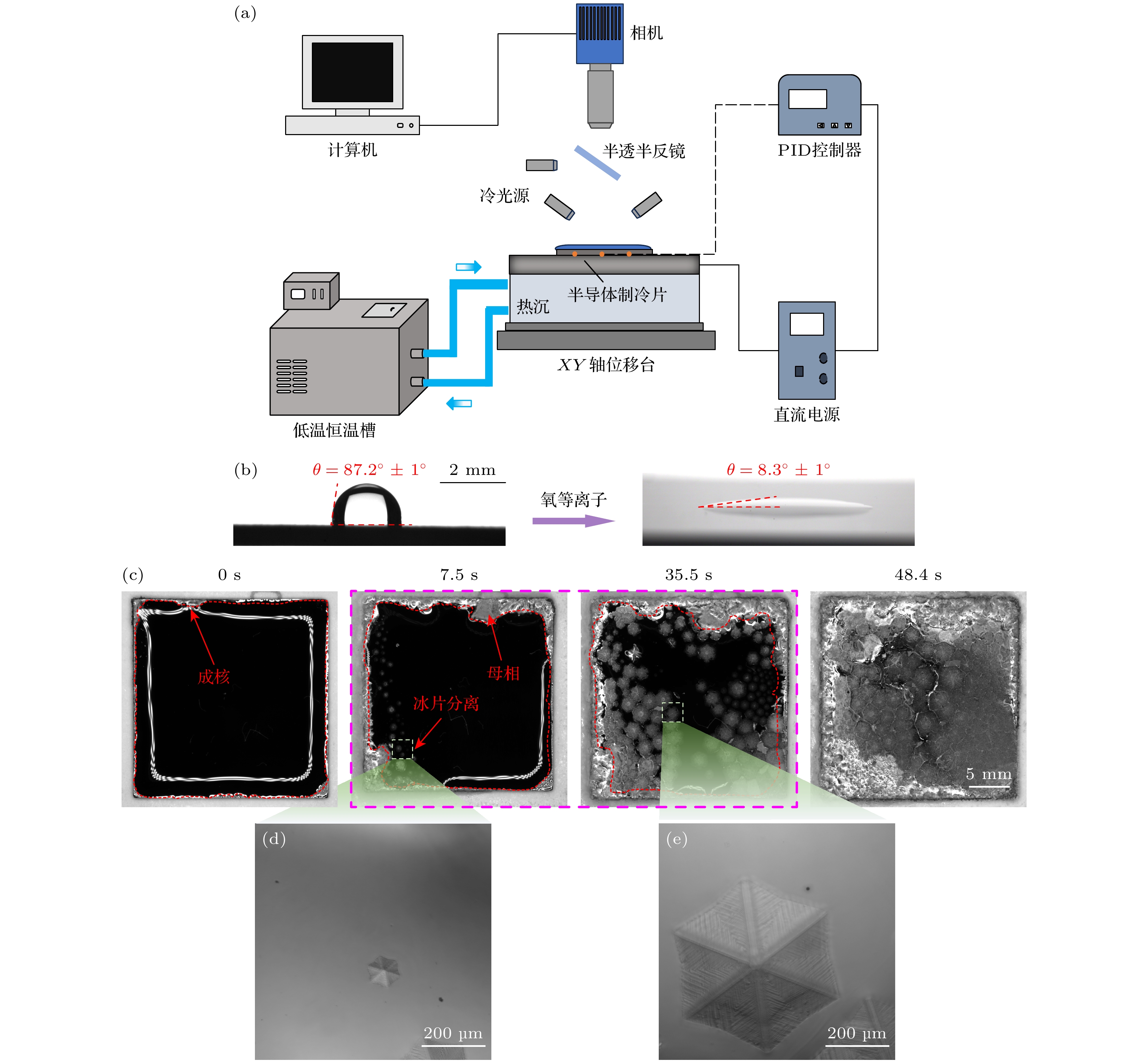 Fig. 1. (a) Schematic diagram of the experimental setup; (b) comparison of contact angles before and after plasma treatment of monocrystalline silicon wafers; (c) freezing process of isopropanol-water liquid film at $\Delta T = \left( {5.5 \pm 0.1} \right)$ ℃; (d), (e) the beginning and ending of microscopic observation of a single ice flake.