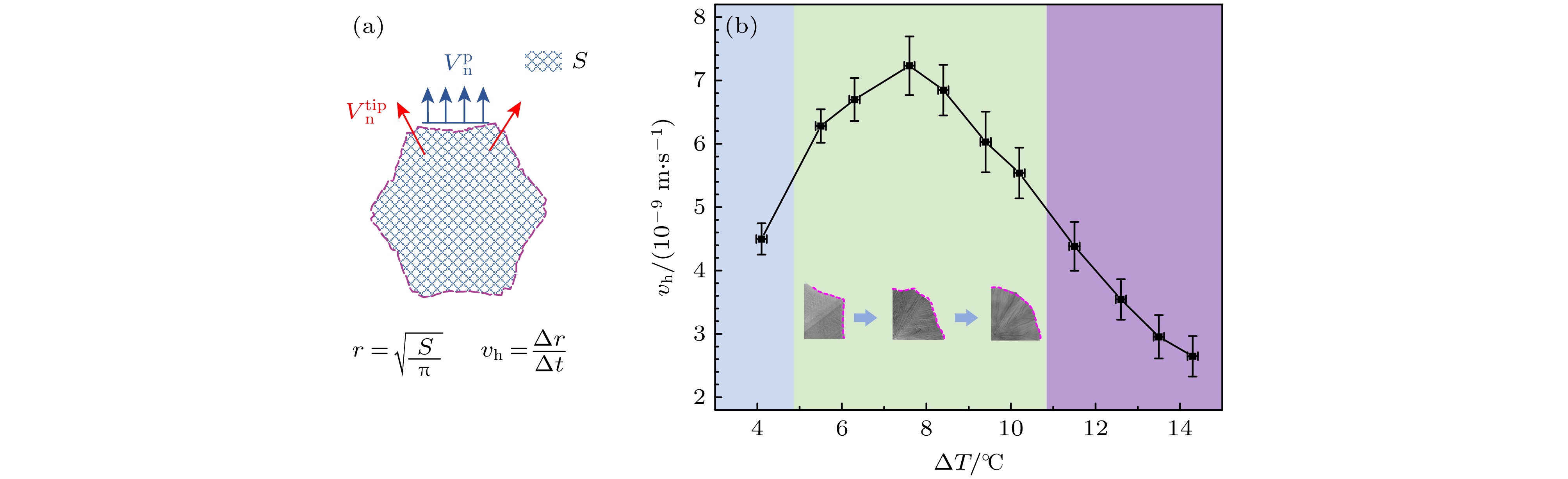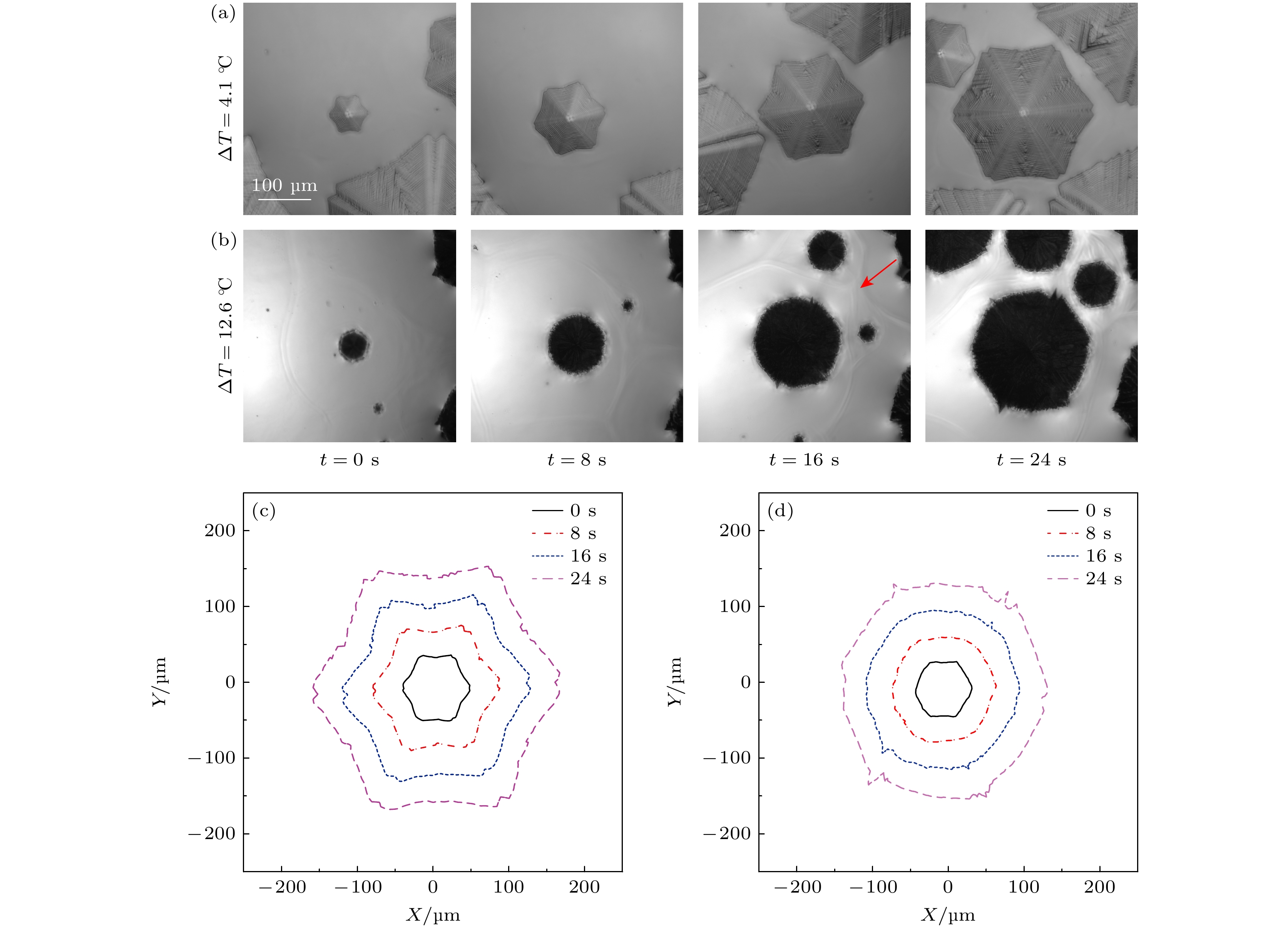 图 2 (a), (b) 不同过冷度下冰片生长动力学过程 (a) $\Delta T = \left( {4.1 \pm 0.1} \right)$ ℃; (b) $\Delta T = \left( {12.6 \pm 0.1} \right)$ ℃. (c), (d) 不同过冷度下冰片轮廓的变化 (c) $\Delta T = \left( {4.1 \pm 0.1} \right)$ ℃; (d) $\Delta T = \left( {12.6 \pm 0.1} \right)$ ℃