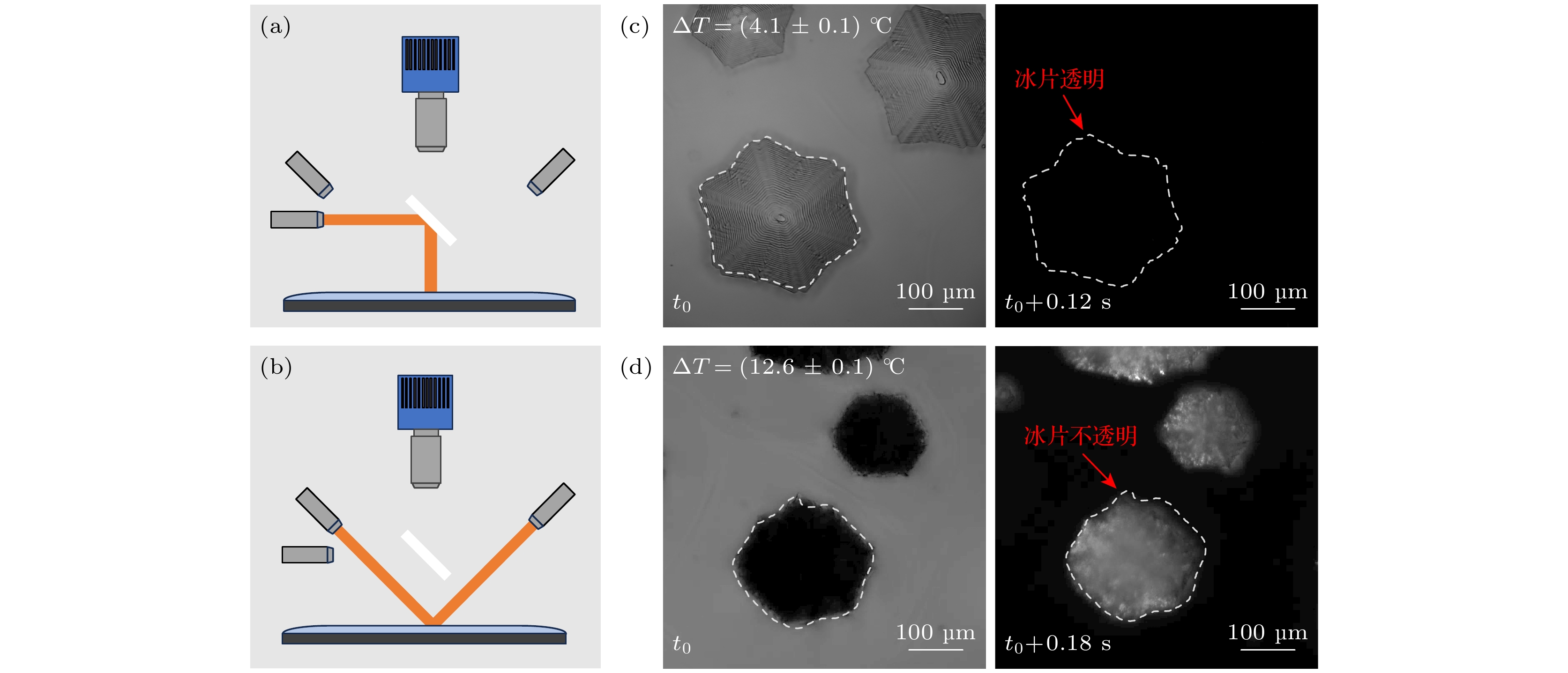 图 3 明场以及暗场观察对比 (a) 明场观察示意图; (b) 暗场观察示意图; (c) $\Delta T = \left( {4.1 \pm 0.1} \right)$ ℃暗场下无法观察到冰片, 冰片几乎透明; (d) $\Delta T = \left( {12.6 \pm 0.1} \right)$ ℃暗场下观察到冰片为白色且不透明