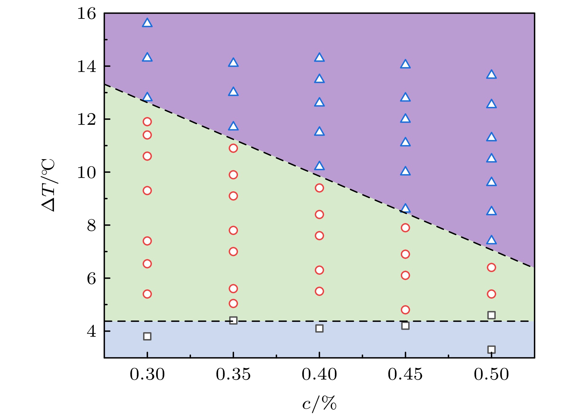图 5 物理机制示意图 (a) 低过冷度下结冰偏析与马兰戈尼流的产生; (b) 过冷度增加溶质扩散减弱, 浓度差增加马兰戈尼流增强, 冰片加速生长; (c) 大过冷度下马兰戈尼流减弱导致溶质富集