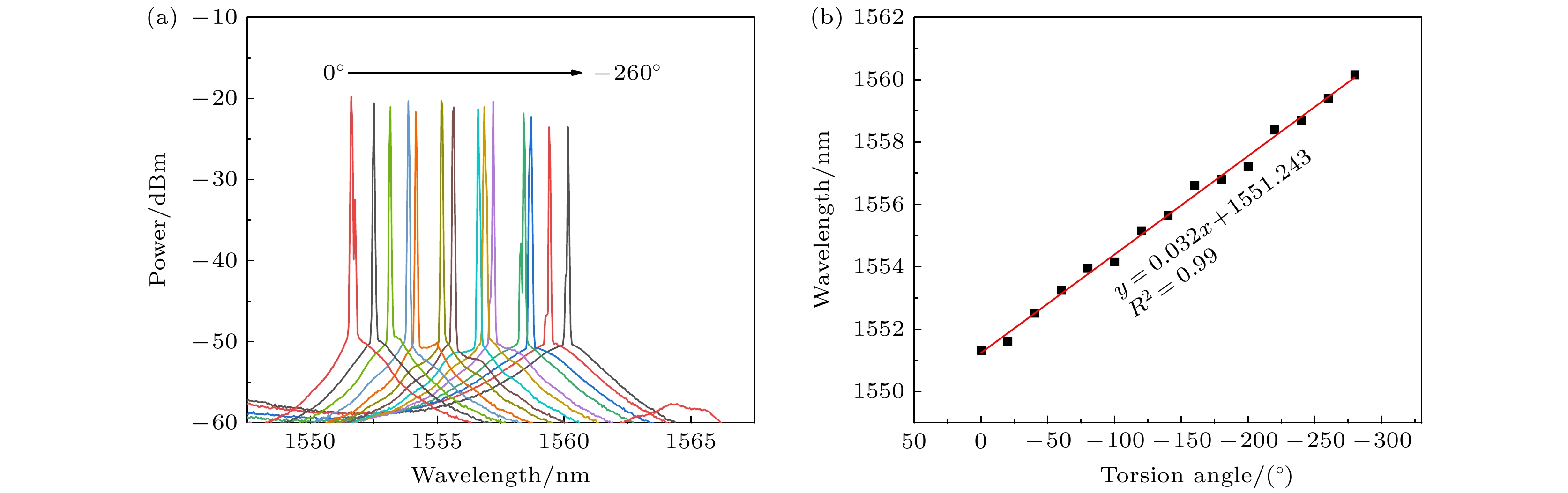 Fig. 8. The variation of the lasing wavelength with torsion angle when torsion is applied along counterclockwise direction: (a) Variation of the output laser wavelength with the torsion angle; (b) the relationship between laser wavelength and torsion angle.