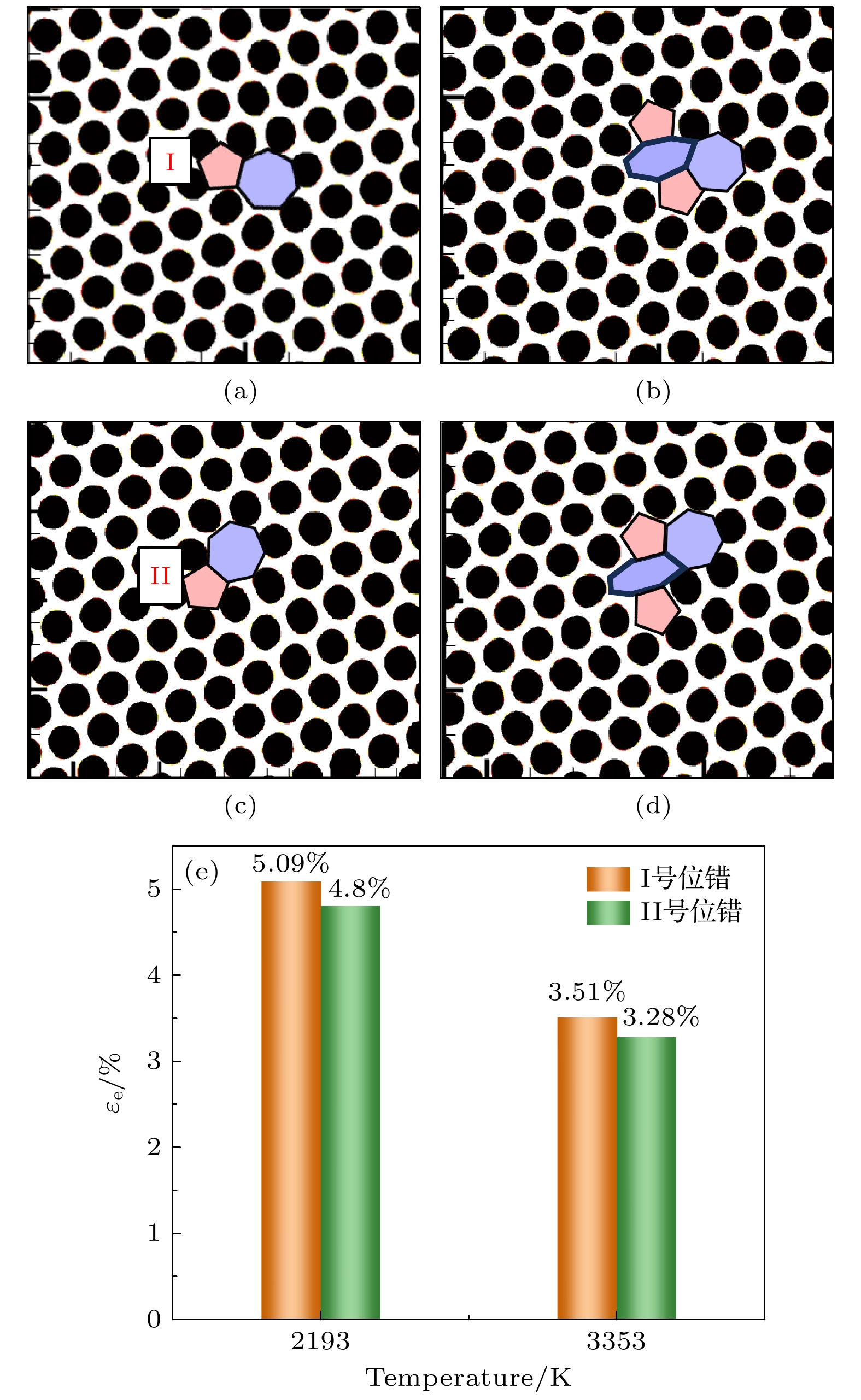 图 10 双晶体系4, 晶界环Ⅰ号位错($\alpha $ = 44.5°)在应变作用下的微观结构演化图与应变响应过程 (a)—(d) ${\varepsilon _{\text{e}}}$ = 3.51%, 3.54%, 3.60%, 4.19%; (e) 所对应的位错核心处的平均局部应变(${\bar \varepsilon _{yy}} - \bar \varepsilon _{yy}^0$)-外加应变${\varepsilon _{\text{e}}}$响应曲线