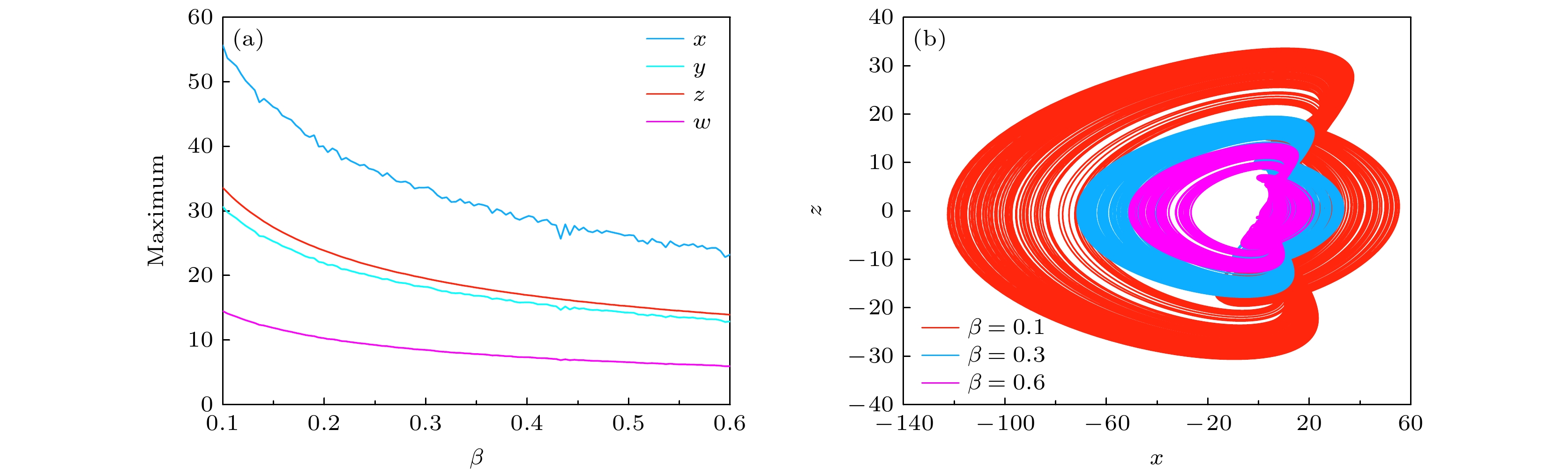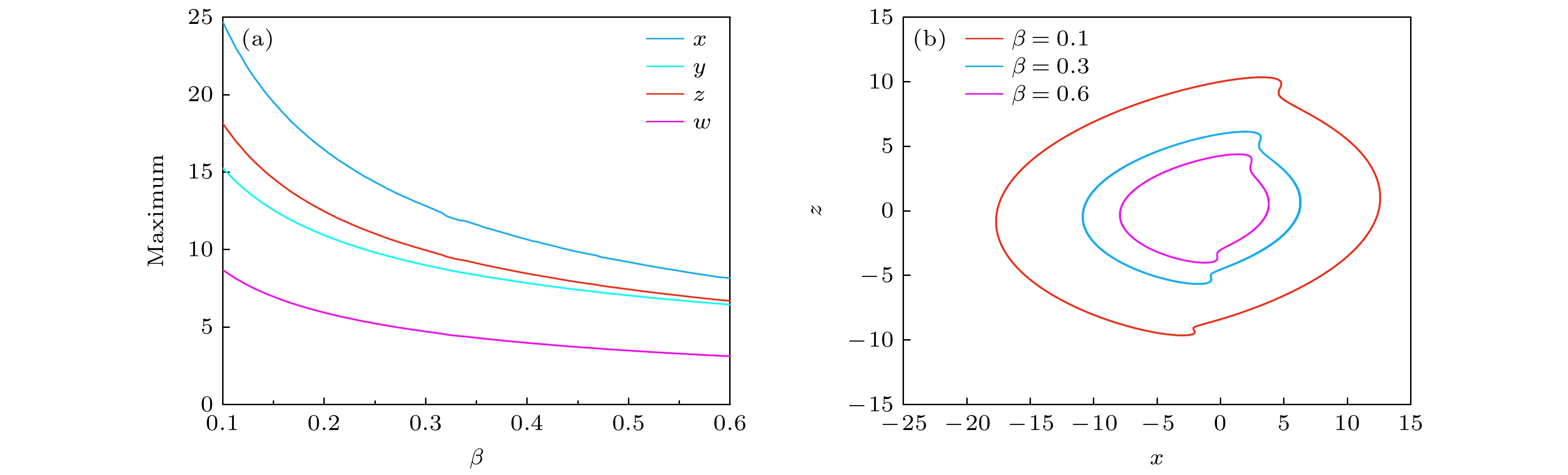图 7 系统(2)的周期信号调幅控制 (a) $ \beta \in [0.1, 0.95] $时各状态变量的最大幅值; (b) 不同$ \beta $对应的周期吸引子