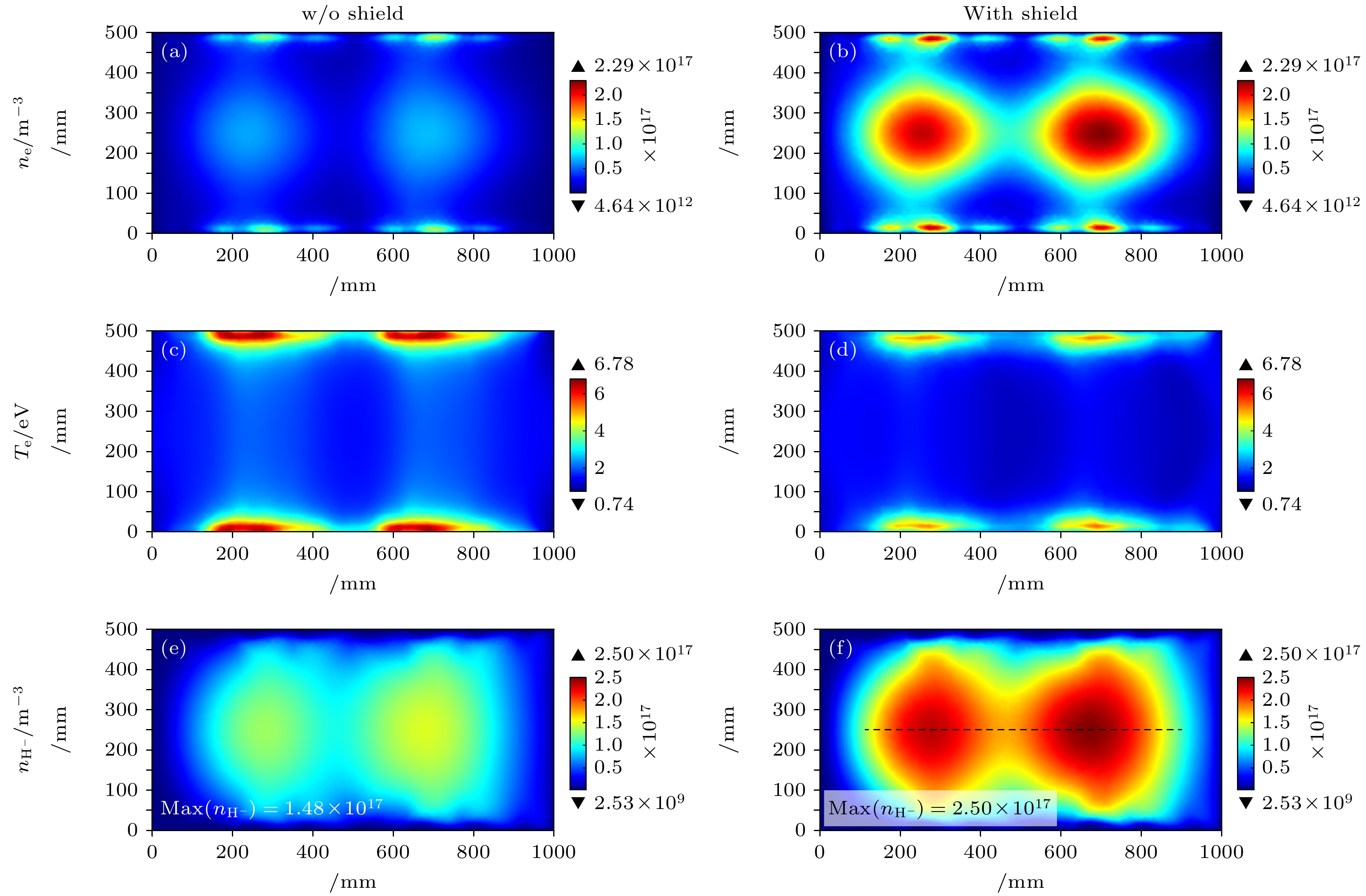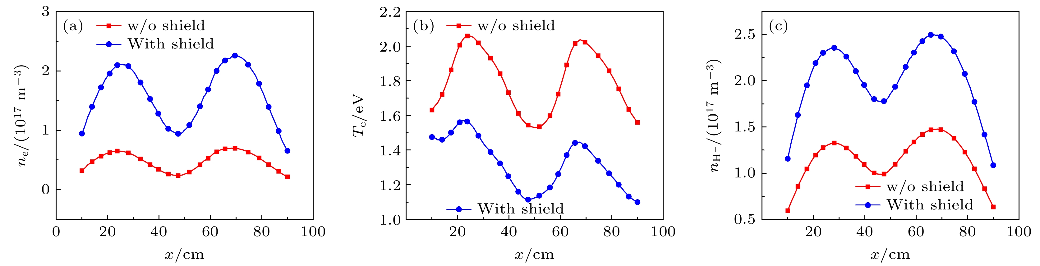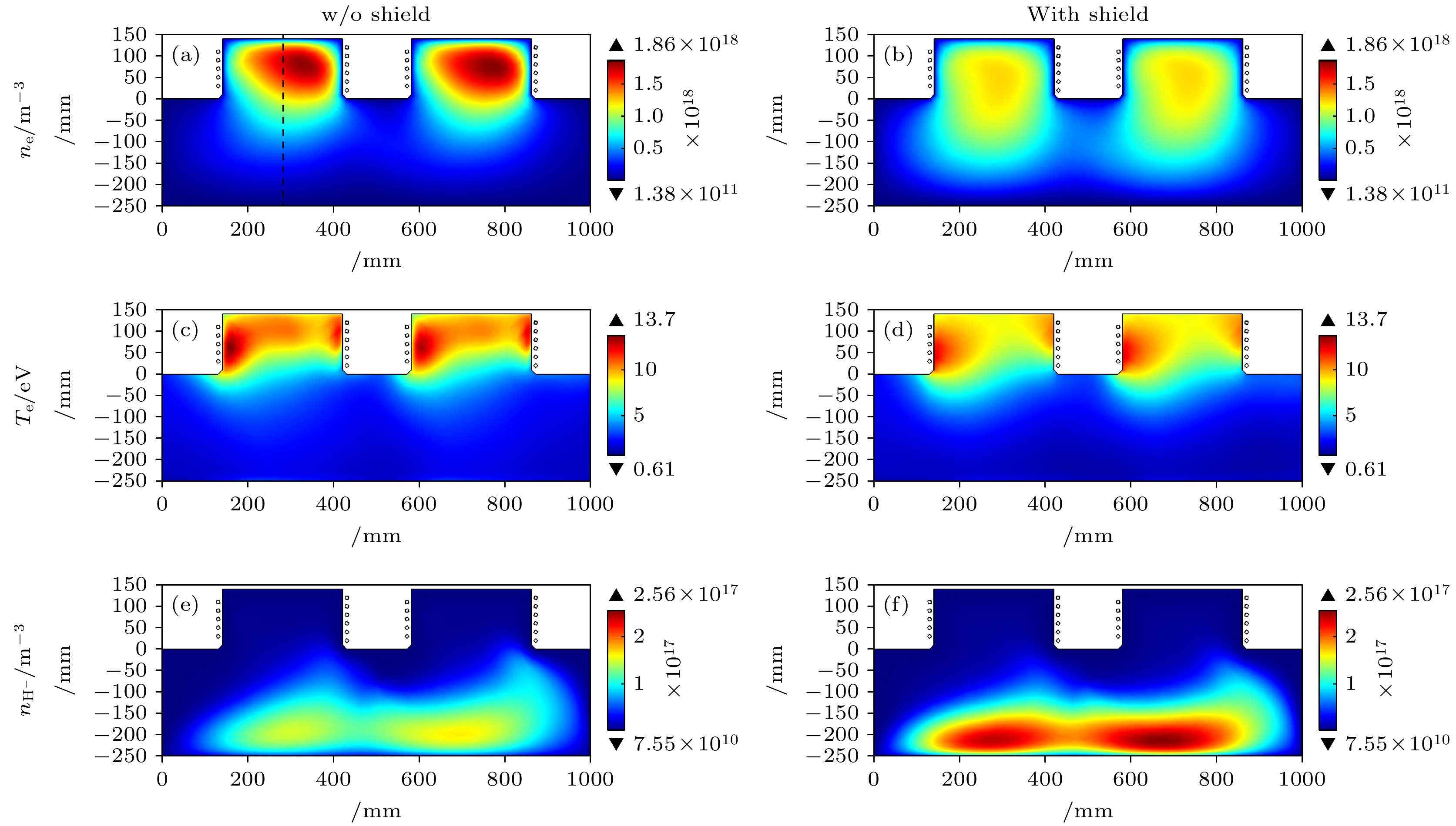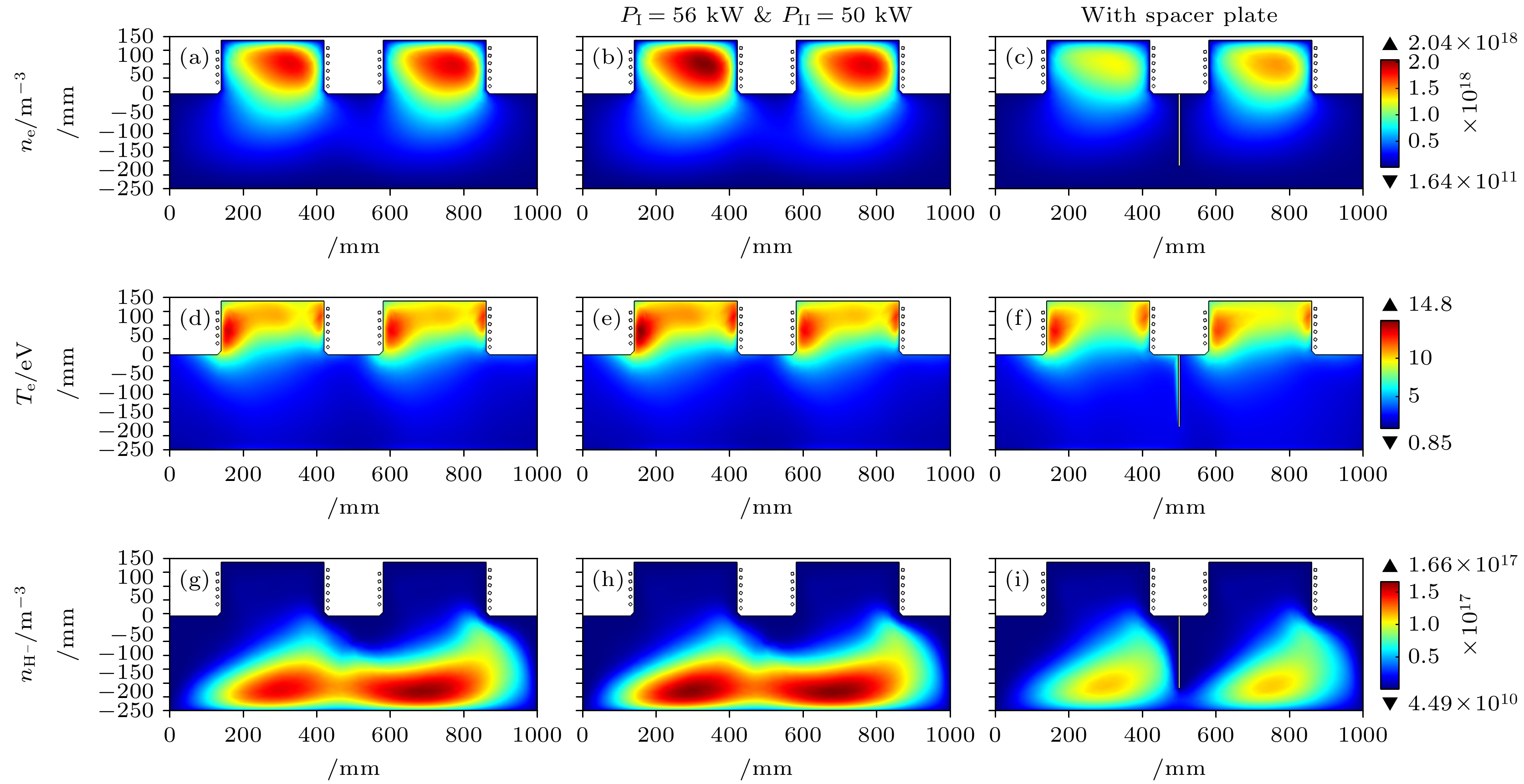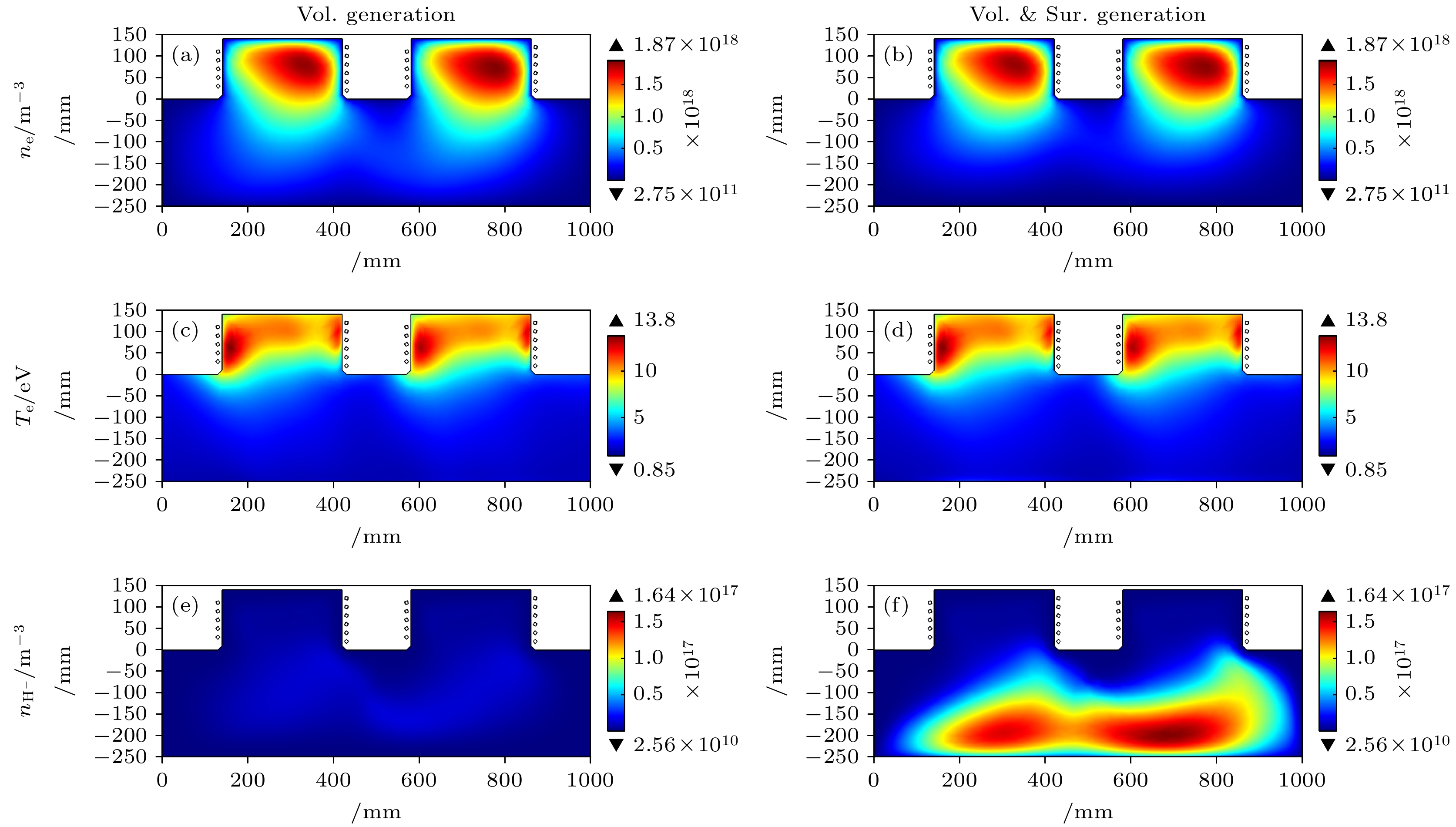 中性束注入是托卡马克装置中加热等离子体的主流辅助手段. 射频负氢离子源作为中性束注入系统的关键前端部件, 其性能直接影响中性束的质量. 目前, 提升负氢离子源性能仍是亟待深入研究的课题. 为此, 本文针对双驱动负氢离子源, 建立了一个三维流体模型, 用于模拟和优化表面产生机制下的负离子密度分布. 首先, 对比分析了体产生与表面产生两种机制下的等离子体参数, 结果表明表面产生机制获得的负离子密度比体产生机制高出1个数量级. 然而, 受过滤磁场影响, 引出区附近的负离子密度分布呈现不对称性. 为改善该不对称性, 在表面产生机制的基础上, 提出了两种优化方案: 1)在低密度侧增加射频源功率; 2)在扩散区引入隔板结构. 模拟结果显示, 两种方案均显著改善了负离子密度分布的对称性. 最后还提出了在扩散区背板添加磁屏蔽的方式来进一步优化负氢离子密度数值, 可以将扩散区下游的负离子密度提高69%.In neutral beam injection (NBI), which is a primary auxiliary heating method for tokamak plasmas, the negative hydrogen ion source (NHIS) functions as a critical front-end component governing neutral beam quality. The performance of NHIS remains a key challenge. This work presents a three-dimensional (3D) fluid model, which is developed for a double-driver NHIS to simulate and optimize surface-generated negative hydrogen ion density. A comparison of plasma parameters between the NHIS with Cs and without Cs shows that surface generation yields negative ion density one order of magnitude higher than volume generation. However, the presence of the magnetic filter field induces asymmetry in negative ion density within the extraction region. To improve this asymmetry, two approaches are proposed: (1) increasing the power of one of the drivers and (2) adding a spacer plate to the expansion region. After increasing the power of Driver I from 50 to 56 kW, the H– density asymmetry at the y = 25 cm intercept on the xy-plane (z = –22 cm) decreases from 0.04 to 0.01, and the value of H– density increases. Following the addition of a spacer plate, the H– density asymmetry further decreases to 0.004, but the value of H- density also shows a significant reduction. Finally, adding a magnetic shield to the back plate of the expansion region further optimizes H– density from 1.48×1017 m–3 to 2.50×1017 m–3, yielding a 69% increase downstream. This is because increased plasma transport into the expansion region enhances the dissociation rate of H2 molecules, thereby yielding more H atoms. The attenuation of the magnetic filter field in the driver region after adding a magnetic shield also enhances the symmetry of the H– density.