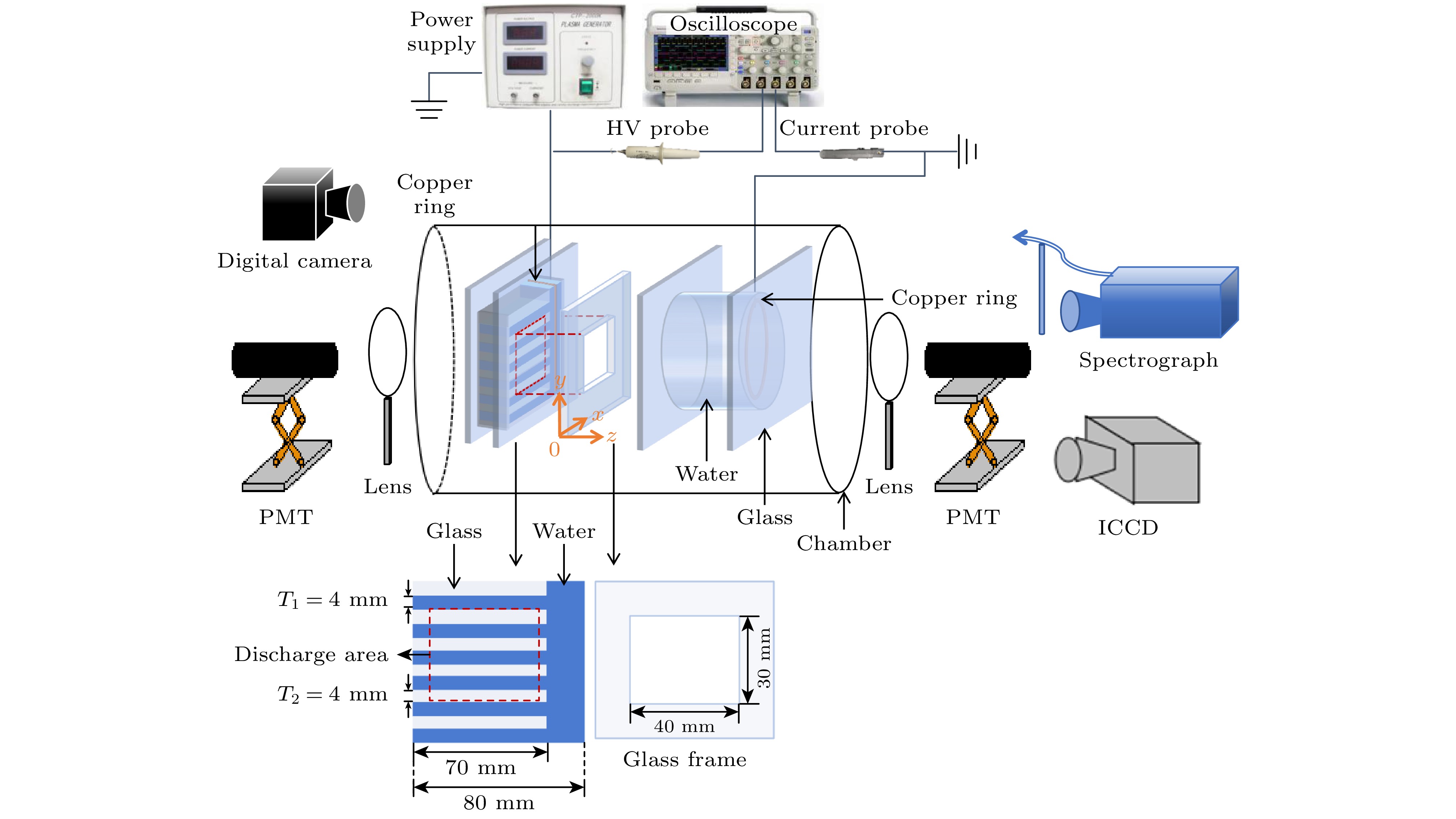 图 1 实验装置图, 其中T1区域为凹槽有水位置, T2区域为无水位置, 红色虚线框标出了完全条纹水电极表面的放电区域, 放电区域长40 mm, 宽30 mm, 气隙d = 2 mm