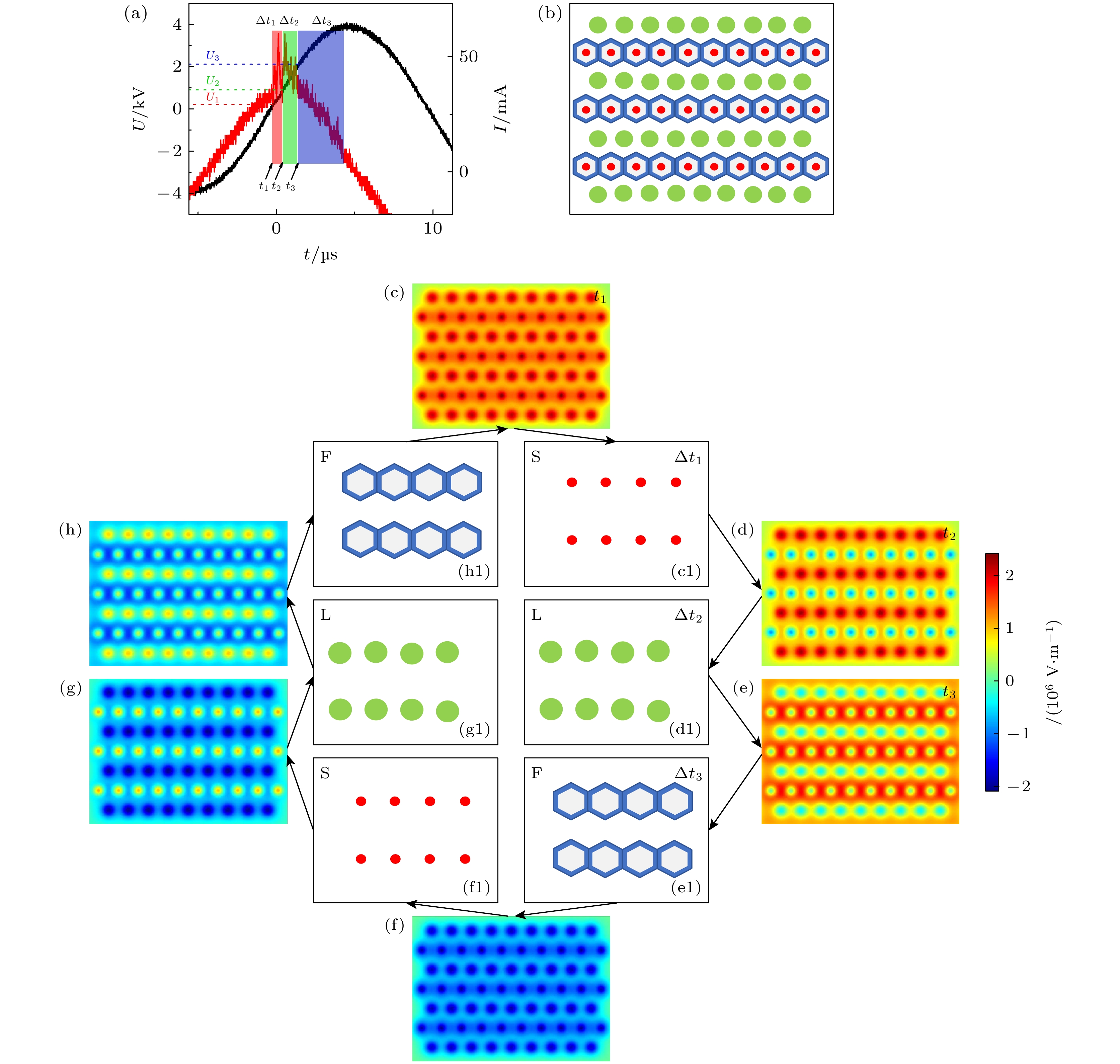 Fig. 10. Electric field distributions at different moments of the large and small dot honeycomb stripe superlattice pattern and the corresponding schematic diagrams of substructure: (a) Applied voltage and current waveforms for the pattern; (b) schematic diagram of the pattern; (c)–(e) electric field distributions in the gas gap at t1, t2, and t3 during the positive half-cycle; (f)–(h) correspond respectively to the electric field distributions before the discharge of each substructure in the negative half-cycle; (c1)–(h1) schematic illustrations of substructure discharge corresponding to the electric fields in panels (c)–(h).