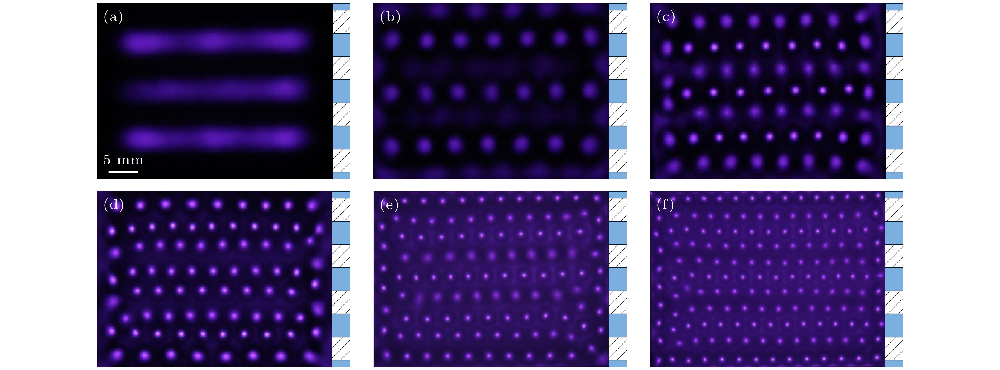 图 3 不同放电参数条件下(空气与氩气混合气体中氩气的含量χ, 气压p, 电压U)的条纹斑图 (a) 条纹斑图, χ = 0, p = 10 kPa, U = 2.2 kV; (b) 大点晕条纹斑图, χ = 0, p = 10 kPa, U = 2.8 kV; (c) 大小点条纹超点阵斑图, χ = 0, p = 10 kPa, U = 3.2 kV; (d) 双条纹斑图, χ = 0, p = 15 kPa, U = 3.8 kV; (e) 大小点蜂窝条纹超点阵斑图, χ = 30%, p = 20 kPa, U = 4.4 kV; (f) 条纹蜂窝超点阵斑图, χ = 30%, p = 20 kPa, U = 4.8 kV