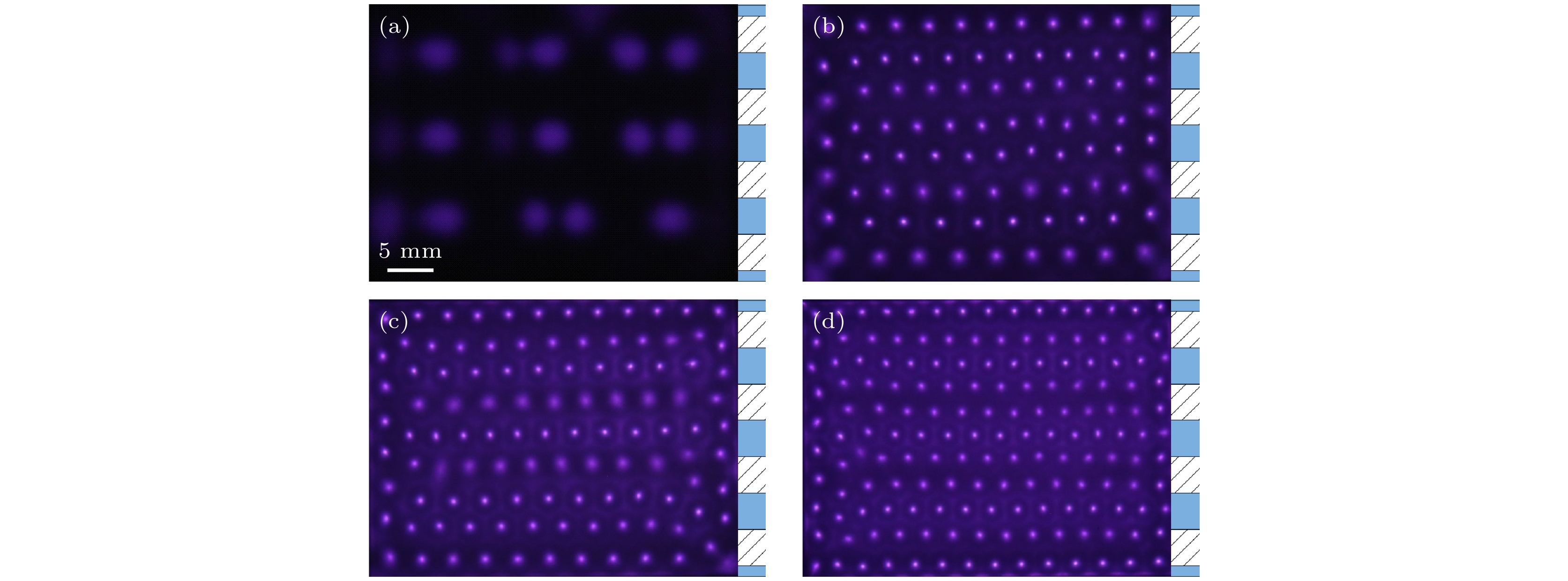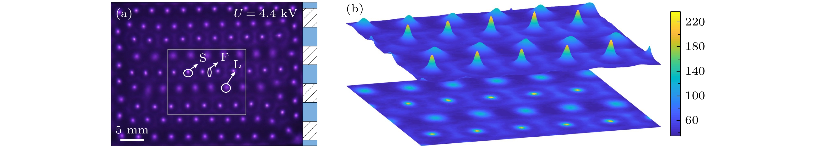 本文设计了一种特殊的完全条纹水电极介质阻挡放电装置, 通过求解拉普拉斯方程发现其产生了条纹状非均匀电场. 采用该装置在空气和氩气的混合气体放电中, 观测到了多种具有D2h对称性的条纹斑图, 其中4种条纹超点阵斑图为首次获得. 选取其中结构最复杂的大小点蜂窝条纹超点阵斑图进行研究, 该斑图由小点、大点和蜂窝框架三套放电丝子结构嵌套构成. 实验利用光谱仪测量了不同子结构的发射光谱, 发现其处于不同的等离子体状态; 采用高速照相机和光电倍增管对其时空动力学进行测量, 发现放电顺序为小点→大点→蜂窝框架, 其中蜂窝框架由随机放电丝叠加而成. 理论上, 通过求解泊松方程模拟了不同时刻的电场分布, 很好地解释了上述斑图的形成机制.In this work, a special striped water electrode dielectric barrier discharge device is designed. Through numerical solutions of the Laplace equation, the spatial distribution of the applied electric field is revealed to exhibit a strip-shaped nonuniform distribution featuring the alternating regions of enhanced and weakened field intensity. These field gradients play a pivotal role in governing the plasma, for the intensified regions act as preferential sites for discharge onset, directly shaping the formation and evolution of plasma structures. Using this device, a series of novel striped patterns is observed in the discharge of a mixed gas of air and argon, marking a significant advancement in pattern formation studies. Notably, four striped superlattice patterns are obtained for the first time, each displaying intricate structural hierarchies. Among them, the large and small dot honeycomb striped superlattice pattern featuring structural complexity is chosen to investigate the formation mechanisms. The pattern is composed of three substructures: small dots, large dots, and a honeycomb framework. In the experiment, the emission spectra of different substructures are measured using a spectrograph, revealing that they are in different plasma states. The spatiotemporal dynamic behaviors of the pattern are observed using a high-speed camera and two photomultiplier tubes. It is found that the discharge sequence is small dots → large dots → honeycomb framework, where the honeycomb framework is formed by the superposition of random discharge filaments. The electric field distributions at different times are simulated by solving the Poisson equation, and the result well explains the formation mechanism of the above-mentioned patterns.
