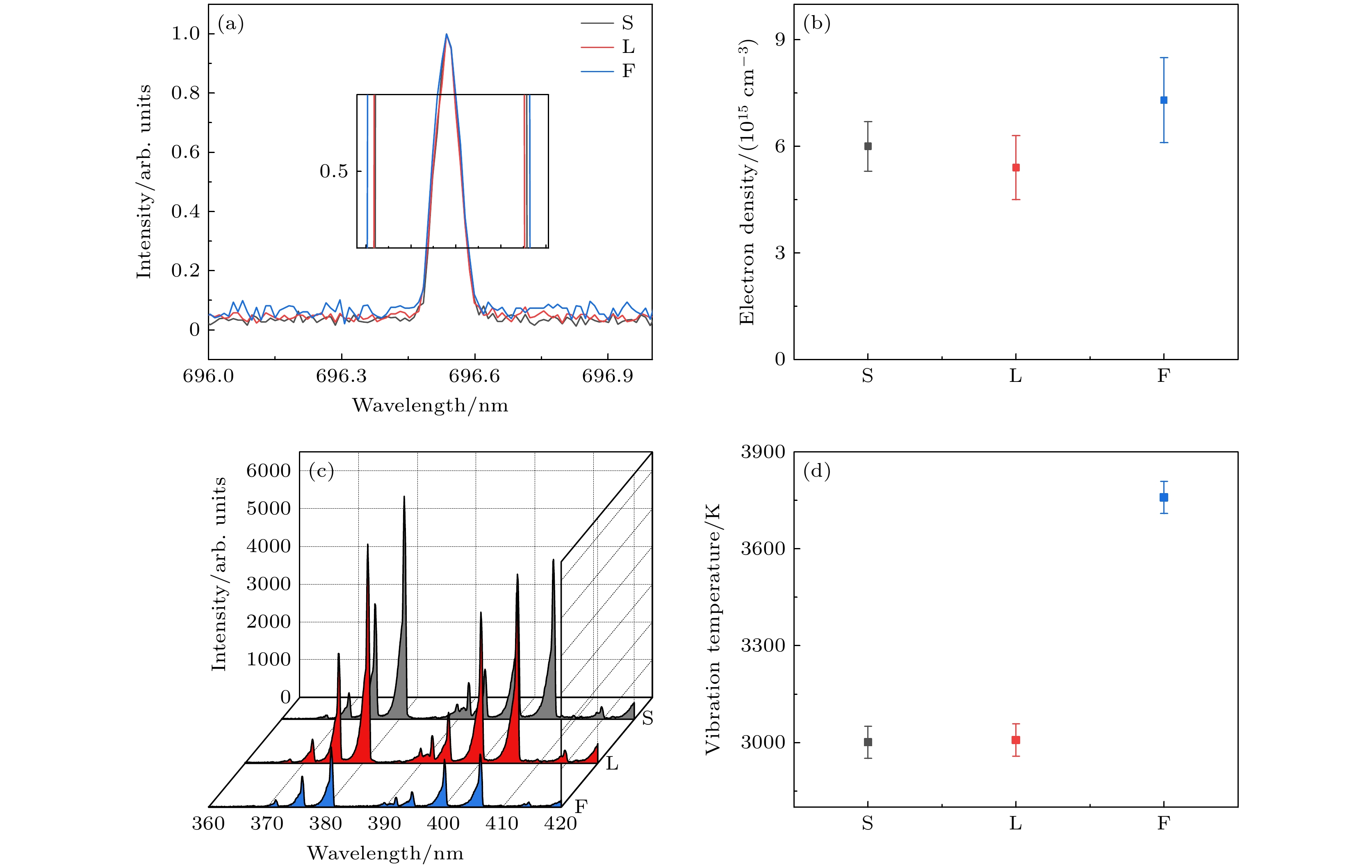 图 7 大小点蜂窝条纹超点阵斑图的发射光谱 (a) 不同子结构在696.54 nm处谱线和中心部分放大图; (b) 子结构S, L和F的电子密度; (c) 不同子结构在360—420 nm内的氮分子发射光谱; (d) 子结构S, L和F的振动温度