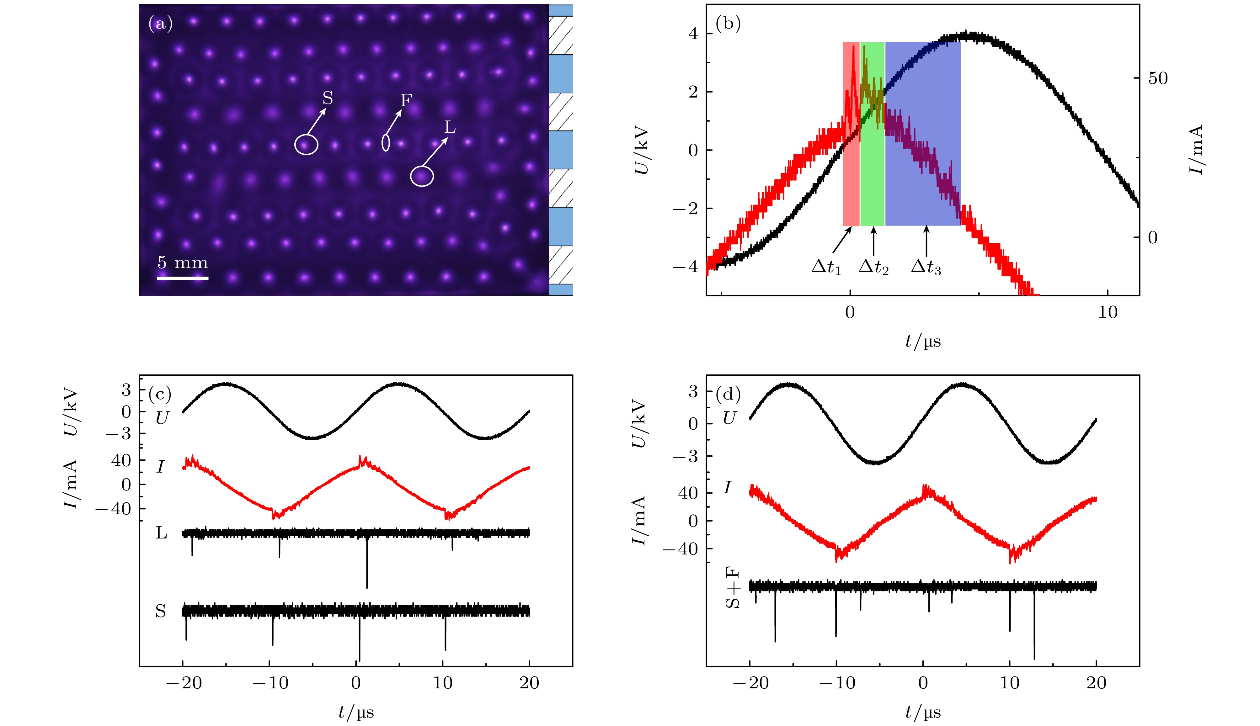 Fig. 8. Spatial-temporal structure dynamics measurement of large and small honeycomb stripe superlattice pattern: (a) Image of the pattern; (b) waveforms of voltage and current of the pattern in the positive half-cycle; (c) temporal correlation measurement of S and L; (d) temporal correlation measurement of S and F.