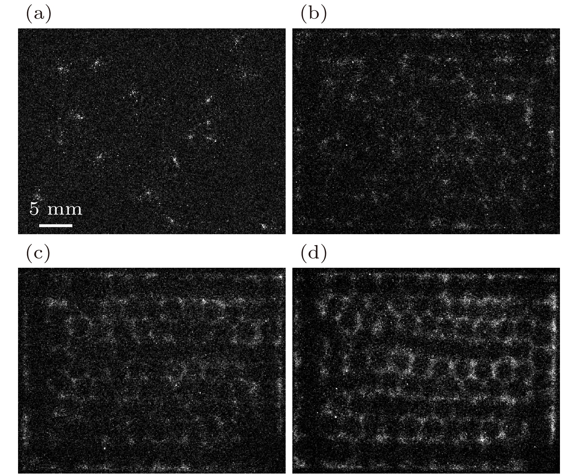 图 4 斑图类型随外加电压增加的演化过程 (a) 初始斑图, U = 2.8 kV; (b) 双条纹斑图, U = 3.4 kV; (c) 大小点蜂窝条纹超点阵斑图, U = 4.4 kV; (d) 条纹蜂窝超点阵斑图, U = 4.8 kV, 其他实验参数 p = 20 kPa, χ = 30%