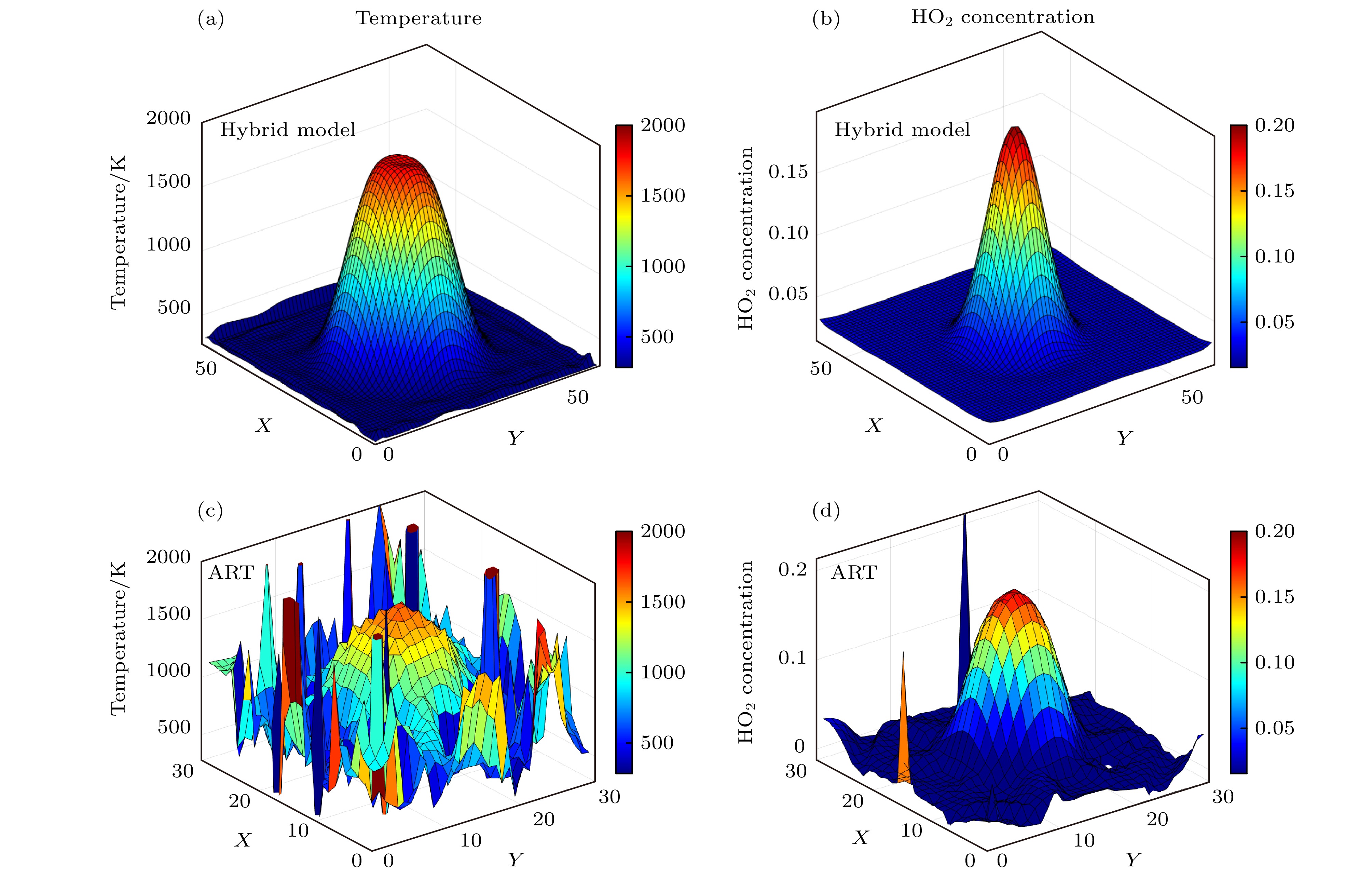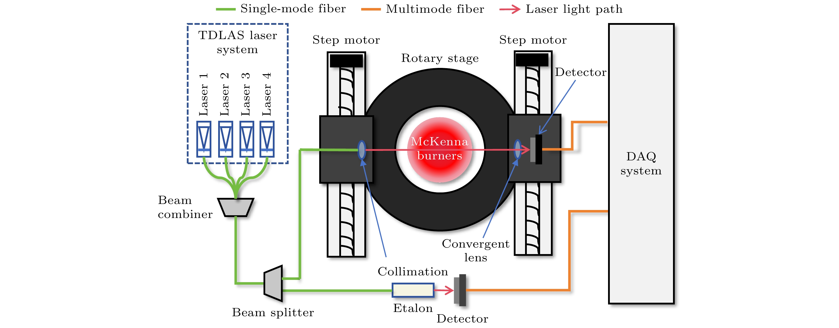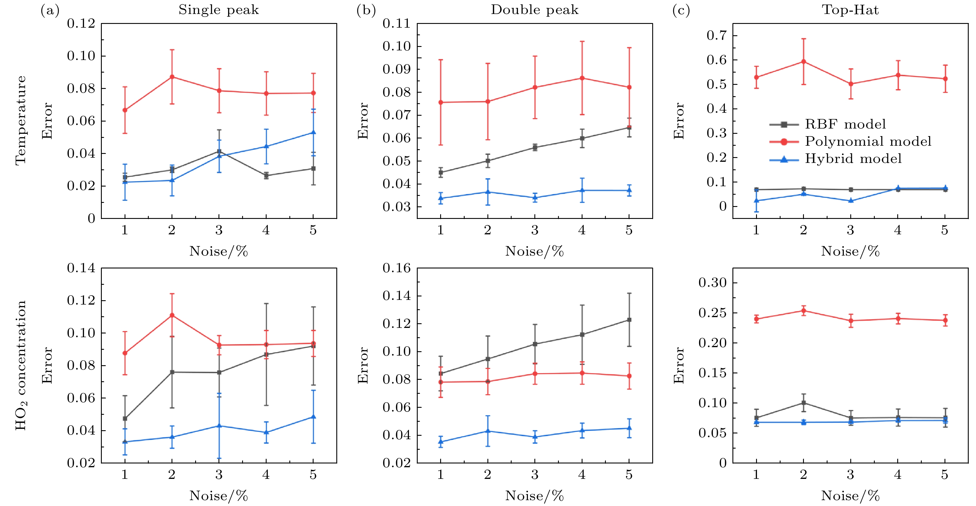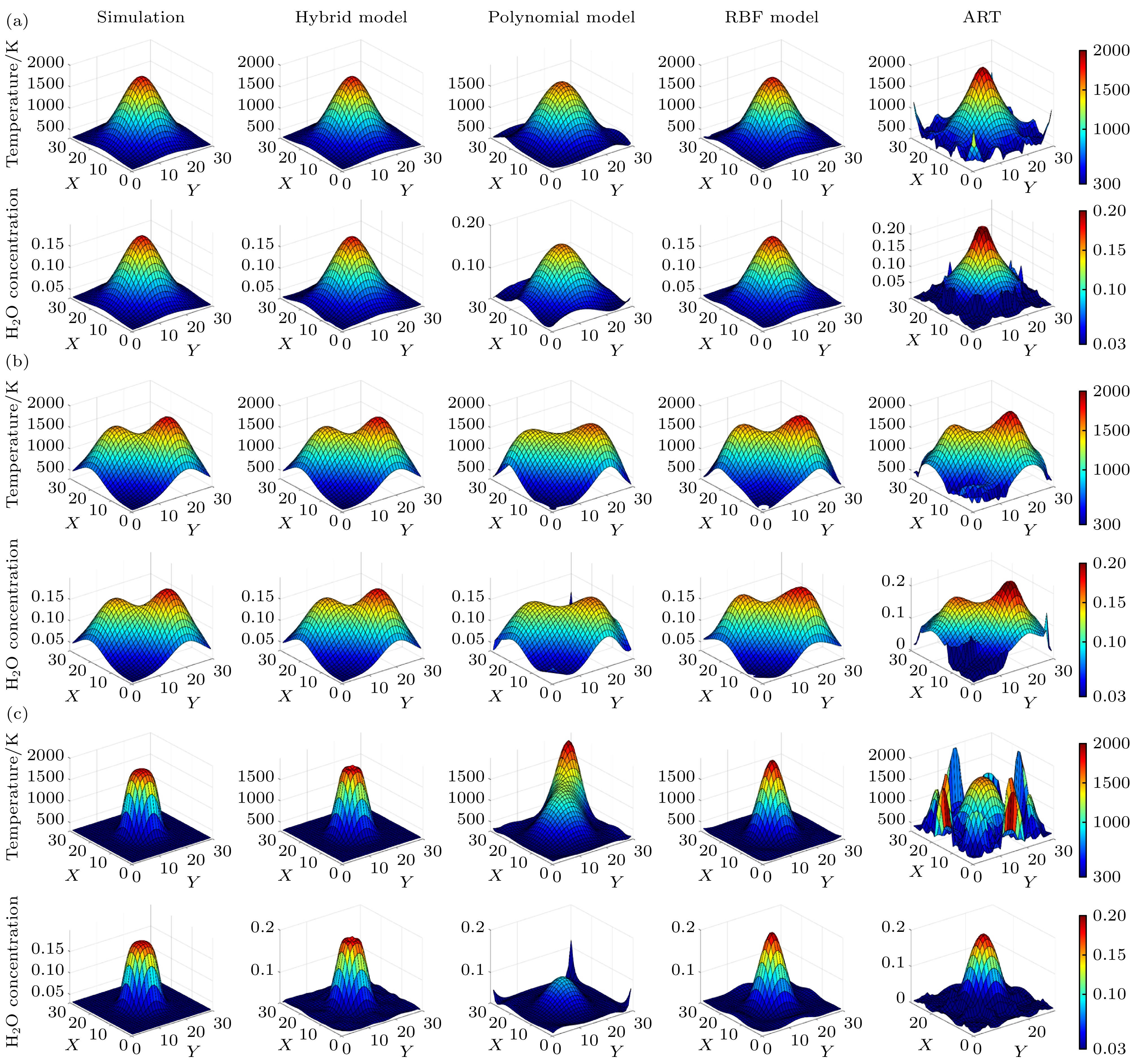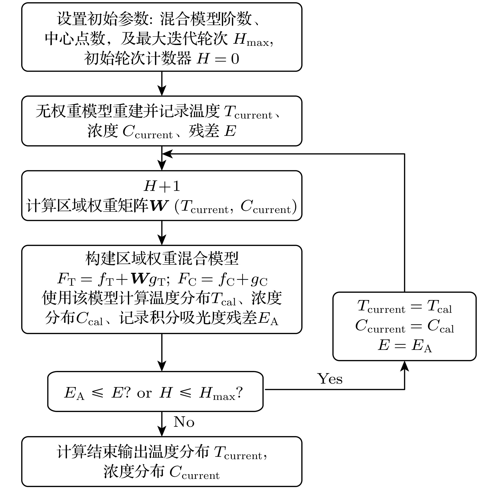 燃烧场温度与气体组分浓度的二维分布对发动机燃烧效率以及性能评估具有重要意义. 本文提出一种基于自适应区域权重混合模型的燃烧场温度和气体组分浓度二维重建方法, 提高复杂突变燃烧场重建精度. 通过区域权重机制将多项式模型与高斯径向基函数模型结合为混合模型, 并自适应迭代计算区域权重矩阵. 一方面通过区域权重矩阵保证了混合模型在兼顾全局特征的同时, 提高混合模型细节特征的描述能力; 另一方面, 在残差函数中加入区域权重正则化方法, 提升算法的精度. 数值模拟了三种燃烧场分布, 通过对比验证了混合模型的表征能力和重建精度, 结果表明, 混合模型算法重建误差低于单一模型及传统ART算法, 其温度、浓度分布重建最大误差分别为3.31%和7.13%. 并在标准McKenna燃烧器上搭建了扫描式TDLAS测量平台及热电偶测量平台对该方法进行实验验证, 重建结果与实际分布一致性较好, 1800 K下中心温度与热电偶测量结果偏差为10 K, 验证了该方法的有效性, 可为发动机燃烧场测量分析提供有效的参考.
