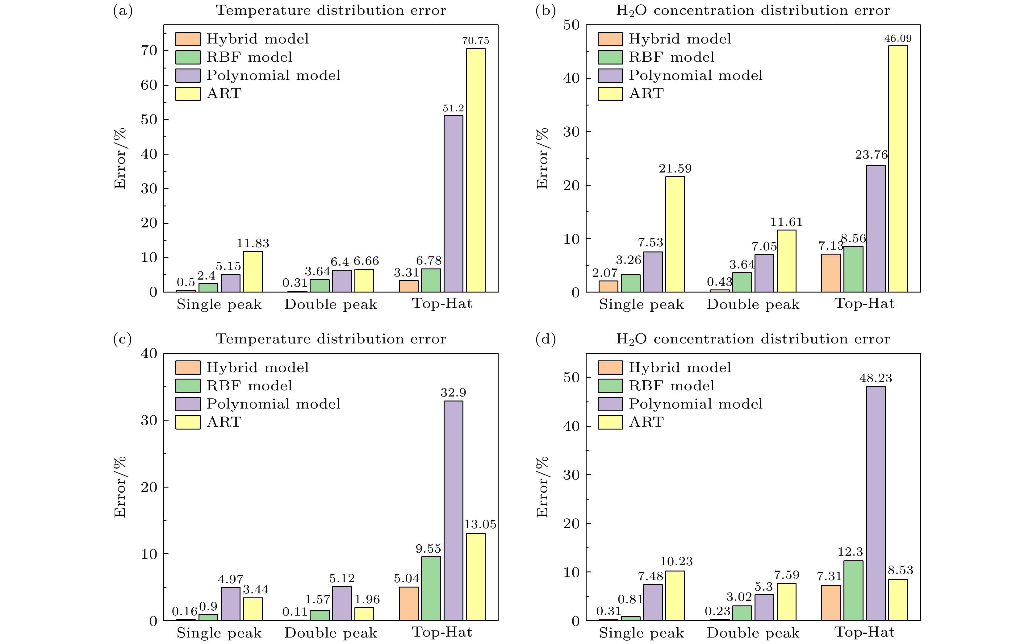 Fig. 6. Temperature and concentration reconstruction errors: (a) Temperature distribution reconstruction error; (b) concentration distribution reconstruction error; (c) central region temperature reconstruction error; (d) central region concentration reconstruction error.