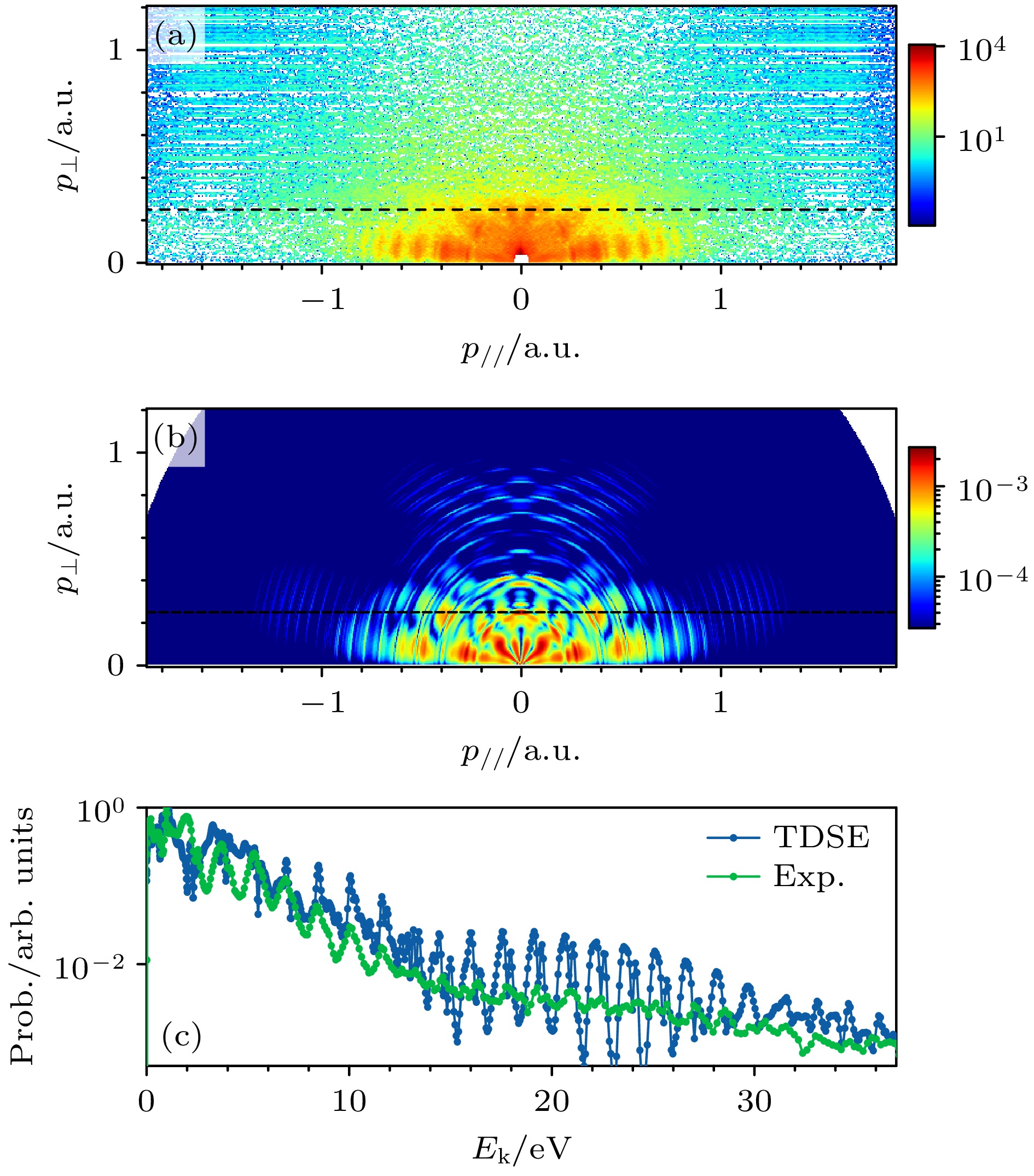 Fig. 1. Comparison of (a) experimental and (b) TDSE-simulated photoelectron momentum distributions (PMDs) for argon ionized by a 798 nm, 35 fs laser pulse with a laser intensity of $ 6.3 \times 10^{13} $ W/cm2. The laser polarization is along the $ p_{/ /} $ axis. (c) The corresponding photoelectron energy spectra, integrated over all emission angles, for experiment (green dotted line) and TDSE (blue dotted line). The TDSE results have been focal-volume averaged.