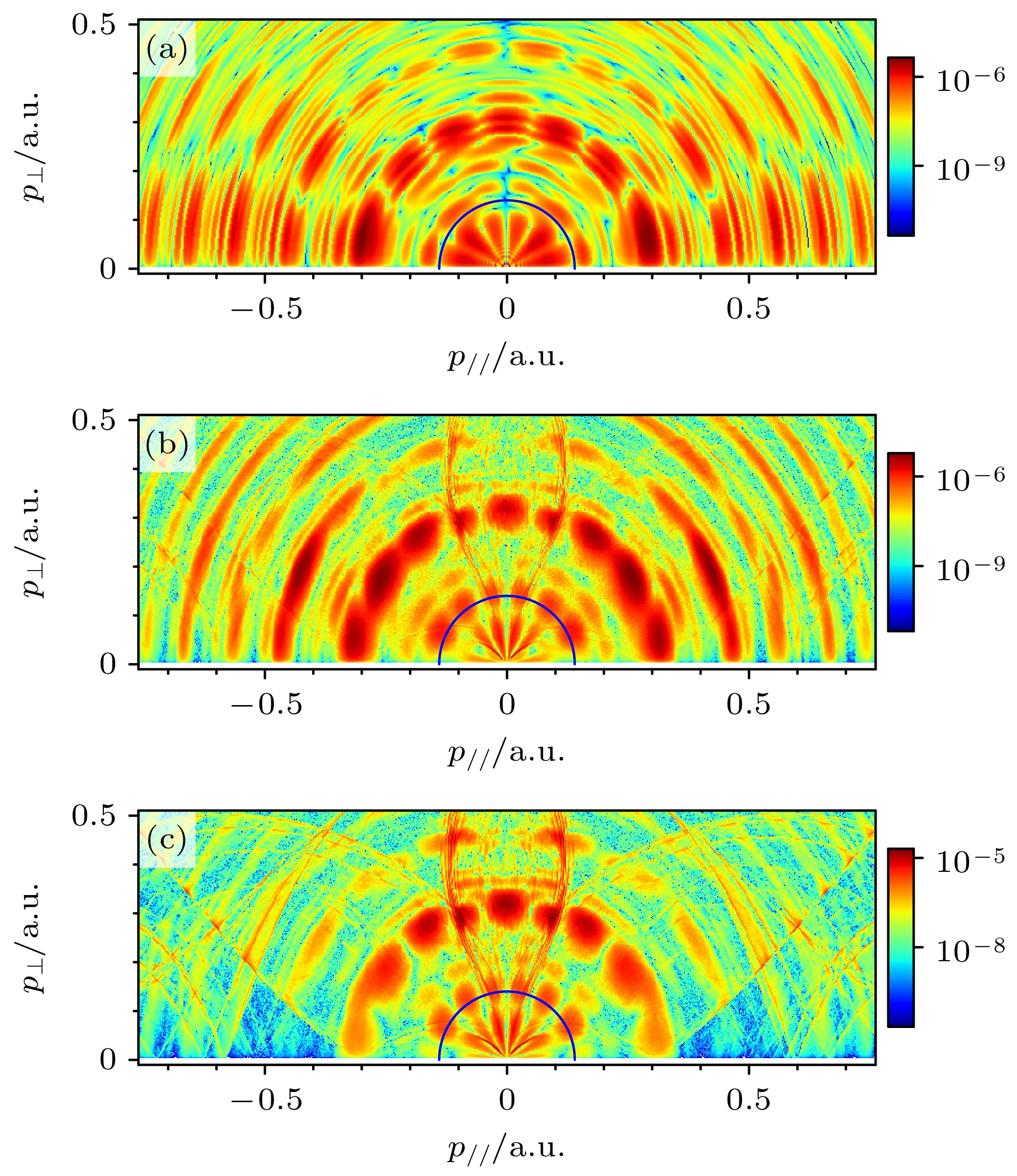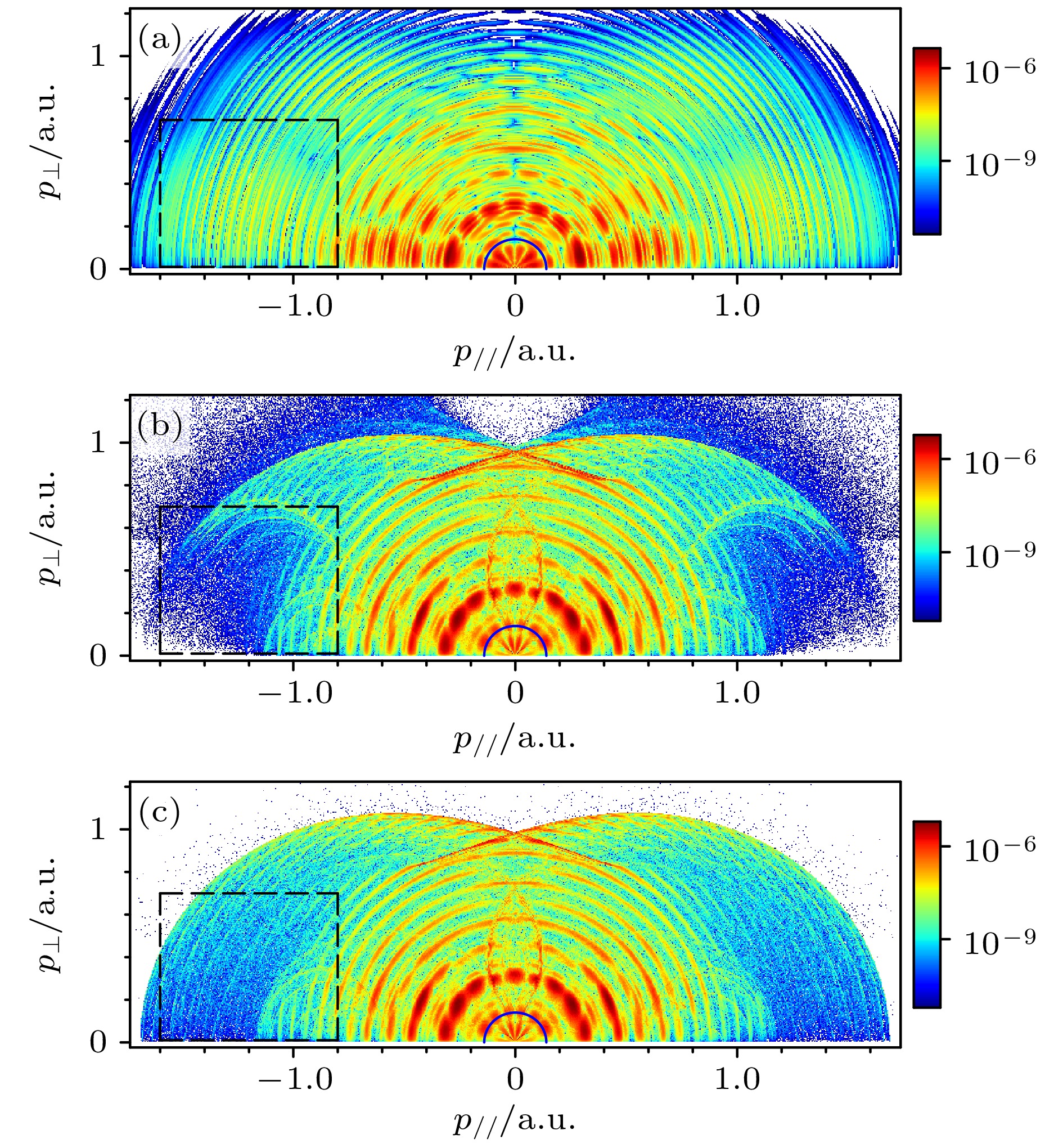图 5 感应偶极势对较高能再散射结构的影响 (a)含时薛定谔方程(TDSE)模拟(图2(a)放大图); (b)不含感应偶极势的半经典模拟($ v_{0{/ /}} \ne 0,\; U_{{\mathrm{ID}}} = 0 $)(图2(c)放大图); (c)包含感应偶极势的非绝热半经典模拟($ v_{0{/ /}}\neq 0,\; U_{{\mathrm{ID}}}\neq 0 $). 对比可见, 引入$ U_{{\mathrm{ID}}} $显著抑制了纯库仑势导致的尖锐焦散结构, 使结果(图(c))在定性上更接近TDSE基准(图(a))