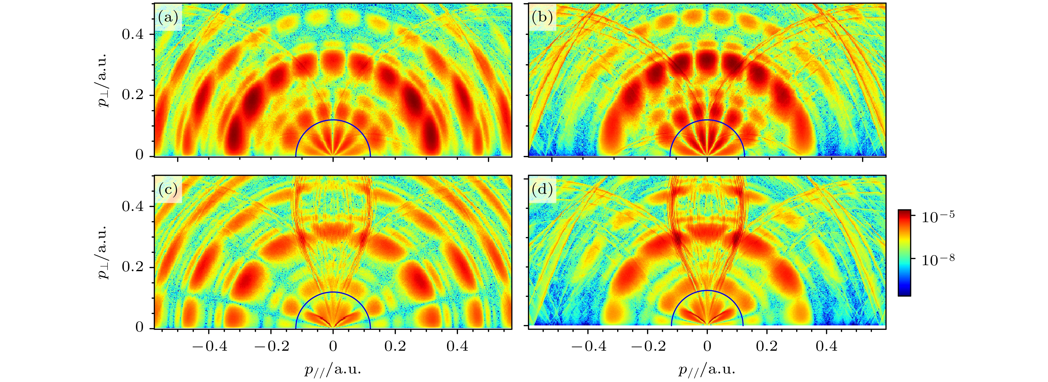 图 3 干涉机制解析. 仅(a), (b)Ⅰ+Ⅱ类(“直接”与前向散射)和(c), (d)Ⅱ+Ⅲ类(全息对)干涉的PMD. 图(a)和(c)含初始纵向动量, 图(b)和(d) 不含. Ⅰ+Ⅱ类干涉的扇形结构基本不受初始动量影响, 而主导SFPH的Ⅱ+Ⅲ类干涉同样稳健