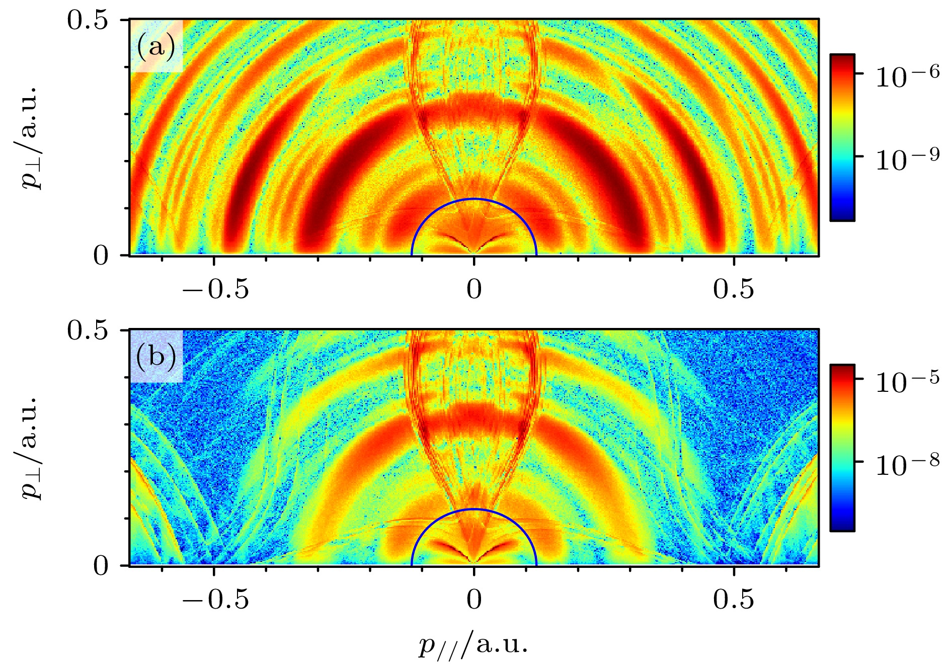结合实验与理论研究, 探索了在多光子区域($ \gamma \gt 1 $)短脉冲激光作用下氩原子的光电离过程. 通过建立包含隧穿出口处电子初始纵向动量的半经典模型, 模拟了光电子动量分布. 该方法基于费曼路径积分理论框架, 为每条电子轨迹赋予动力学相位, 从而实现了对量子干涉效应的研究. 模拟结果与含时薛定谔方程(TDSE)数值解高度符合, 同时发现, 初始纵向动量的引入对于精确重现电离阈值附近观测到的光电子谱干涉结构至关重要, 并揭示出离子实极化对低能谱影响甚微. 本文的研究结果强调了超短脉冲光电离中非绝热势垒下动力学的重要性, 并提供了基于量子轨道的清晰物理图像.