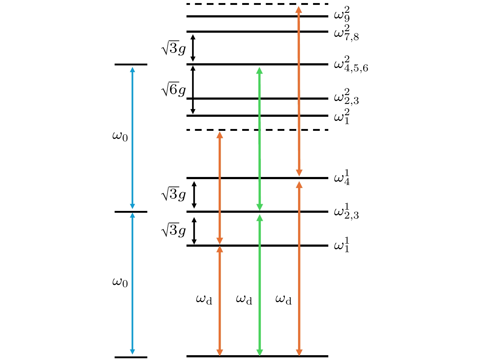 Fig. 2. Energy-level diagram for single-photon blockade. When the driving field frequency $ \omega_{{\rm{d}}} = \omega_0 \pm \sqrt{3}g $, one photon is resonantly absorbed by the system, while the second photon is blockaded.