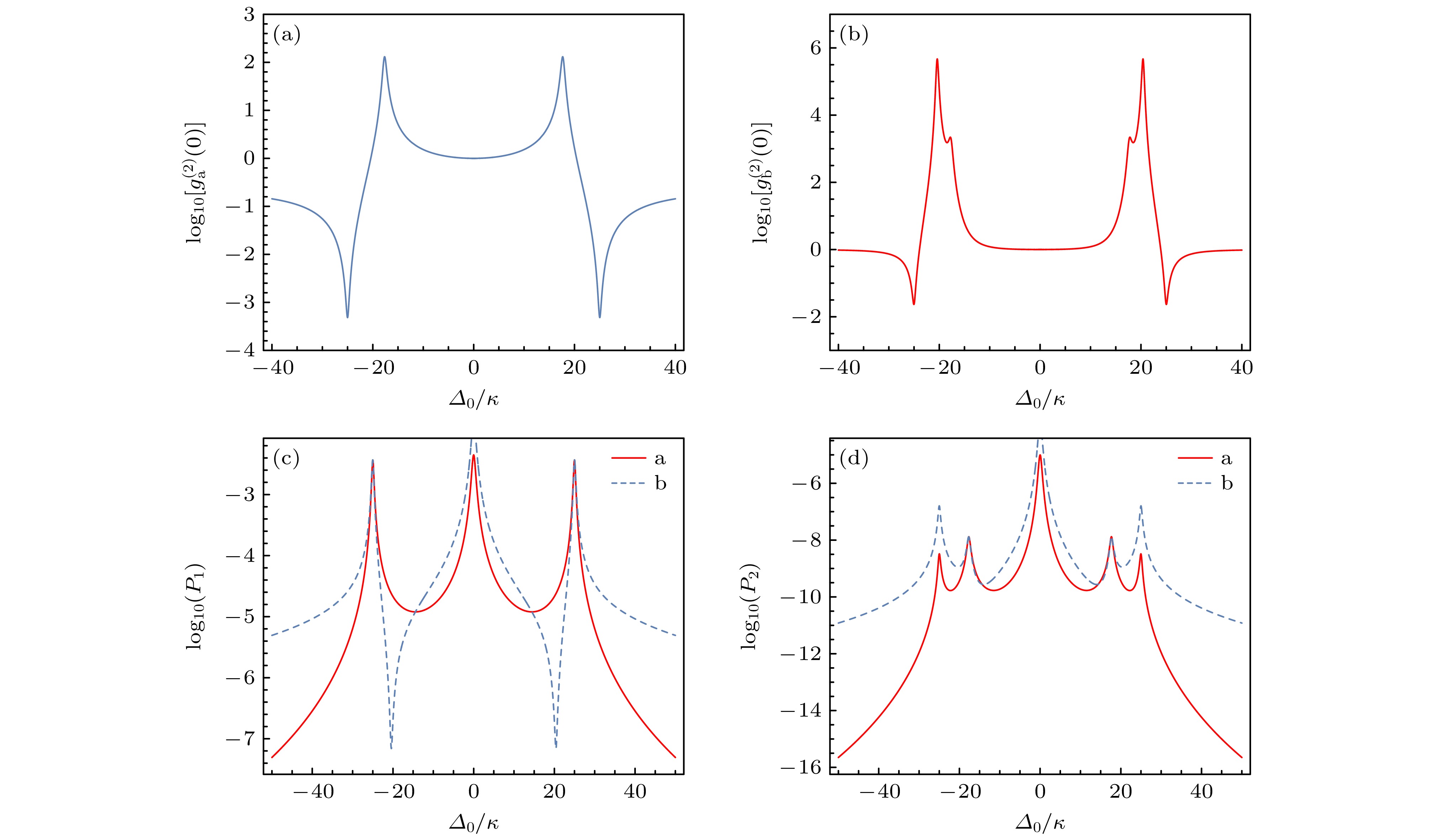 Fig. 3. (a), (b) Logarithmic plots of the equal-time second-order correlation function $ g^{(2)}(0) $ versus detuning $ \varDelta_{0} /\kappa $ for a, b mode; (c), (d) logarithmic plots of the single-photon $ P_1 $ and two-photon $ P_2 $ occupation probabilities versus detuning $ \varDelta_0/\kappa $ for a, b mode. Red solid and blue dashed curves represent a and b modes, respectively. Parameters: $ \varOmega/\kappa=0.1, \ \gamma/\kappa=0.1, \ g/\kappa=25/\sqrt{3} $.