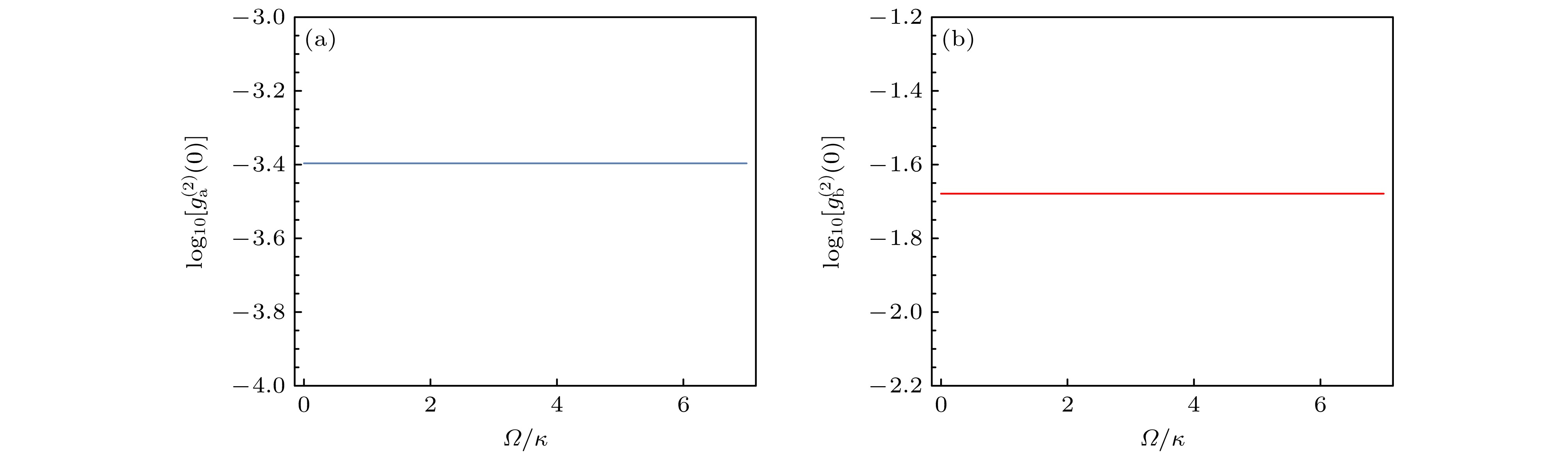 Fig. 4. (a), (b) Logarithmic plots of the equal-time second-order correlation function $ g^{(2)}(0) $ versus $ \varOmega/\kappa $ for a, b mode. Parameters: $ \varDelta_{0}=\sqrt{3}g , \gamma/\kappa=0.1 $ and $ g /\kappa =25 /\sqrt{3} $.