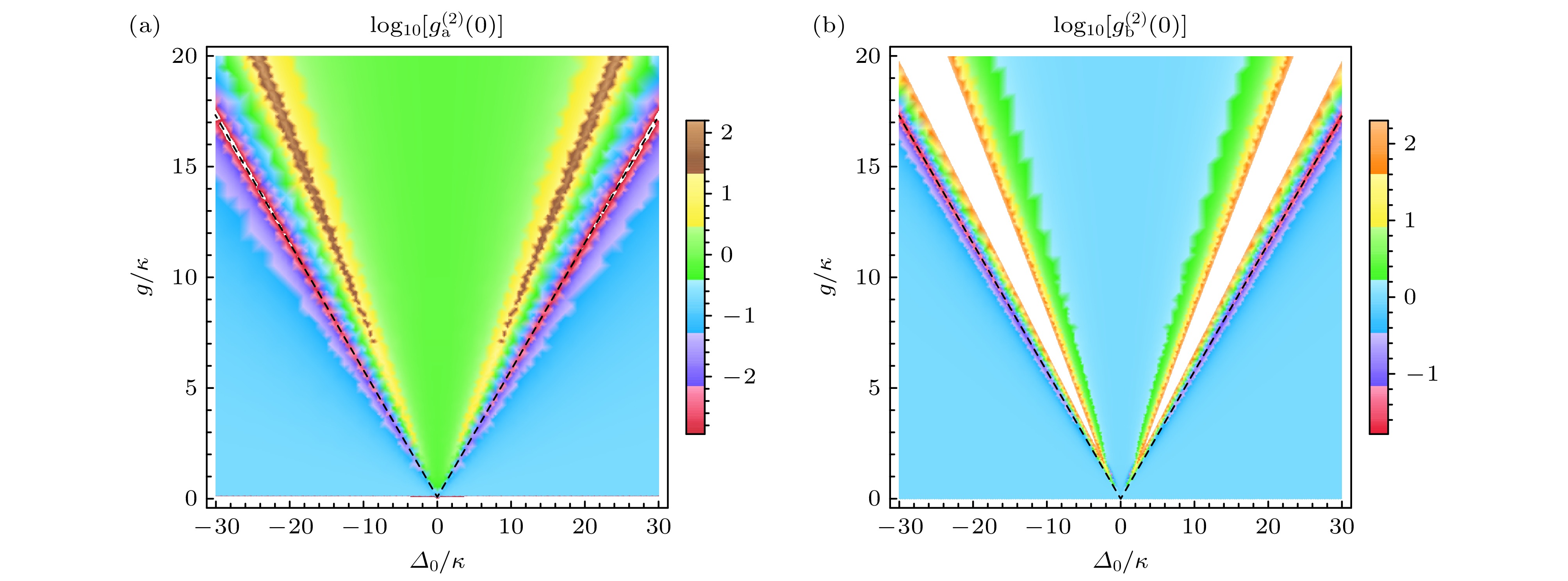 Fig. 5. (a), (b) Logarithmic plots of the equal-time second-order correlation function $ g^{(2)}(0) $ versus $ \varDelta_{0} /\kappa $ and $ g /\kappa $ for a, b mode. Parameters: $ \varOmega/\kappa=0.1 $ and $ \gamma/\kappa=0.1 $. Black dashed lines indicate optimal conditions $ \varDelta_0=\pm\sqrt{3}g $.
