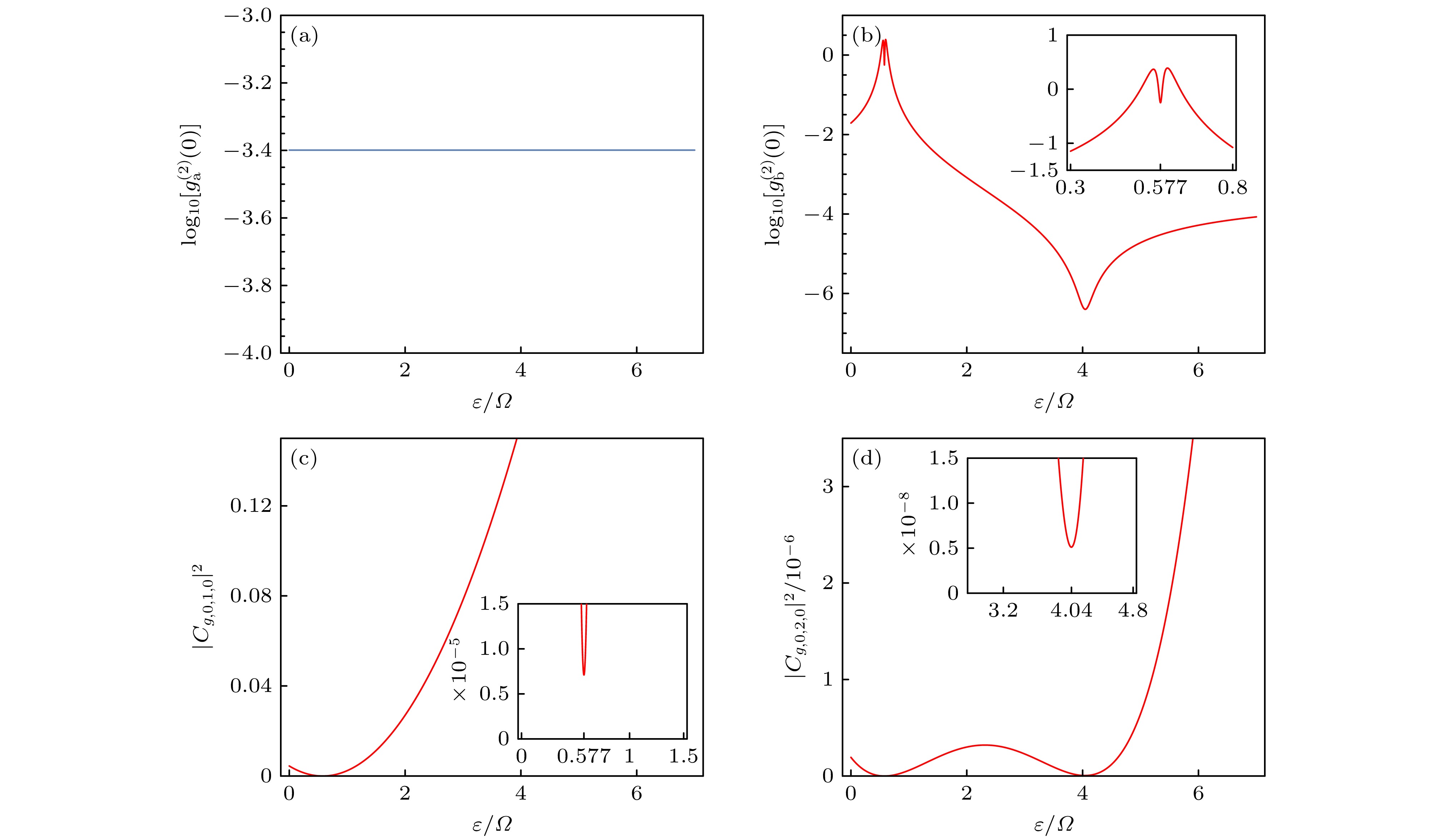 Fig. 6. (a), (b) Logarithmic plots of equal-time second-order correlation $ g^{(2)}(0) $ versus driving ratio $ \varepsilon/\varOmega $ for a, b mode; (c) single-photon occupation probabilities $ |C_{g, 0, 1, 0}|^2 $ versus driving ratio $ \varepsilon/\varOmega $ for b mode; (d) two-photon occupation probabilities $ |C_{g, 0, 2, 0}|^2 $ versus driving ratio $ \varepsilon/\varOmega $ for b mode. Parameters: $ \varDelta_0=\sqrt{3}g $ and other parameters are the same as Fig. 3.