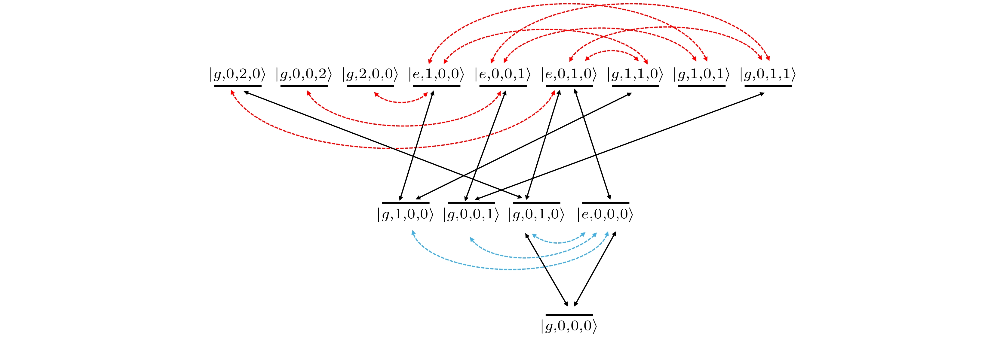 图 7 系统从态$ | g, 0, 0, 0 \rangle $到达态$ | g, 0, 2, 0 \rangle $有多条路径, 这些路径之间的量子干涉相消可以产生非常规光子阻塞效应. 图中黑色实线代表系统的所有可能量子态; 黑色双向箭头实线表示在外部驱动下系统吸收光子的过程; 蓝色双向箭头虚线表示当系统中有单个光子时, 不同状态之间的跃迁路径; 红色双向箭头虚线表示当系统中有两个光子时, 不同状态之间的跃迁路径