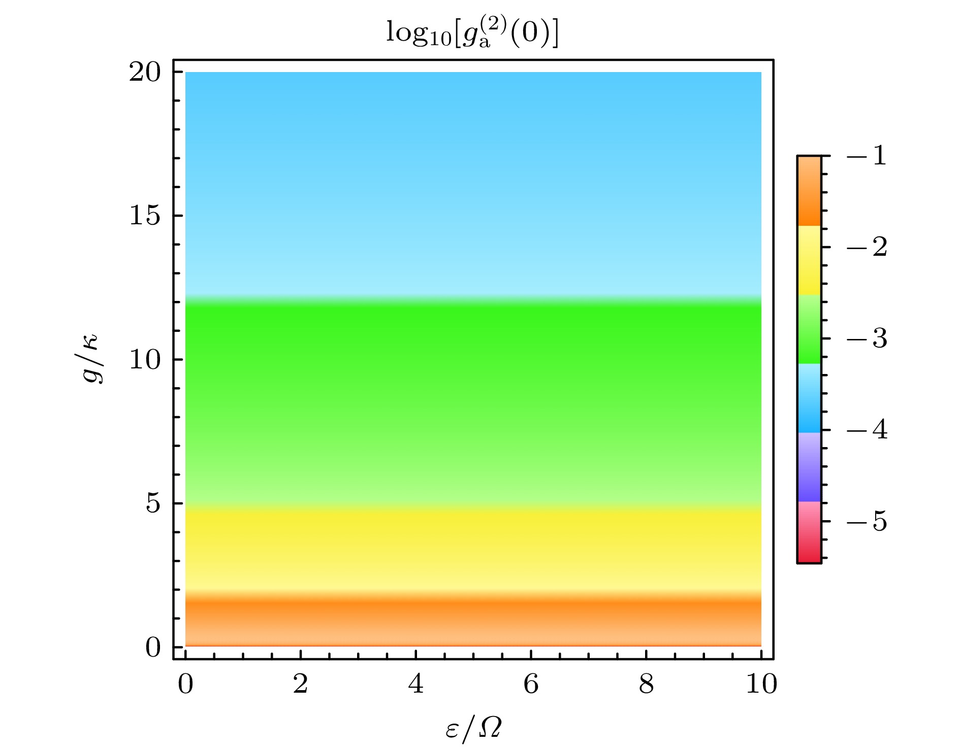 Fig. 8. Logarithmic plot of the equal-time second-order correlation function $ g_{{\rm{a}}}^{(2)}(0) $ versus the coupling strength ratio $ \varepsilon/\varOmega $ and coupling strength $ g/\kappa $ for mode a, with $ \varDelta_0 = \sqrt{3}g $ and other parameters are the same as in Fig. 5.