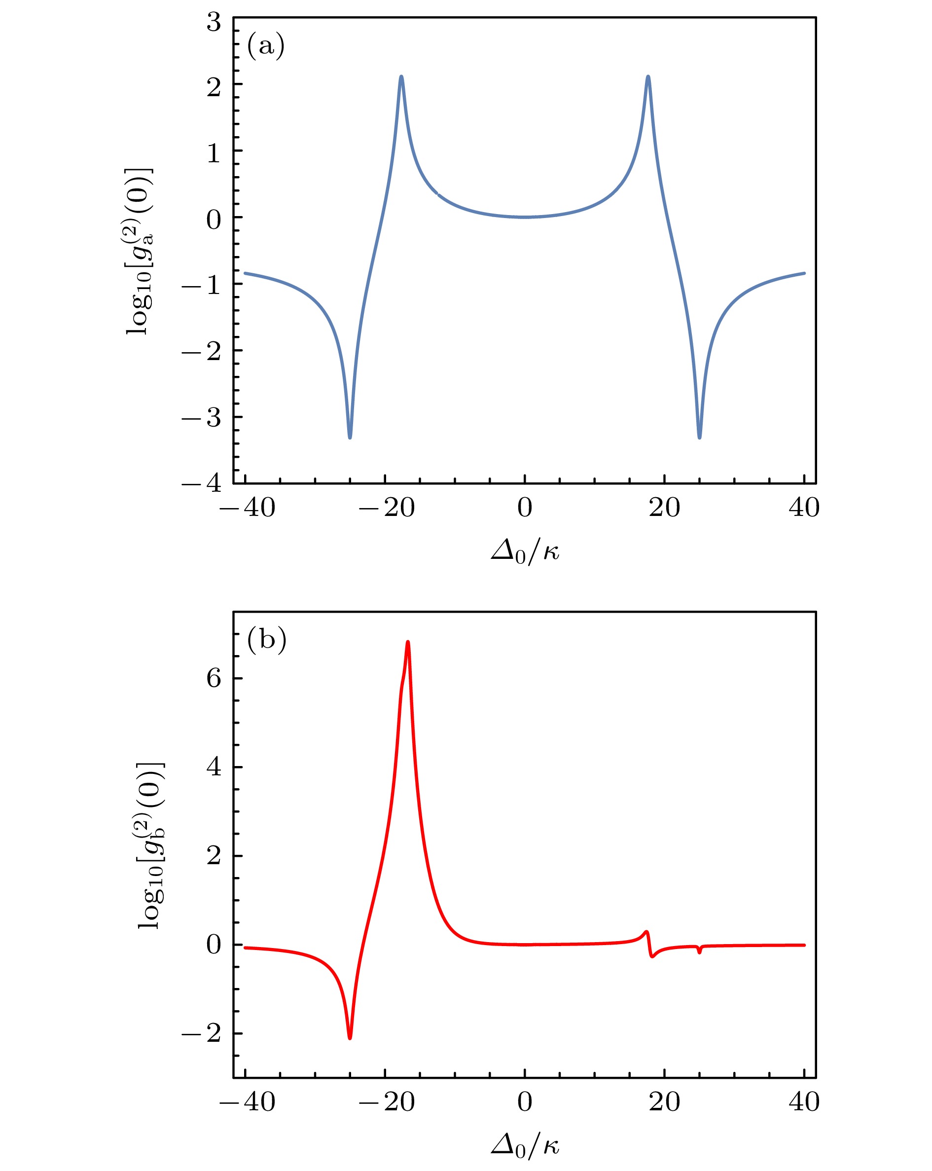 Fig. 9. (a), (b) Logarithmic plots of the equal-time second-order correlation function $ g^{(2)}(0) $ versus detuning $ \varDelta_0/\kappa $ for a, b mode, respectively. Parameters: $ g/\kappa=25/\sqrt{3} $, $ \varepsilon=\dfrac{\sqrt{3}}{3}\varOmega $ and other parameters are the same as in Fig. 5.