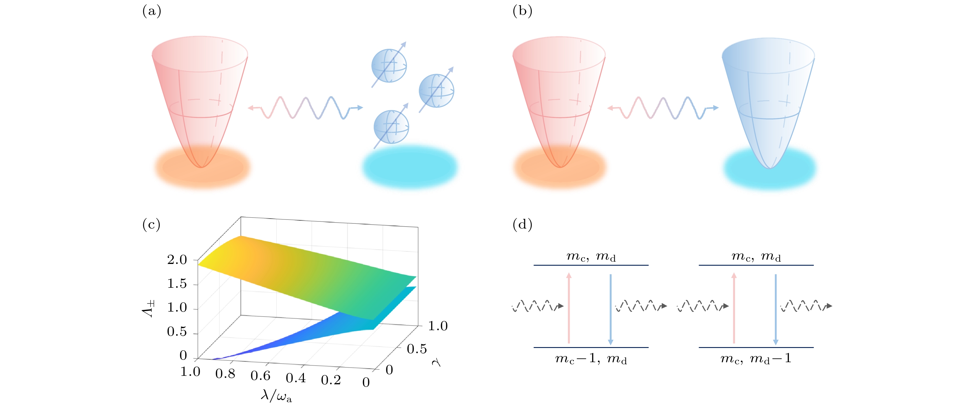 Fig. 1. A schematic description of (a) anisotropic Dicke model and (b) two-coupled-oscillator model, of which these quantum components, i.e., qubits and photons, individually interact with bosonic thermal reservoirs. (c) Two eigenmodes of two-coupled-oscillator Hamiltonian at Eq. (3) with $ \omega_a=1 $, $ \varepsilon=0.8\omega_a $, and the truncation numbers of two bosonic modes are $ N^a_{\rm tr}=N^b_{\rm tr}=30 $. (d) Incoherent energy exchange processes between the two-coupled-oscillator system in the eigen-basis and the thermal reservoirs.