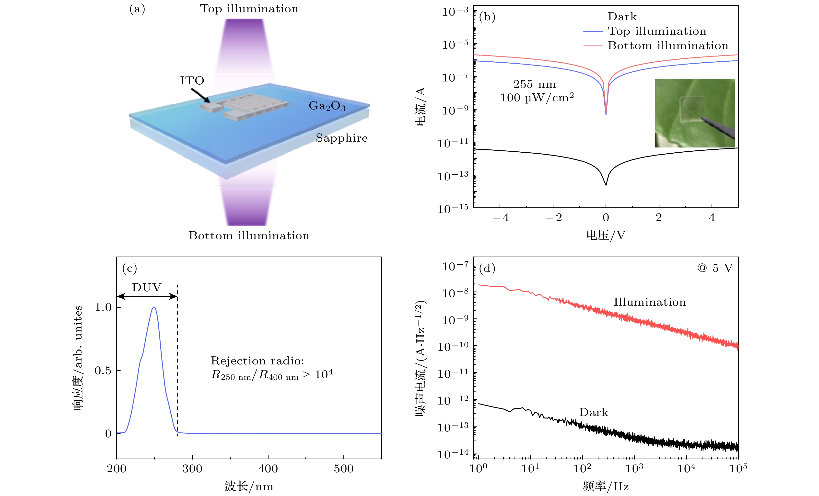 Fig. 2. (a) Schematic structure of the fully transparent Ga2O3-based solar-blind UV photodetector; (b) I-V characteristics under front-illumination and back-illumination; (c) normalized spectral responsivity of the device; (d) noise current measured in the dark and under 255 nm UV illumination.