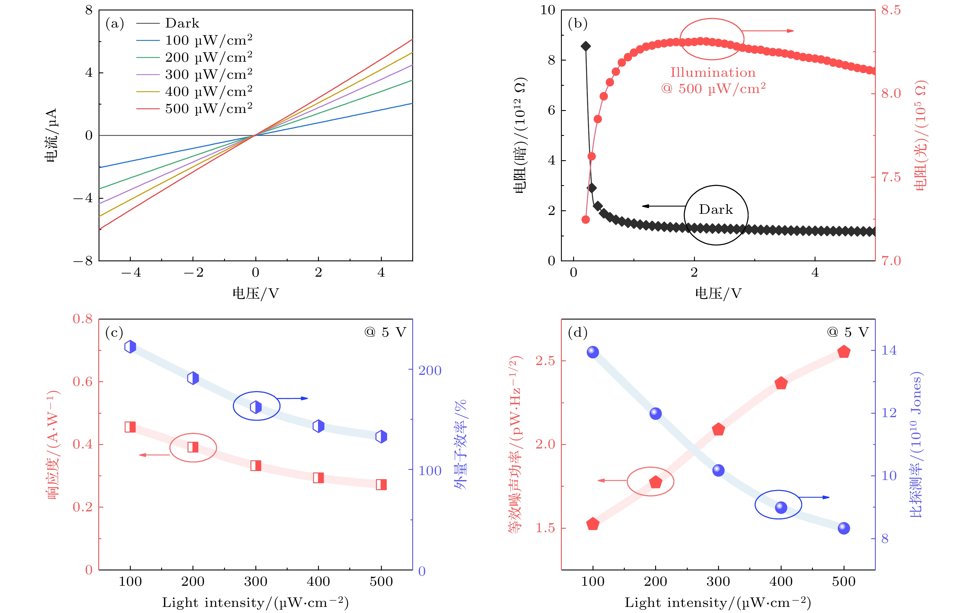 图 3 (a) 在黑暗和254 nm紫外光照条件下, β-Ga2O3全透明日盲探测器的I-V特性曲线; (b) 电阻特性; (c) 响应度、外量子效率与入射光功率强度的对应关系; (d) 等效噪声功率、比探测率与入射光功率强度的对应关系