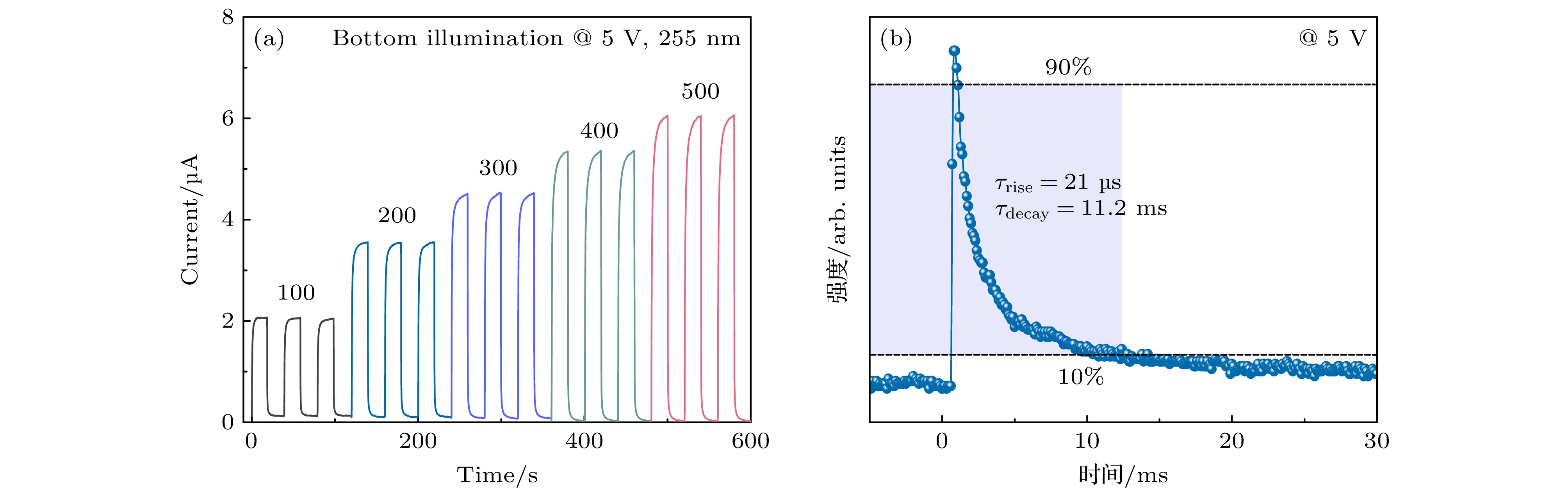 Fig. 4. (a) Dynamic back-illumination switching response of the device under 5 V bias and 255 nm UV illumination at varying intensities; (b) transient photoresponse of the Ga2O3 transparent solar-blind photodetector under 266 nm pulsed laser excitation at 5 V bias.