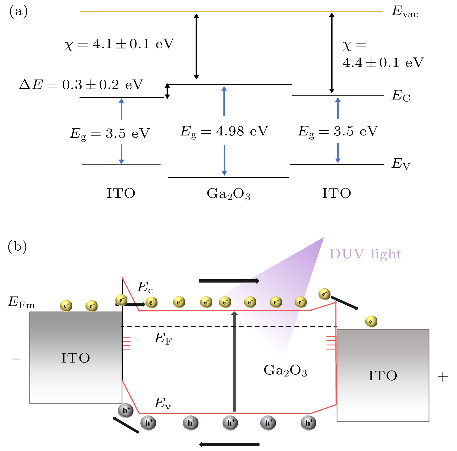 为满足日盲紫外通信等前沿应用对高性能光电探测器的迫切需求, 本文设计并实现了一种基于背入射结构的全透明β-Ga2O3日盲光电探测器. 该器件采用射频磁控溅射技术在双面抛光蓝宝石衬底上外延生长高质量β-Ga2O3薄膜, 并构筑了能够与n型Ga2O3形成高效准欧姆接触的氧化铟锡(ITO)叉指电极. 该结构的核心优势在于利用双抛蓝宝石衬底在深紫外波段的高透过率, 使入射光子绕开紫外区吸收显著的ITO电极, 彻底规避了传统正入射模式中由电极遮蔽效应所导致的光子损失. 得益于此, 器件展现出卓越的光电性能, 如高响应度、高探测率与优异的紫外/可见光抑制比. 在此高性能探测器平台基础上, 进一步发掘了该器件的多功能应用潜力. 基于β-Ga2O3单斜晶系的本征晶格各向异性, 构建偏振探测实验系统, 器件表现出显著的偏振光敏特性. 同时, 成功搭建了非视距(NLOS)紫外通信演示系统, 验证了其在复杂信道下进行高保真信息传输的可行性. 本研究为构建兼具高灵敏度与偏振分辨、非视距通信能力的新一代Ga2O3基光电器件提供了有效的物理思路和实验依据, 在安全通信、偏振成像等领域展现出广阔的应用前景.To meet the urgent demand for high-performance photodetectors in emerging solar-blind ultraviolet communication applications, this study systematically designs and implements a fully transparent β-Ga2O3 solar-blind photodetector based on a back-illumination architecture. The device is fabricated using RF magnetron sputtering to epitaxially grow high-quality β-Ga2O3 films (~300 nm in thickness, ~4.98±0.05 eV in bandgap) on double-polished sapphire substrates, with indium tin oxide (ITO) interdigitated electrodes forming efficient quasi-Ohmic contacts with n-type Ga2O3. The core advantage of this design lies in exploiting the high deep-UV transmittance of double-polished sapphire substrates, enabling incident photons to completely bypass the UV-absorbing ITO electrodes and eliminate photon loss caused by electrode shadowing effects in traditional front-illumination configurations. Consequently, the device demonstrates exceptional optoelectronic performance: a maximum responsivity of 0.46 A/W corresponding to an external quantum efficiency of 222.4%, an outstanding UV/visible rejection ratio of 1.2×104, a minimum noise equivalent power of 1.52 pW/Hz1/2, and a peak specific detectivity of 1.39×1011 Jones, with fast response times of 24 μs (rise) and 1.24 ms (decay). Building on this high-performance detector platform, we further explore its multifunctional application potential by constructing a polarization detection system that utilizes the intrinsic lattice anisotropy of monoclinic β-Ga2O3, and successfully demonstrating a non-line-of-sight (NLOS) UV communication system that validates high-fidelity information transmission in complex scattering channels. This work provides effective physical insights and experimental basis for developing next-generation Ga2O3-based optoelectronic devices with integrated high sensitivity, polarization resolution, and NLOS communication capabilities, showing promising applications in secure communications and polarization imaging.
