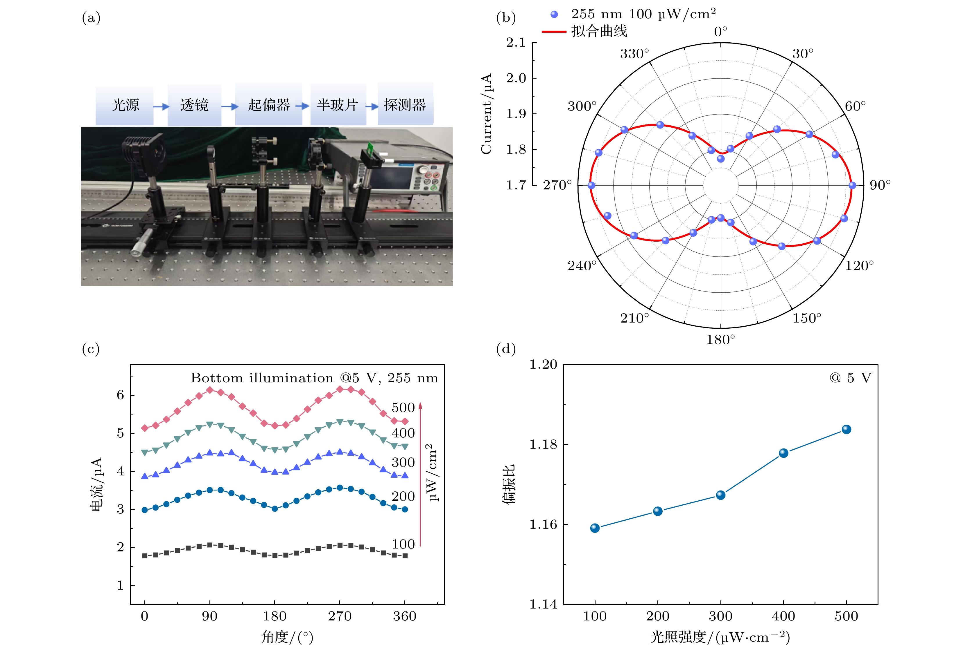 Fig. 7. (a) Photograph of the deep-UV polarization measurement setup; (b) polar plot of photocurrent versus polarization angle under 255 nm, 100 μW/cm2 UV illumination; (c) angular-dependent photoresponse from 0° to 360° at various incident power levels; (d) polarization ratio as a function of incident light intensity.