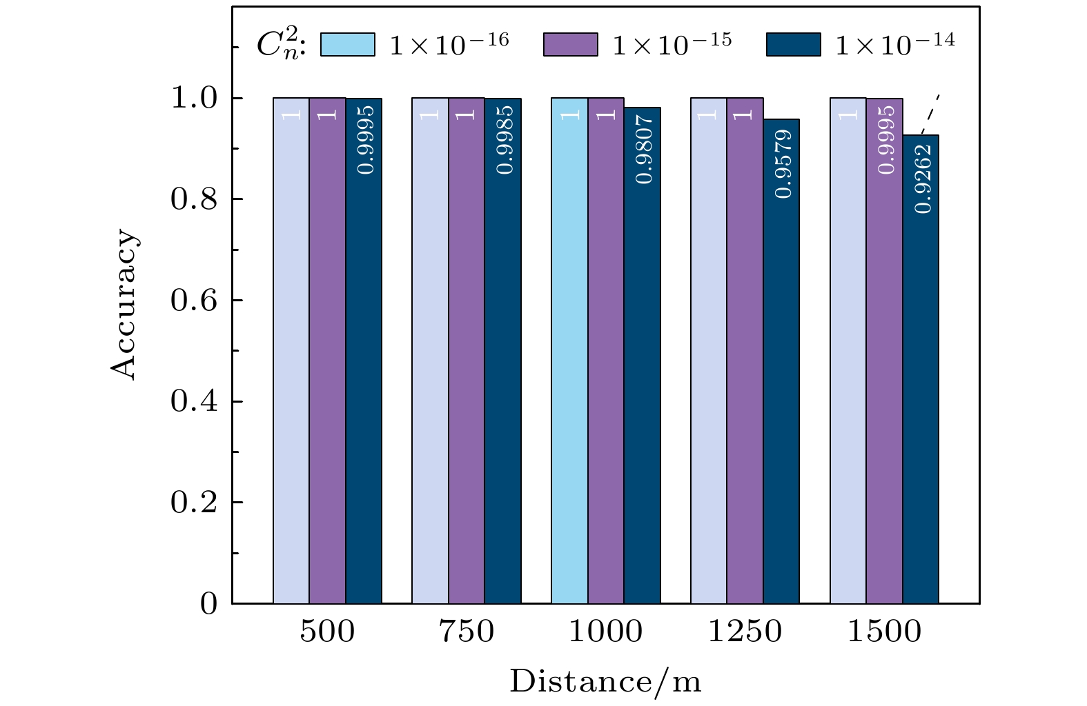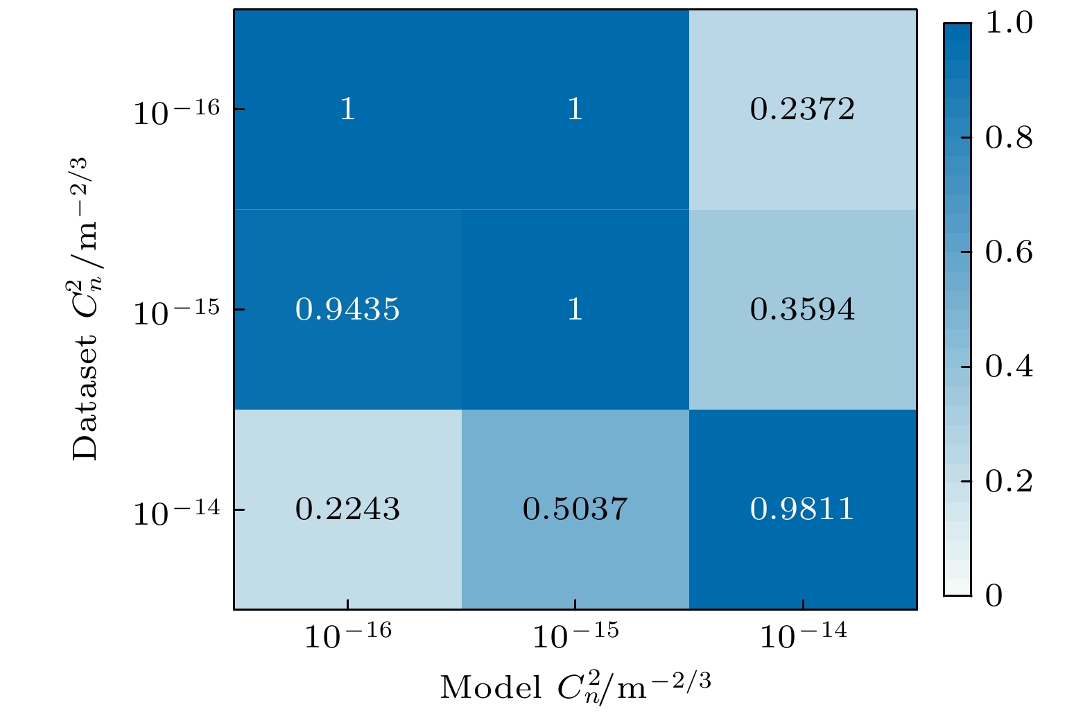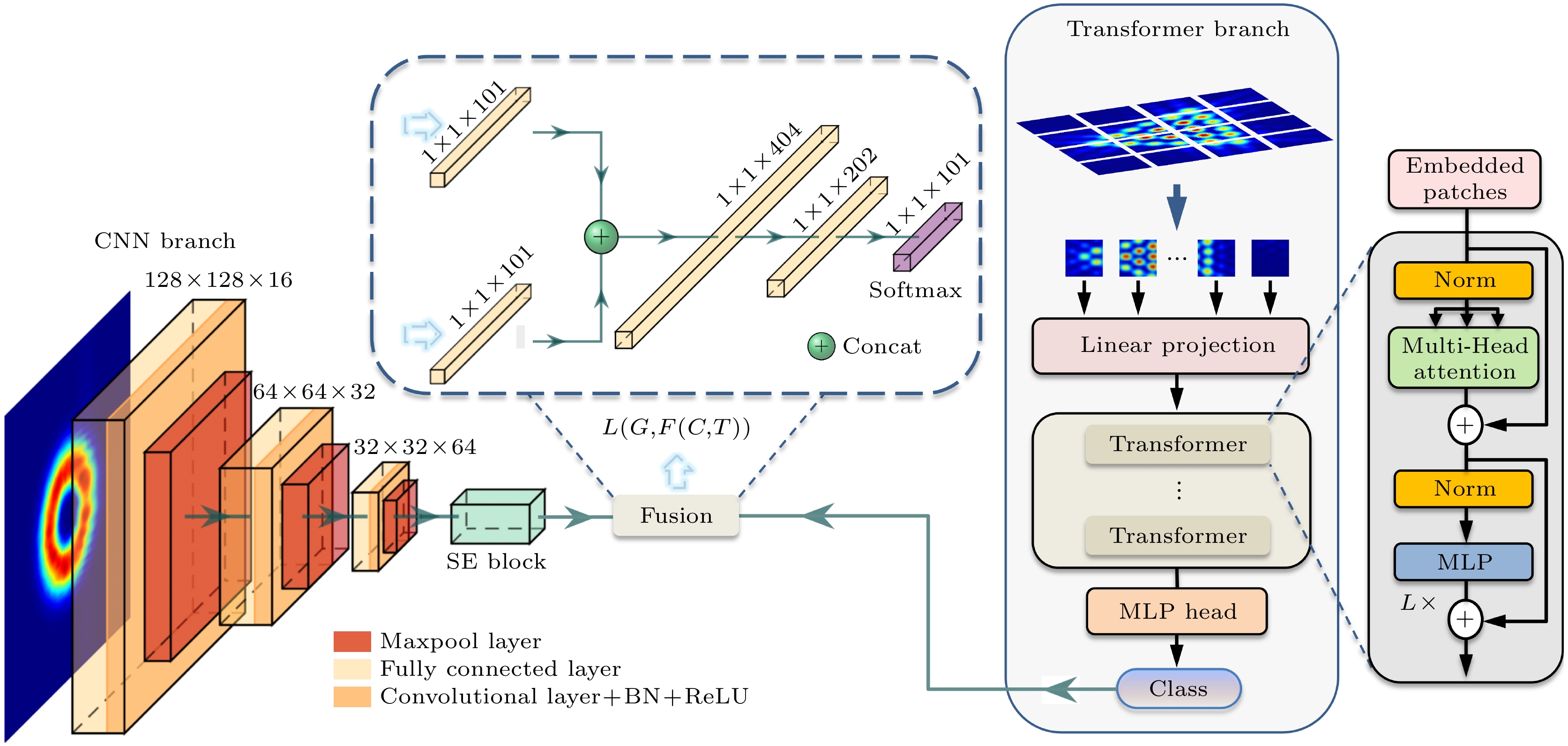 利用分数阶涡旋光束(fractional vortex beams, FVBs)作为信息载体可显著提高通信系统容量, 但由于相邻分数阶轨道角动量(fractional orbital angular momentum, FOAM)模态之间的间隔差异较小, 使得FVBs极易受到大气湍流影响, 因此精确地测量失真的FOAM模态对实际基于FVBs的通信系统而言至关重要. 本文提出了一种基于卷积神经网络-Transformer混合架构的双通道深度学习模型, 通过学习并融合FVBs光强分布与其衍射图样的互补特征信息, 实现对大气湍流环境下FOAM模态的有效识别. 结果表明, 在1000 m传输距离之内, 本文构建模型在弱、中湍流强度下识别101个FOAM模态的准确率可达100%, 强湍流时也能达到98.12%, 并且在未知湍流强度下也表现出良好的泛化能力, 为准确识别FOAM模态提供了一种新方法.Utilizing fractional vortex beams (FVBs) as information carriers can significantly enhance the capacity of communication systems. However, the small gap difference between adjacent fractional orbital angular momentum (FOAM) modes makes FVBs highly sensitive to atmospheric turbulence. Therefore, precise measurement of distorted FOAM modes is crucial for practical FVBs-based communication systems. To fully utilize the beam intensity information and the triangular diffraction pattern information, we propose a dual-channel deep learning model with a hybrid architecture combining convolutional neural network (CNN) and vision transformer (ViT). The beam intensity information is extracted using the CNN, while the diffraction pattern information is extracted using the ViT. Then, by combining the complementary feature information from the intensity distribution of FVBs and their triangular diffraction patterns, this model can effectively identify the FOAM modes. The results show that the proposed model only requires a relatively small number of samples to reach convergence, namely 100 sets of data under weak turbulence and 400 sets of data under strong turbulence. Moreover, within a transmission distance of 1000 m, the proposed model can identify 101 FOAM modes with a mode spacing of 0.1 with an accuracy of 100% under weak and moderate turbulences, and maintains 98.12% accuracy under strong turbulence. Furthermore, the model can expand the detection range of turbulence intensity with only a minimal loss in accuracy, exhibiting strong generalization ability under unknown atmospheric turbulence strengths, thus providing a novel approach for accurately identifying FOAM modes.