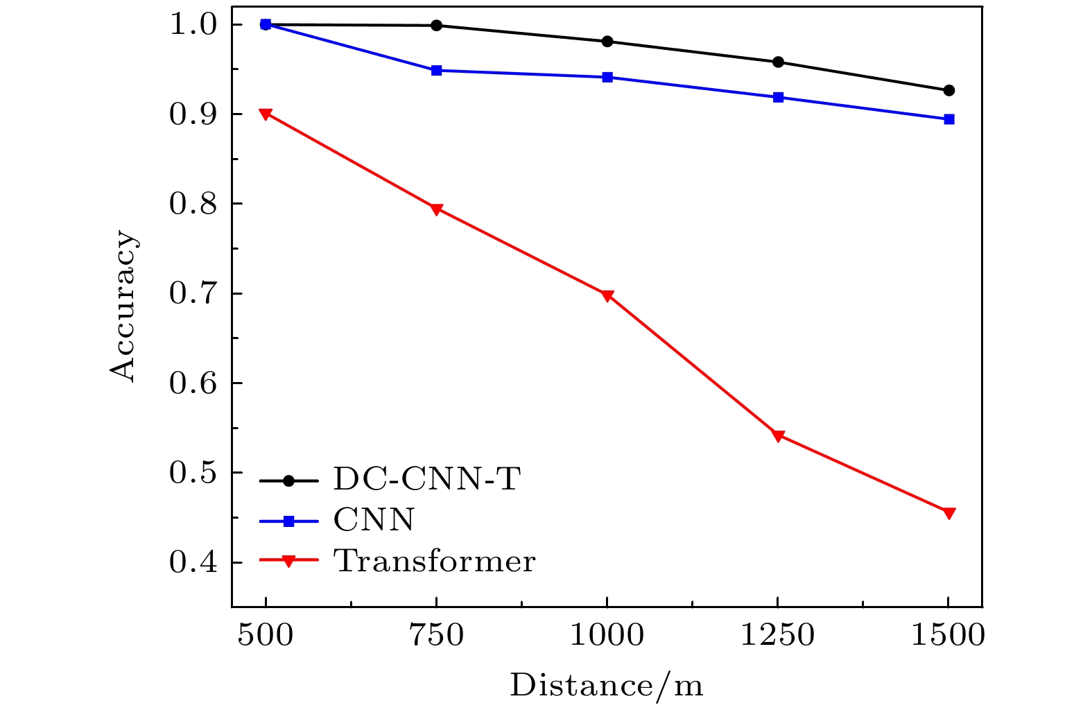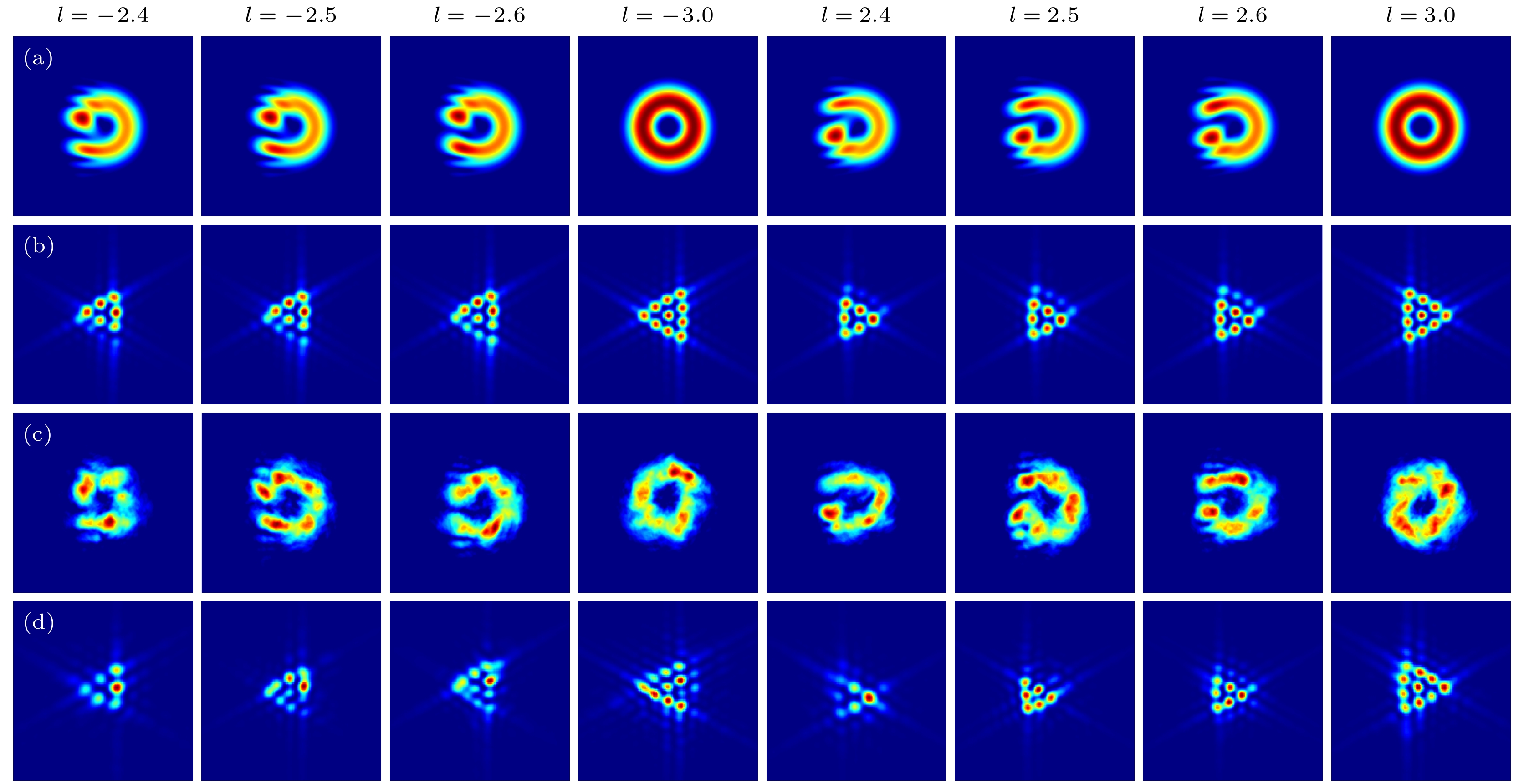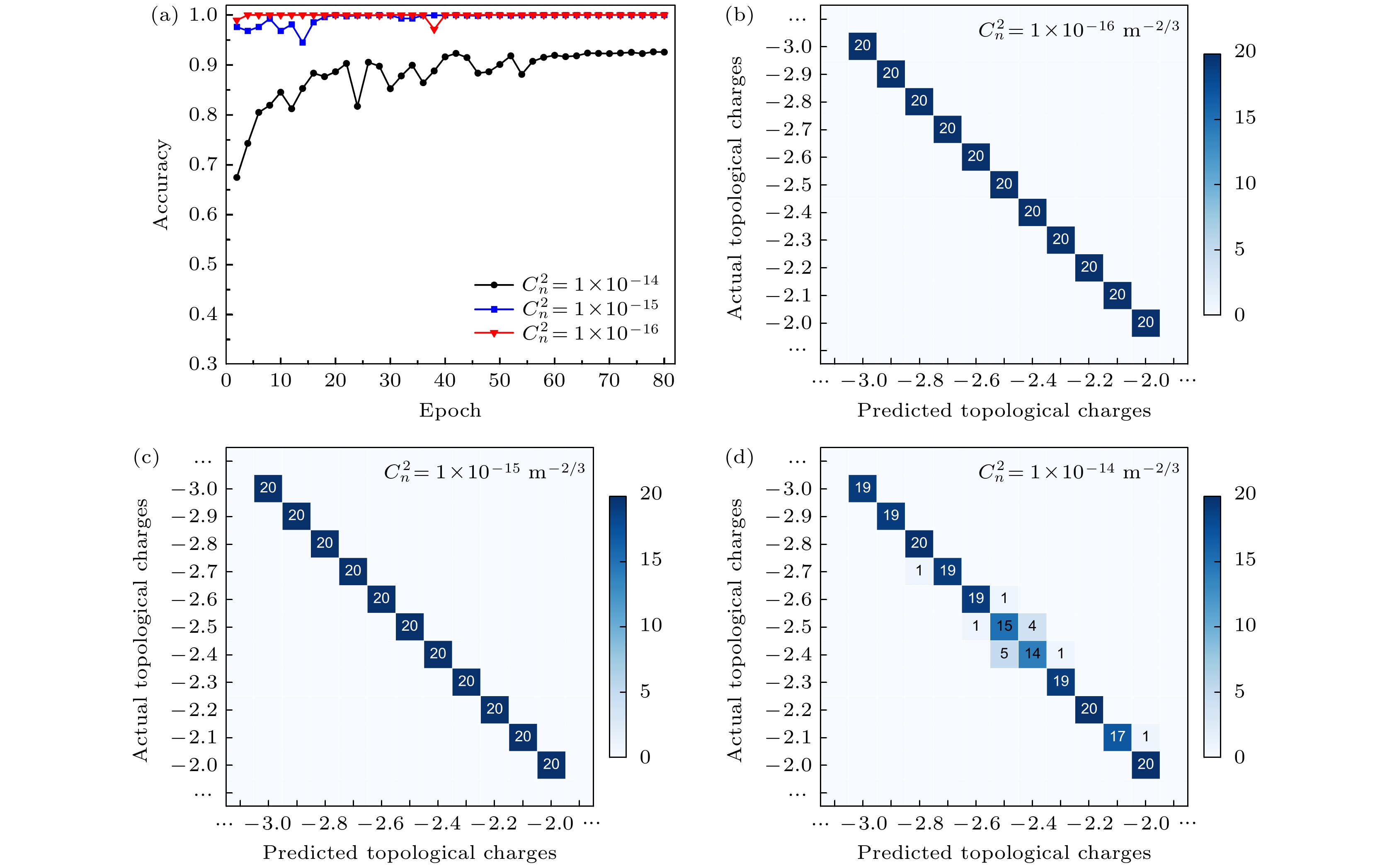 利用分数阶涡旋光束(fractional vortex beams, FVBs)作为信息载体可显著提高通信系统容量, 但由于相邻分数阶轨道角动量(fractional orbital angular momentum, FOAM)模态之间的间隔差异较小, 使得FVBs极易受到大气湍流影响, 因此精确地测量失真的FOAM模态对实际基于FVBs的通信系统而言至关重要. 本文提出了一种基于卷积神经网络-Transformer混合架构的双通道深度学习模型, 通过学习并融合FVBs光强分布与其衍射图样的互补特征信息, 实现对大气湍流环境下FOAM模态的有效识别. 结果表明, 在1000 m传输距离之内, 本文构建模型在弱、中湍流强度下识别101个FOAM模态的准确率可达100%, 强湍流时也能达到98.12%, 并且在未知湍流强度下也表现出良好的泛化能力, 为准确识别FOAM模态提供了一种新方法.Utilizing fractional vortex beams (FVBs) as information carriers can significantly enhance the capacity of communication systems. However, the small gap difference between adjacent fractional orbital angular momentum (FOAM) modes makes FVBs highly sensitive to atmospheric turbulence. Therefore, precise measurement of distorted FOAM modes is crucial for practical FVBs-based communication systems. To fully utilize the beam intensity information and the triangular diffraction pattern information, we propose a dual-channel deep learning model with a hybrid architecture combining convolutional neural network (CNN) and vision transformer (ViT). The beam intensity information is extracted using the CNN, while the diffraction pattern information is extracted using the ViT. Then, by combining the complementary feature information from the intensity distribution of FVBs and their triangular diffraction patterns, this model can effectively identify the FOAM modes. The results show that the proposed model only requires a relatively small number of samples to reach convergence, namely 100 sets of data under weak turbulence and 400 sets of data under strong turbulence. Moreover, within a transmission distance of 1000 m, the proposed model can identify 101 FOAM modes with a mode spacing of 0.1 with an accuracy of 100% under weak and moderate turbulences, and maintains 98.12% accuracy under strong turbulence. Furthermore, the model can expand the detection range of turbulence intensity with only a minimal loss in accuracy, exhibiting strong generalization ability under unknown atmospheric turbulence strengths, thus providing a novel approach for accurately identifying FOAM modes.