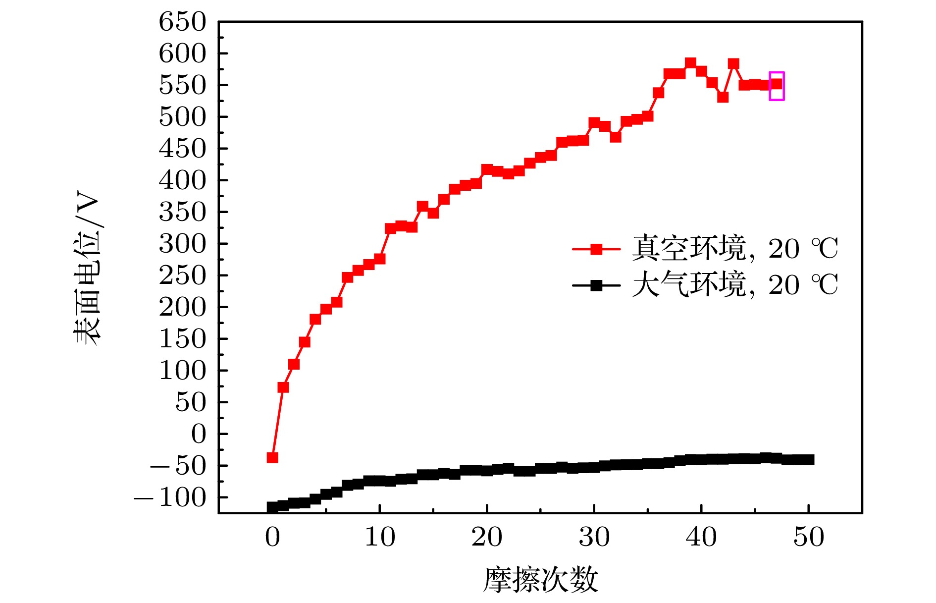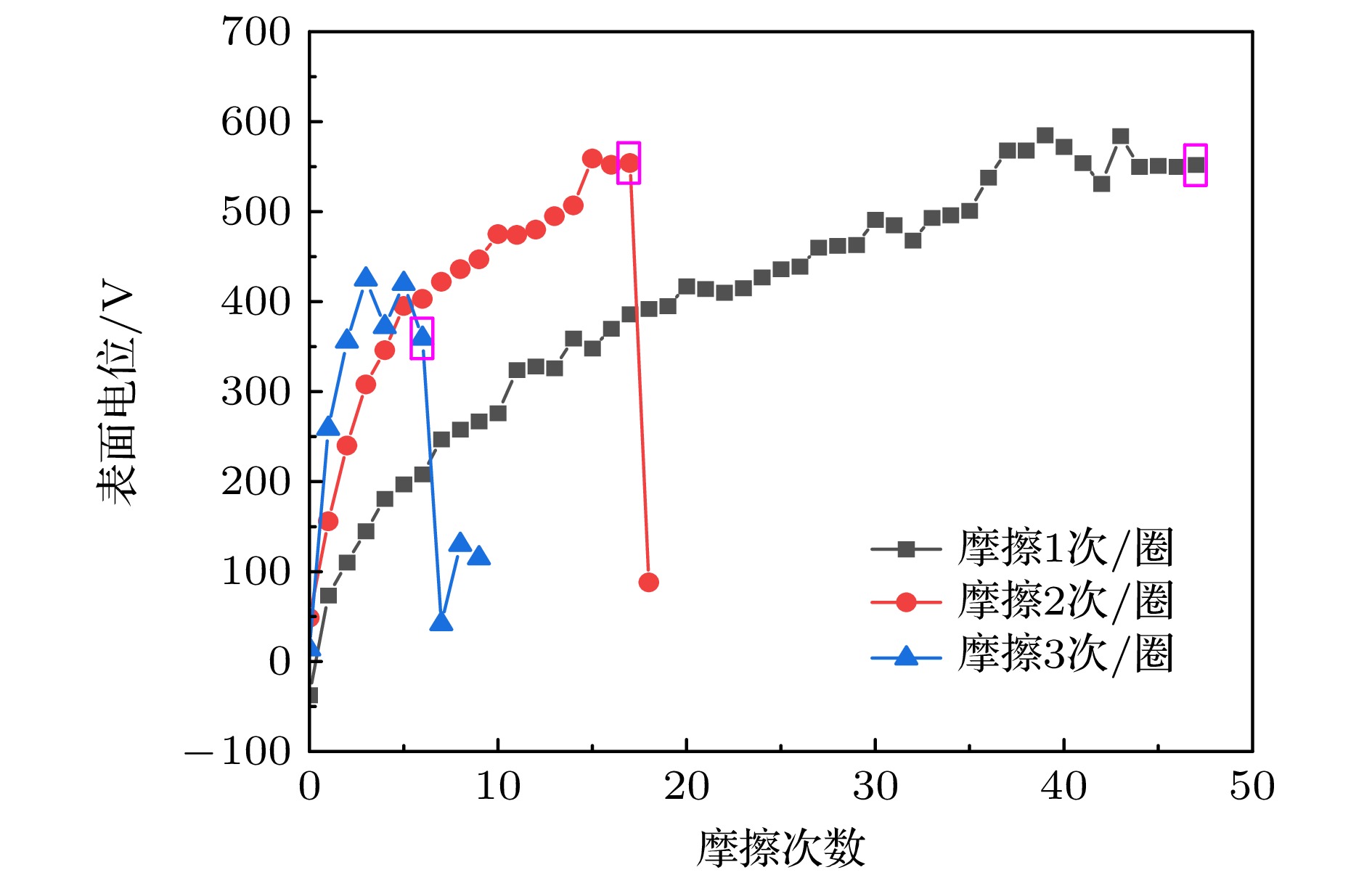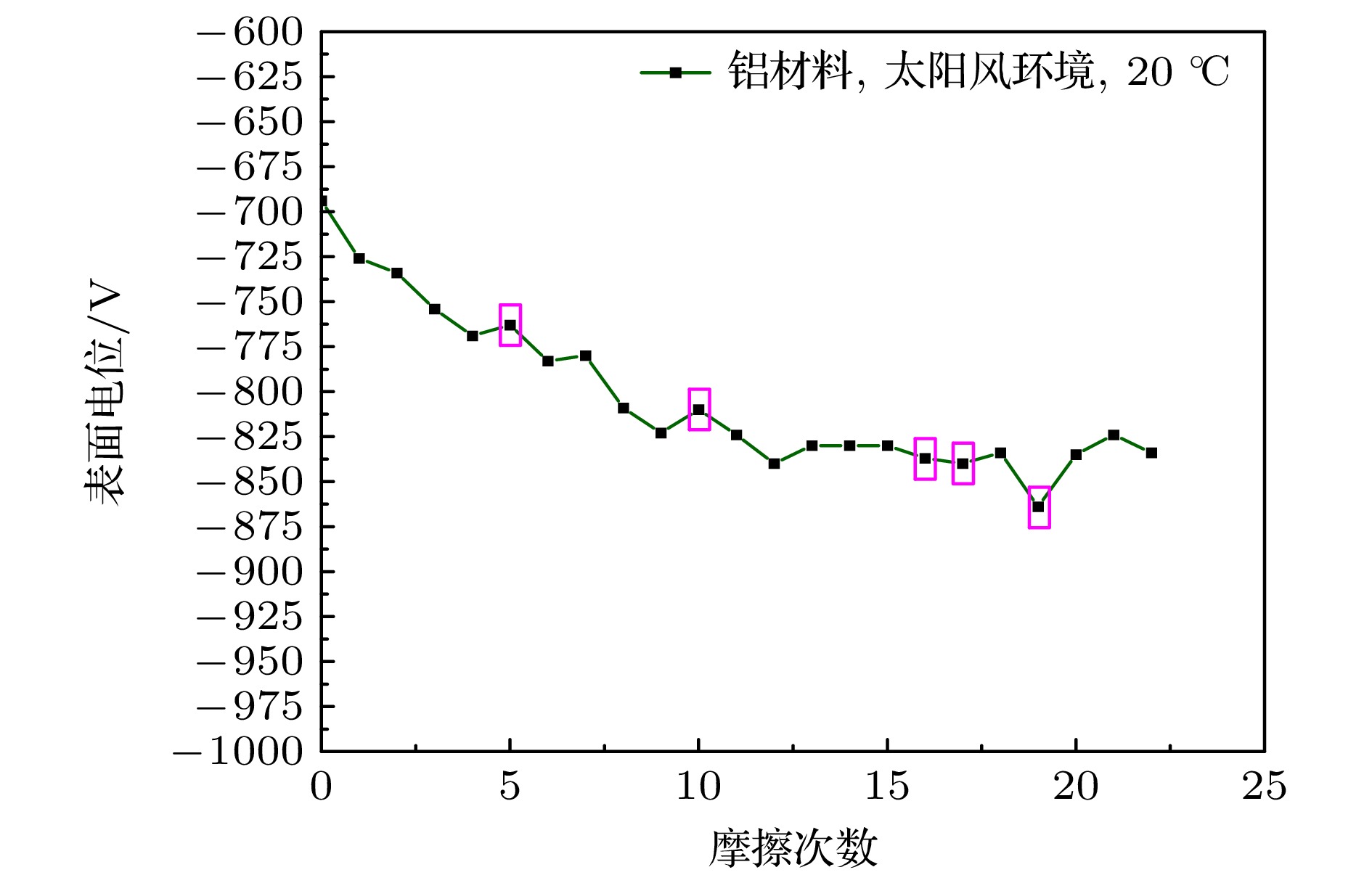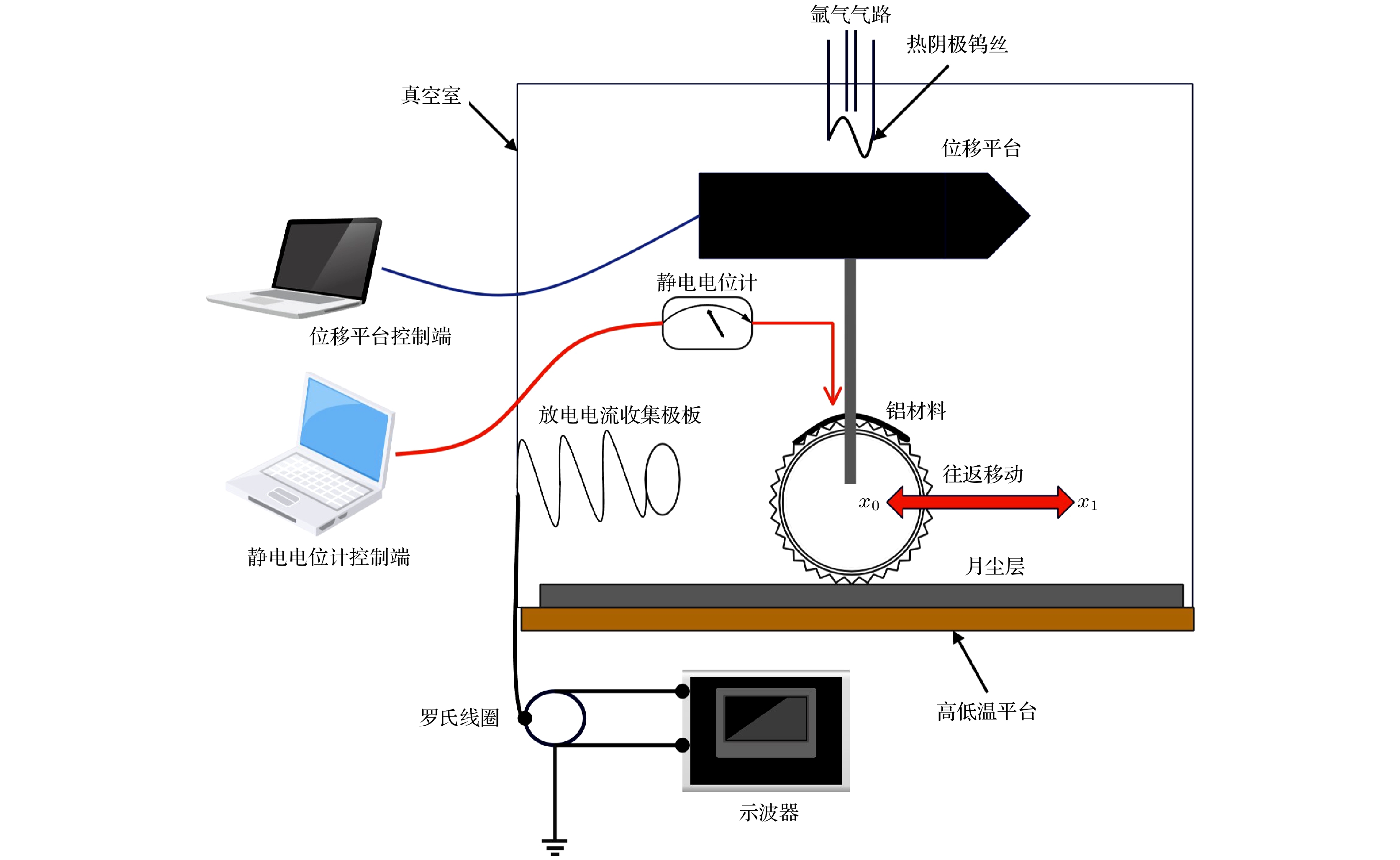 月面任务将面临月球车车轮与月尘摩擦充放电风险, 初步的理论研究表明金属材质的车轮可能会充电至–5000 V量级, 放电脉冲电流可达0.1 A量级, 严重威胁航天员生命安全和器件电路的正常工作. 本文采用地面实验手段研究了真空、太阳风等离子体环境下月球车车轮摩擦充放电风险. 研究结果表明, 真空环境下, 直径为136 mm的铝合金月球车车轮以0.003 m/s在月尘层上行驶时会快速充电至几百伏正电位, 车轮行驶距离至约20 m, 电位为550 V时即发生放电击穿, 此时捕捉到的放电电流脉冲幅值可达1.5 A, 脉冲持续时间约100 ns; 增加摩擦频率充电速率明显增加, 放电更频繁地发生; 在模拟的太阳风等离子体环境下, 车轮以0.003 m/s行驶时环境和摩擦共同作用使充电电位为负, 平衡后电位约–830 V, 且放电更加频繁, 行驶至8.5 m时即发生放电击穿, 放电电流脉冲幅值可达0.3 A, 脉冲持续时间100 ns. 该放电脉冲对线性电路造成了电磁干扰, 导致信号的异常输出. 本研究表明月球车摩擦充放电风险较高, 需在后续工程任务中关注并进一步评估其危害程度.