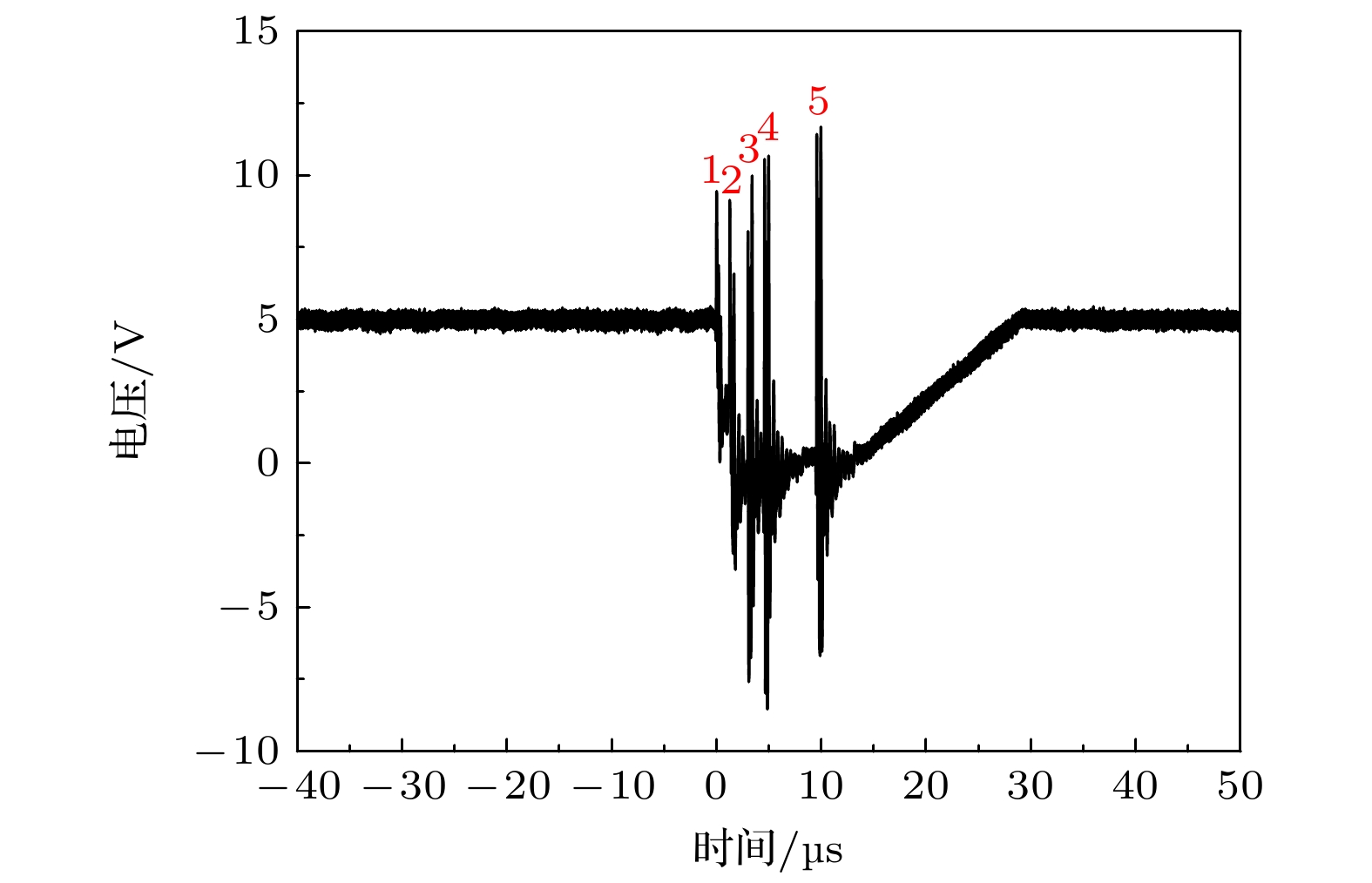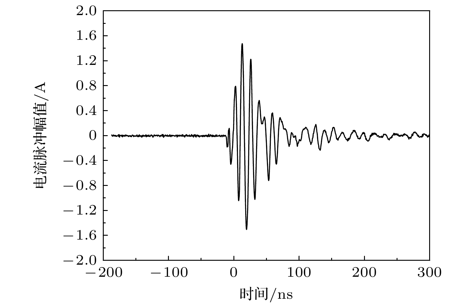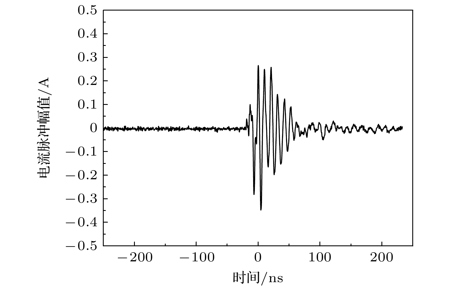 Fig. 6. Triboelectric discharge pulse current waveform of aluminum material rubbed against lunar dust under solar wind environment (6×10–3 Pa, 20 ℃; electron density ~108 cm–3, electron energy ~4 eV, ion energy ~1 eV).