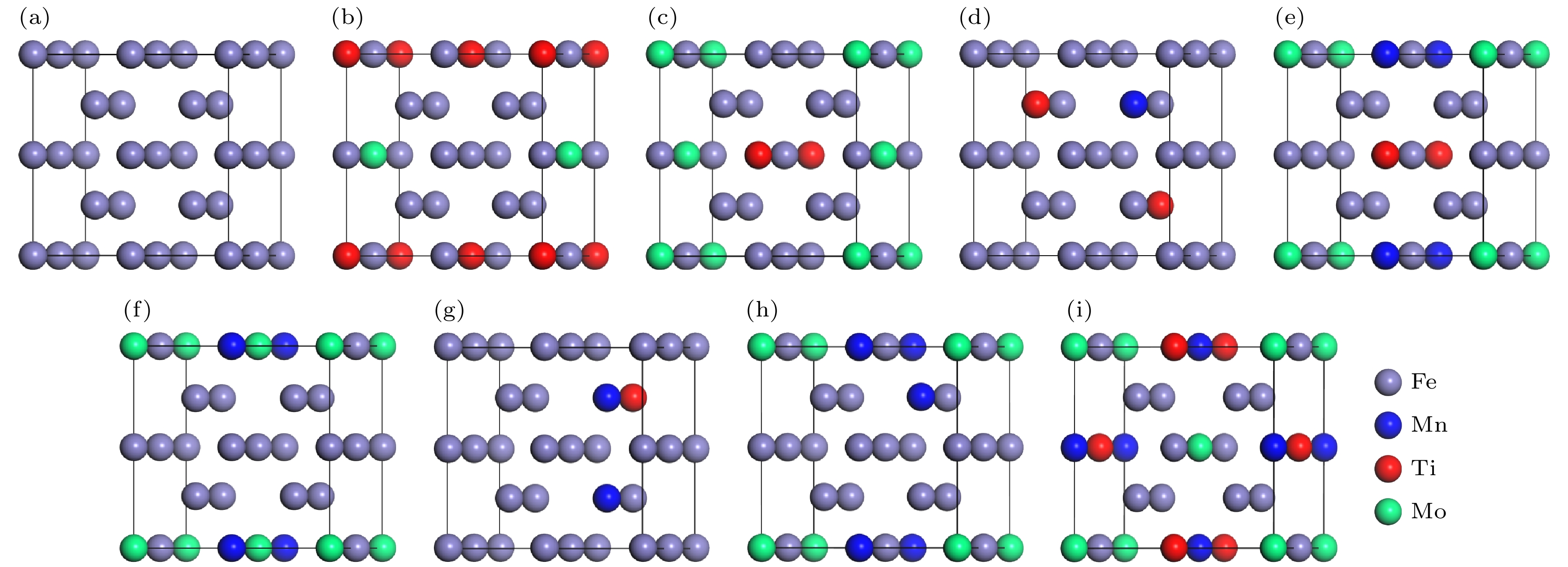 图 1 Fe16–x –y –zMnxTiyMoz超胞模型 (a) Fe16; (b) Fe13Ti2Mo1; (c) Fe13Ti1Mo2; (d) Fe13Mn1Ti2; (e) Fe13Mn1Ti1Mo1; (f) Fe13Mn1Mo2; (g) Fe13Mn2Ti1; (h) Fe13Mn2Mo1; (i) Fe10Mn2Ti2Mo2