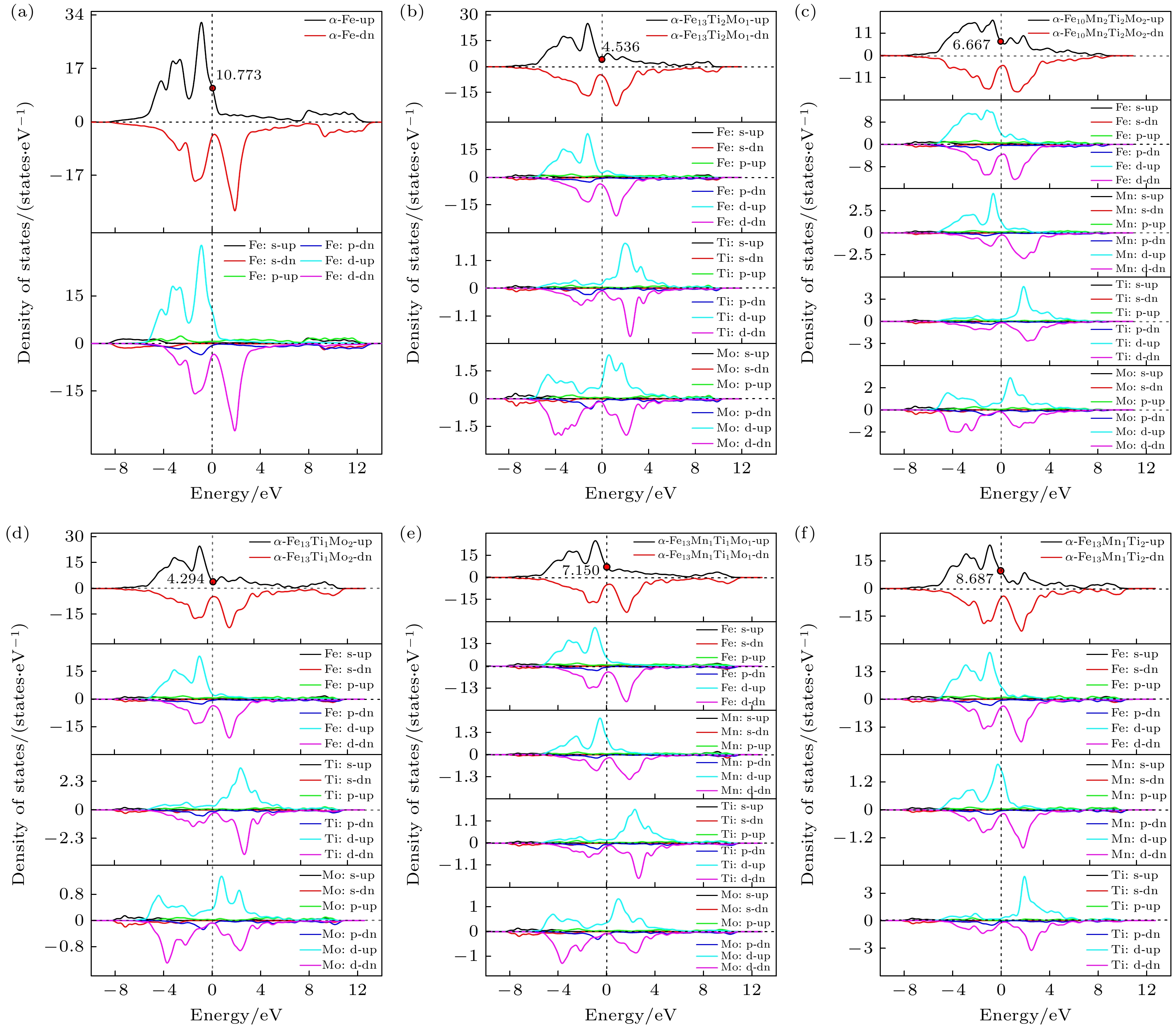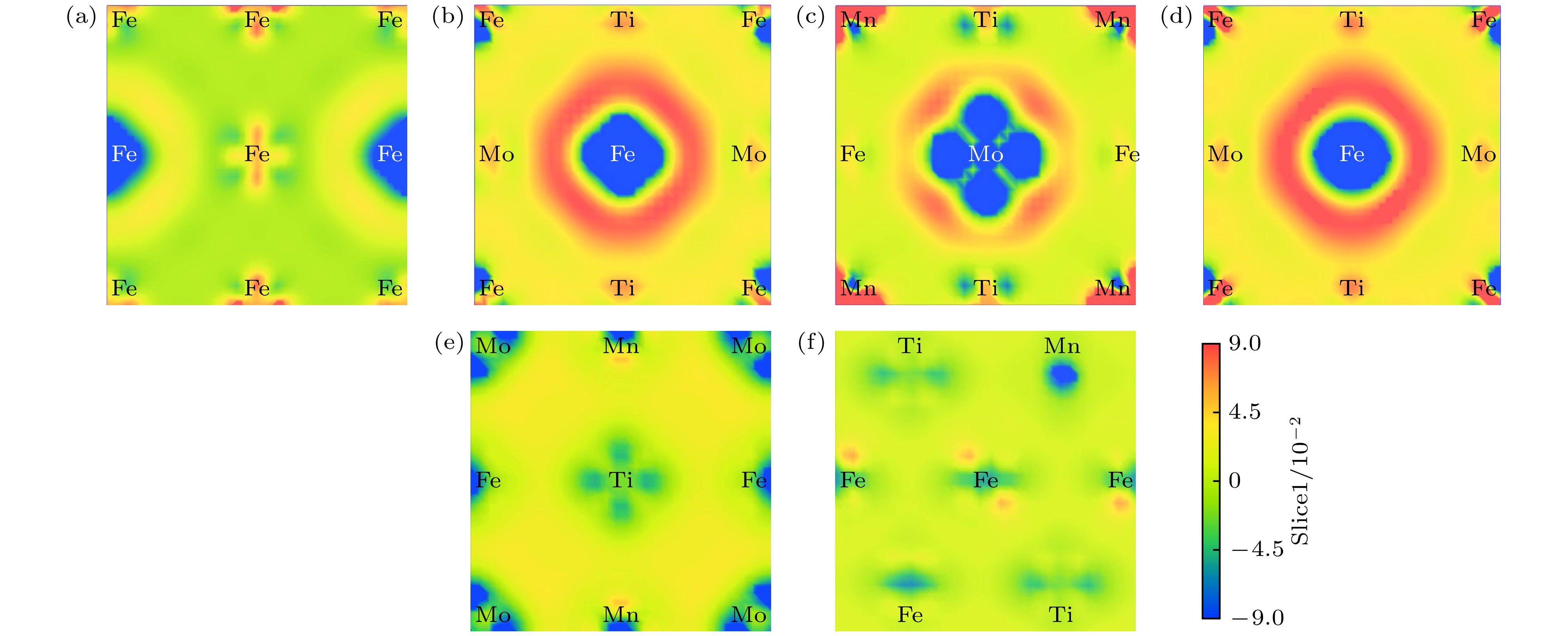 超胞 元素M原子百分比/% Mn Ti Mo Fe16 0 0 0 Fe13Ti2Mo1 0 12.5 6.25 Fe13Ti1Mo2 0 6.25 12.5 Fe13Mn1Ti2 6.25 12.5 0 Fe13Mn1Ti1Mo1 6.25 6.25 6.25 Fe13Mn1Mo2 6.25 0 12.5 Fe13Mn2Ti1 12.5 6.25 0 Fe13Mn2Mo1 12.5 0 6.25 Fe10Mn2Ti2Mo2 12.5 12.5 12.5 表 2 Fe16–x –y –zMnxTiyMoz的ε, Hform和Ecoh的计算值