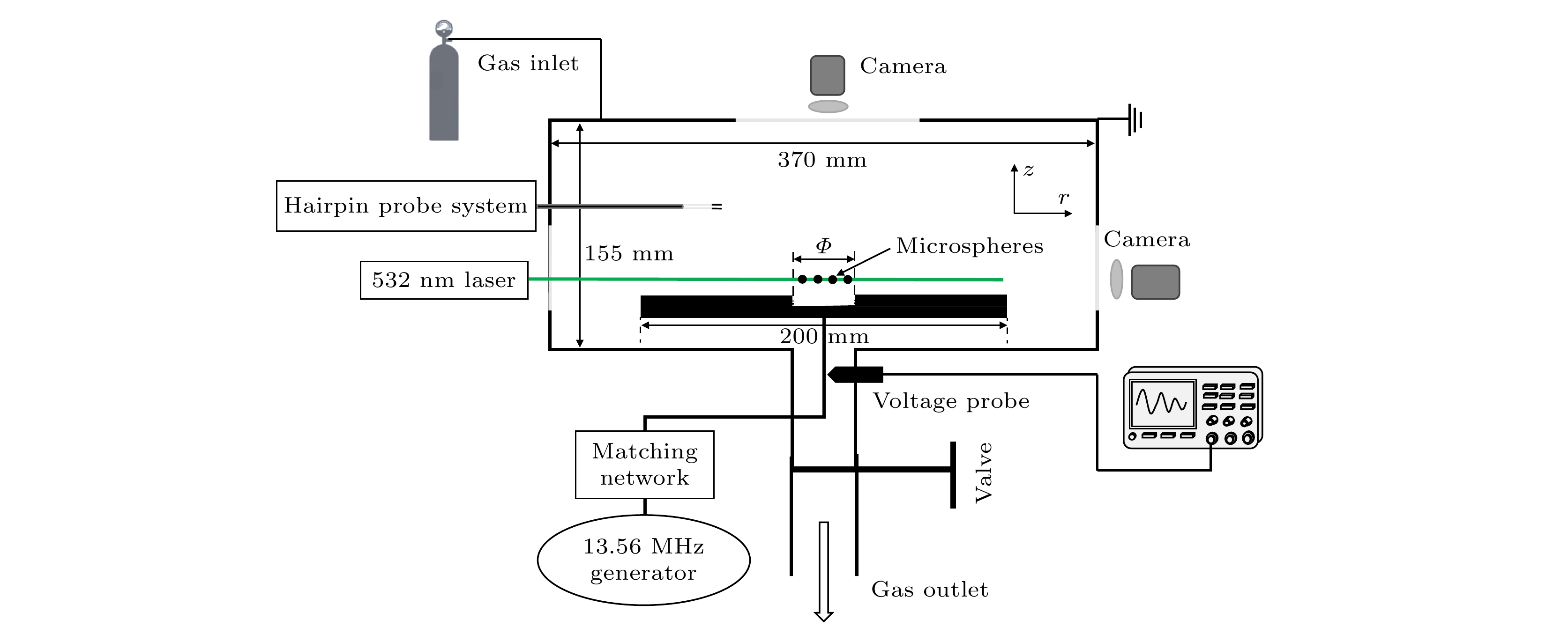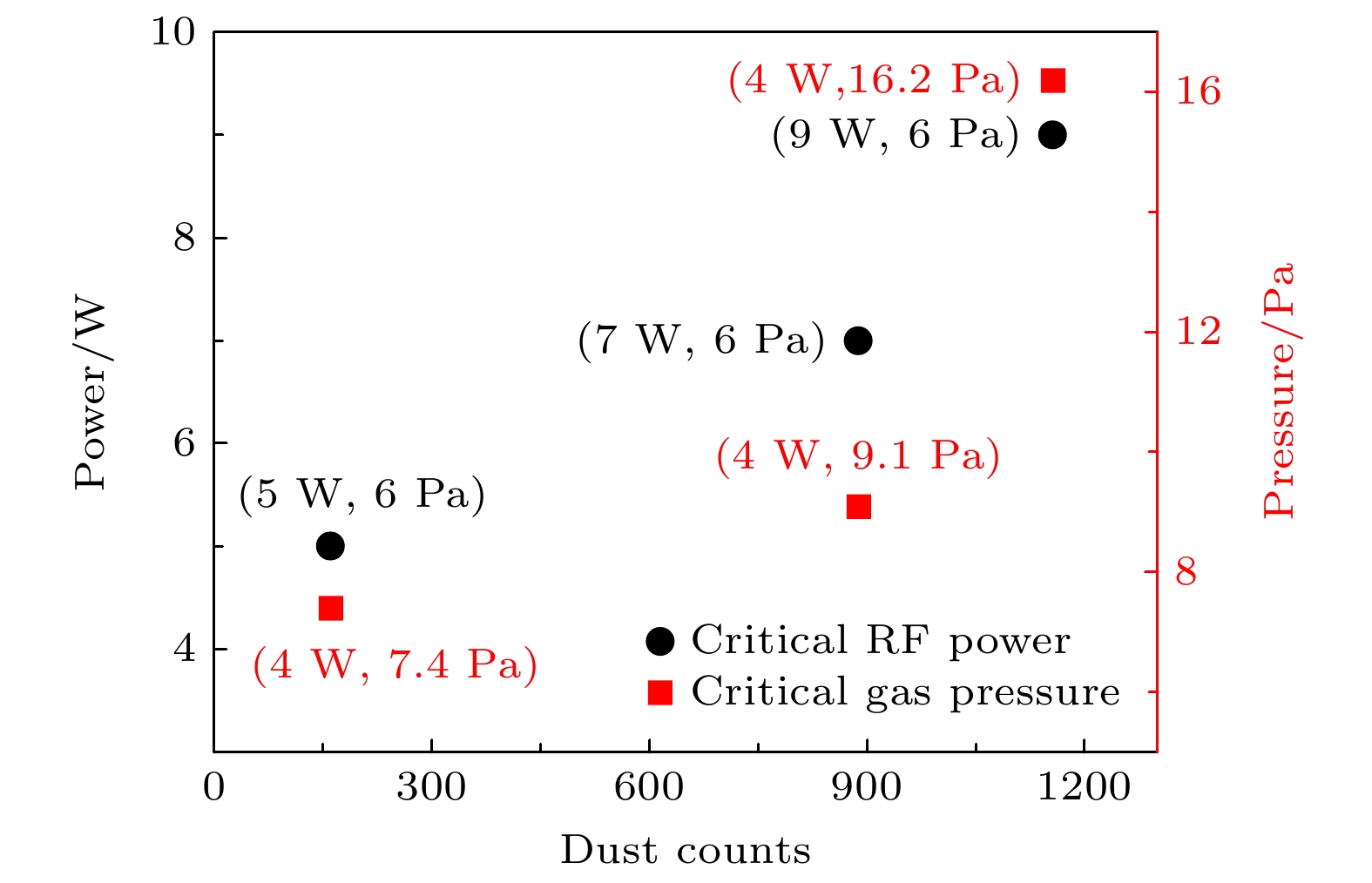 在射频容性耦合尘埃等离子体放电中, 下极板凹槽通过影响鞘层里的电势分布, 进而对尘埃颗粒的集体行为产生显著影响. 实验中通过在腔室内撒入微米级直径的尘埃颗粒, 观察到其在下电极凹槽势阱上方分层出现, 整体呈“碗状”云分布. 尘埃云的体积大小随射频功率和放电气压的变化而变化. 尘埃空洞在每层尘埃颗粒的中心出现, 其直径大小和变化受尘埃颗粒数量、射频功率和放电气压影响. 此外, 基于流体模型和尘埃粒子模型建立混合模型, 模拟发现尘埃颗粒的集体行为主要由其所受的轴向合力(考虑轴向电场力、离子拖拽力和重力)和径向合力(考虑径向电场力和离子拖拽力)决定. 实验发现, 通过在射频电极施加负直流偏压, 尘埃颗粒悬浮高度先增大后减小, 悬浮高度的变化能够较直观地反映等离子体放电从α-γ模式的转变.
