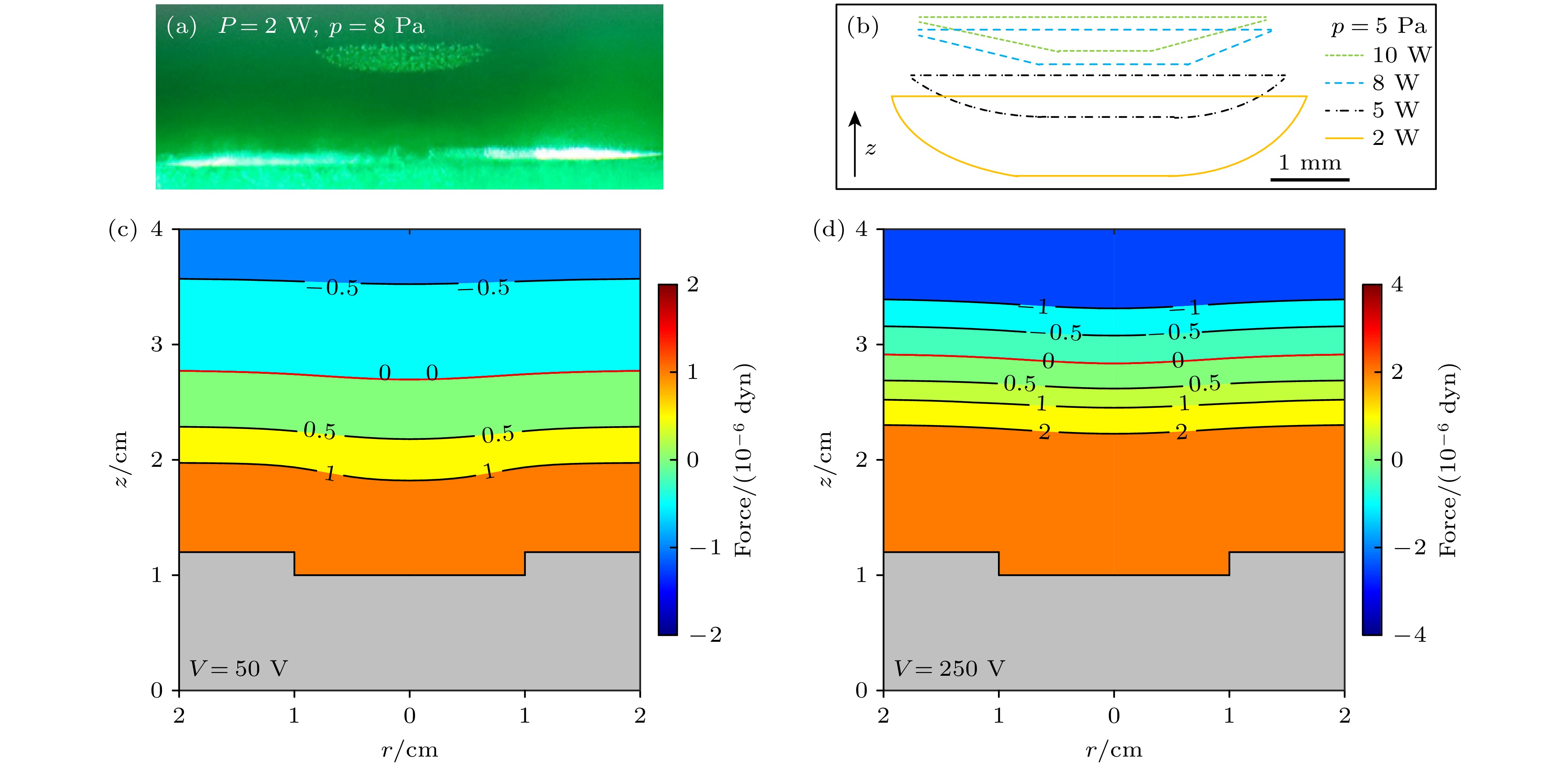 图 2 (a) 射频功率2 W, 放电气压8 Pa时, 高清相机拍摄的尘埃颗粒空间分布侧视图; (b) 气压5 Pa, 功率由2 W增至10 W时, 侧面观察尘埃颗粒空间分布轮廓图; (c), (d) 气压5 Pa, 射频电压分别为50 V和250 V时(对应实验中的射频功率增大), 模拟得到的尘埃颗粒所受轴向合力图(考虑重力、电场力以及离子拖拽力), 图中粗红线代表尘埃颗粒轴向合力为0的位置. 凹槽直径${\boldsymbol{\phi}} $ = 20 mm, 1 dyn = 10–5 N