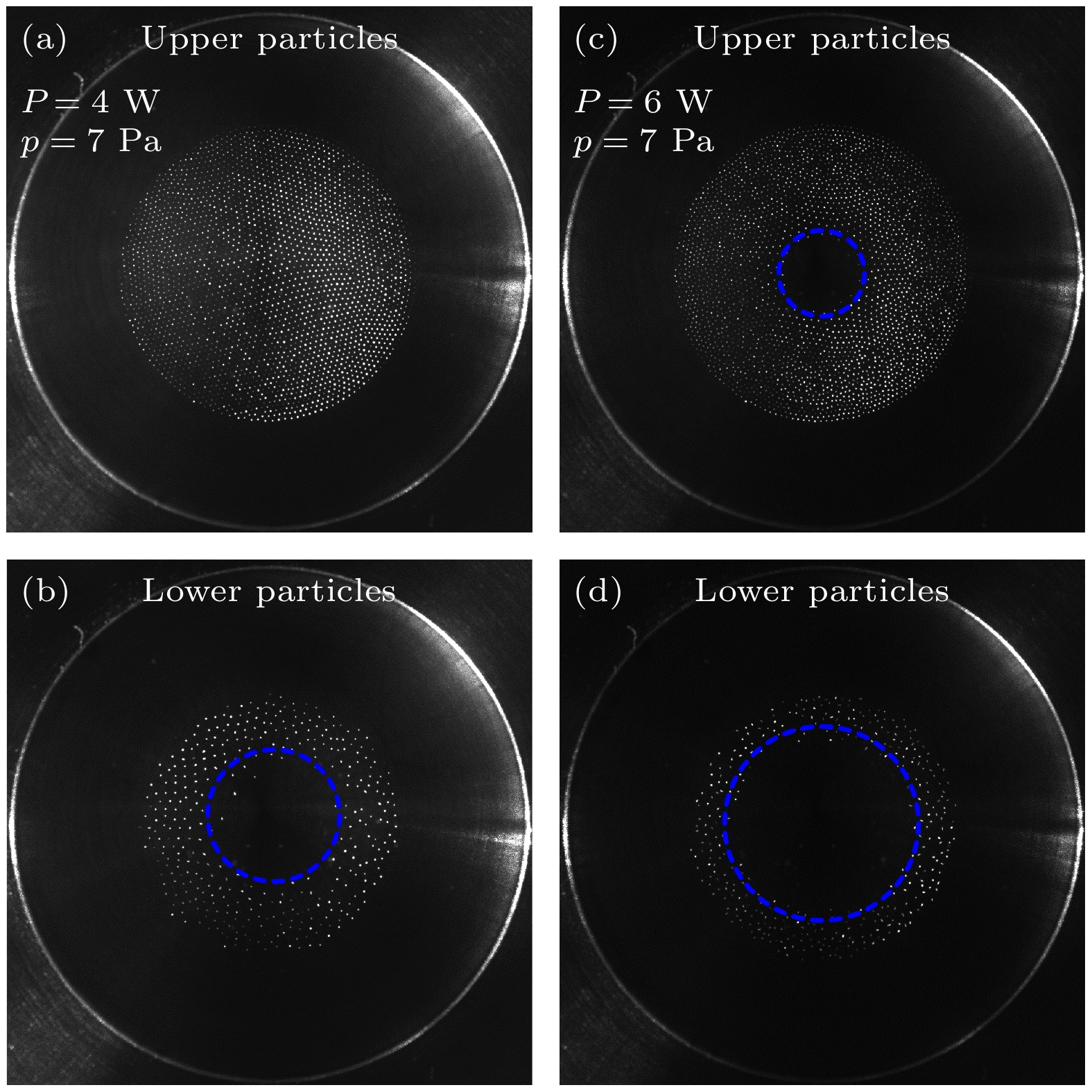 Fig. 4. Void formations in the uppermost and lowermost dust particle layers are experimentally observed via a high-resolution camera under RF powers of 4 W and 6 W, at 7 Pa. The groove diameter is ${\boldsymbol{\phi}} $ = 40 mm.