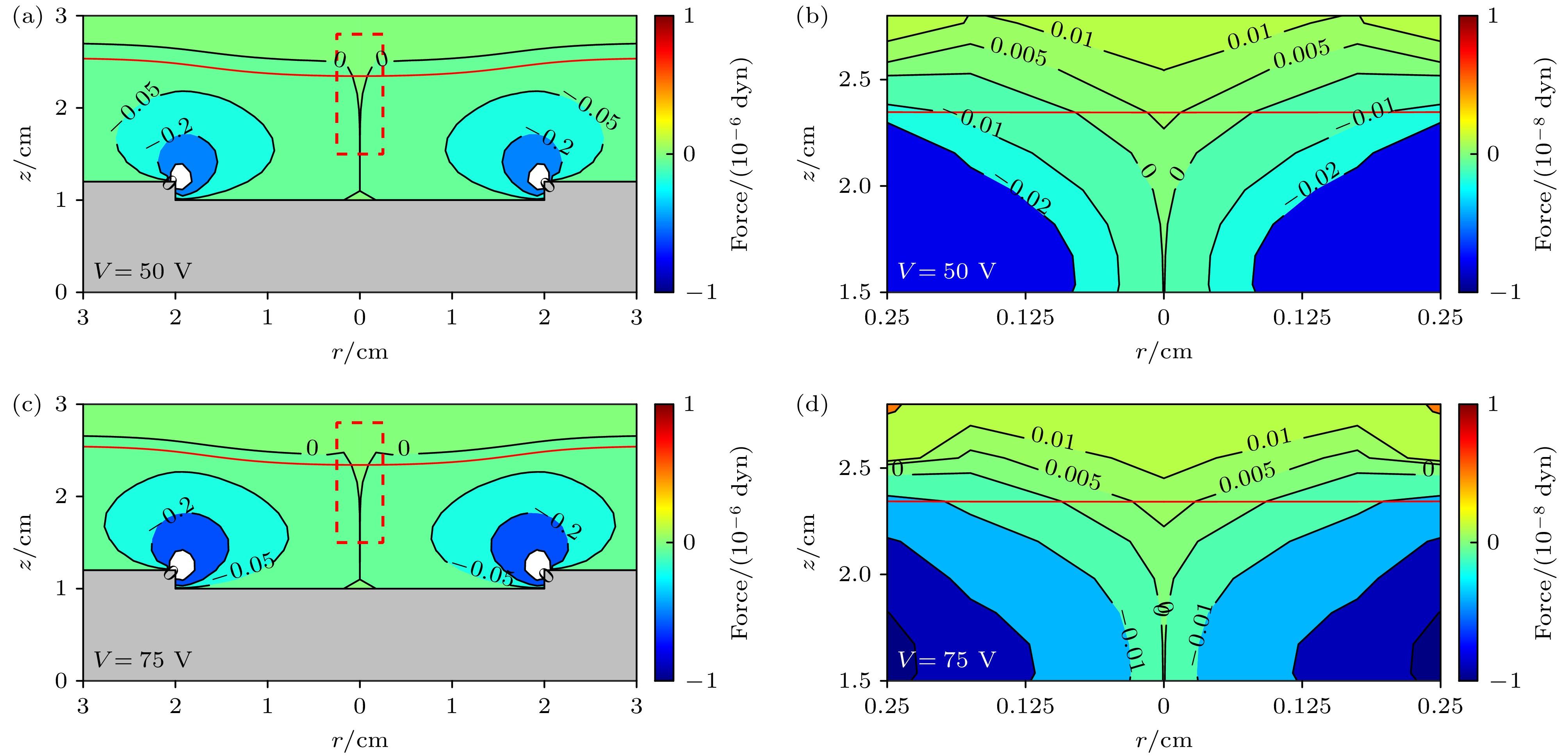 图 6 气压7 Pa, 射频电压分别为(a) 50 V和(c) 75 V(对应实验射频功率4 W和6 W)时, 采用流体模拟得到的尘埃颗粒径向合力图; (b), (d)分别对应为(a), (c)红虚线区域内放大后的局部图. 凹槽直径${\boldsymbol{\phi}} $ = 40 mm