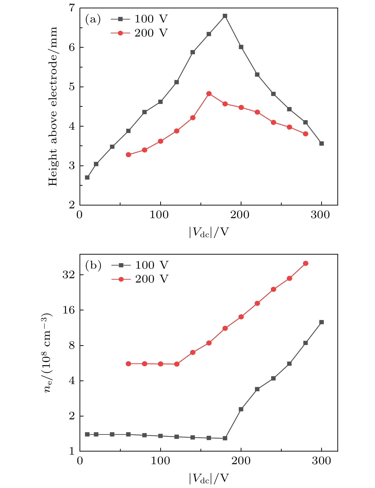 Fig. 8. (a) Height of dust particles above the lower electrode and (b) the electron density at the chamber center as a functions of the DC $ \left| {{V_{{\text{dc}}}}} \right| $ under 100 V and 200 V, at fixed 60 Pa.
