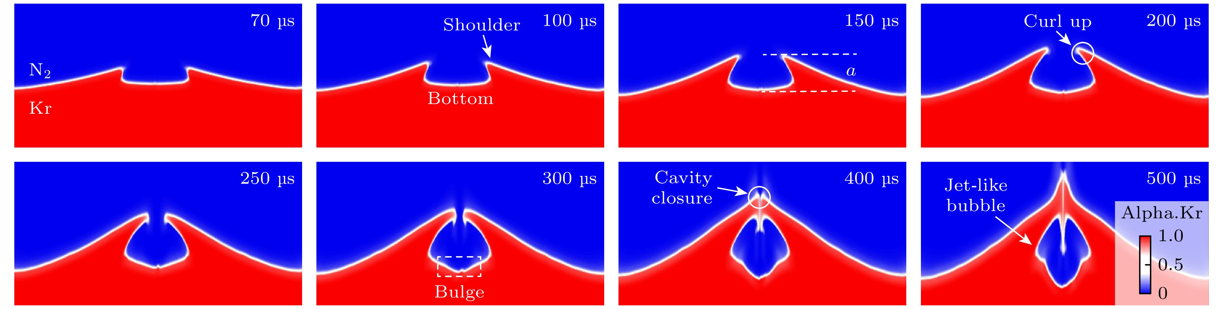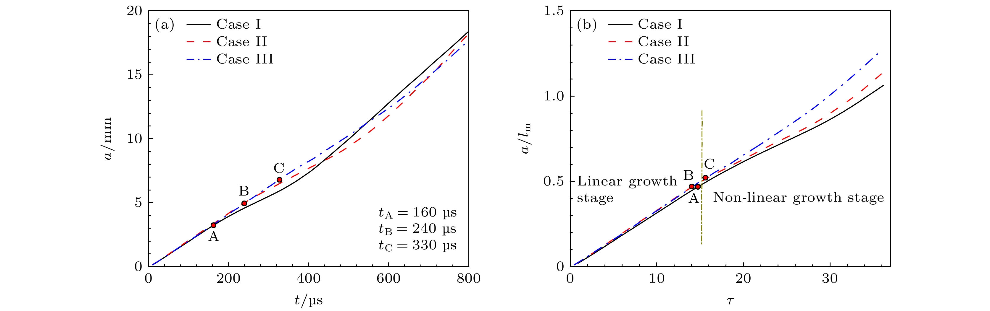 针对实际应用中由非均匀激波驱动的界面失稳问题, 开展了马赫反射波系与平面气体界面相互作用的机理研究, 重点探讨了马赫杆尺度效应对界面失稳演化和扰动增长的影响. 结果表明, 马赫反射波系冲击界面时, 通过复杂波系作用在界面上印刻速度扰动, 诱发了界面失稳. 随后, 在波后流场非均匀性的影响下, 界面进一步演化形成凹腔和“射流状气泡”结构, 显著区别于经典Richtmyer-Meshkov不稳定性中的尖钉与气泡. 扰动振幅的定量分析表明, 界面失稳演化可分为初期线性增长和后期非线性发展两个阶段. 其中, 滑移线弯曲和卷曲射流驱动的界面变形, 是界面演化向非线性阶段转变的关键物理机制. 马赫杆尺度决定了滑移线卷曲和射流形成的特征时间. 在线性阶段, 扰动增长由马赫反射波系的激波强度和入射角度主导, 与马赫杆尺度无关; 而在非线性阶段, 界面扰动增长率随着马赫杆尺度的增大而增大. 基于数值模拟结果对理论模型进行了考察, 结果表明, 现有理论模型可有效地预测马赫反射波系印刻的界面速度扰动, 但无法考虑马赫杆尺度效应和波后非均匀流场的影响. 本研究揭示了界面失稳演化与马赫反射波系激波强度、入射角度及马赫杆尺度之间的内在关系, 对界面扰动增长理论模型的建立具有重要意义.